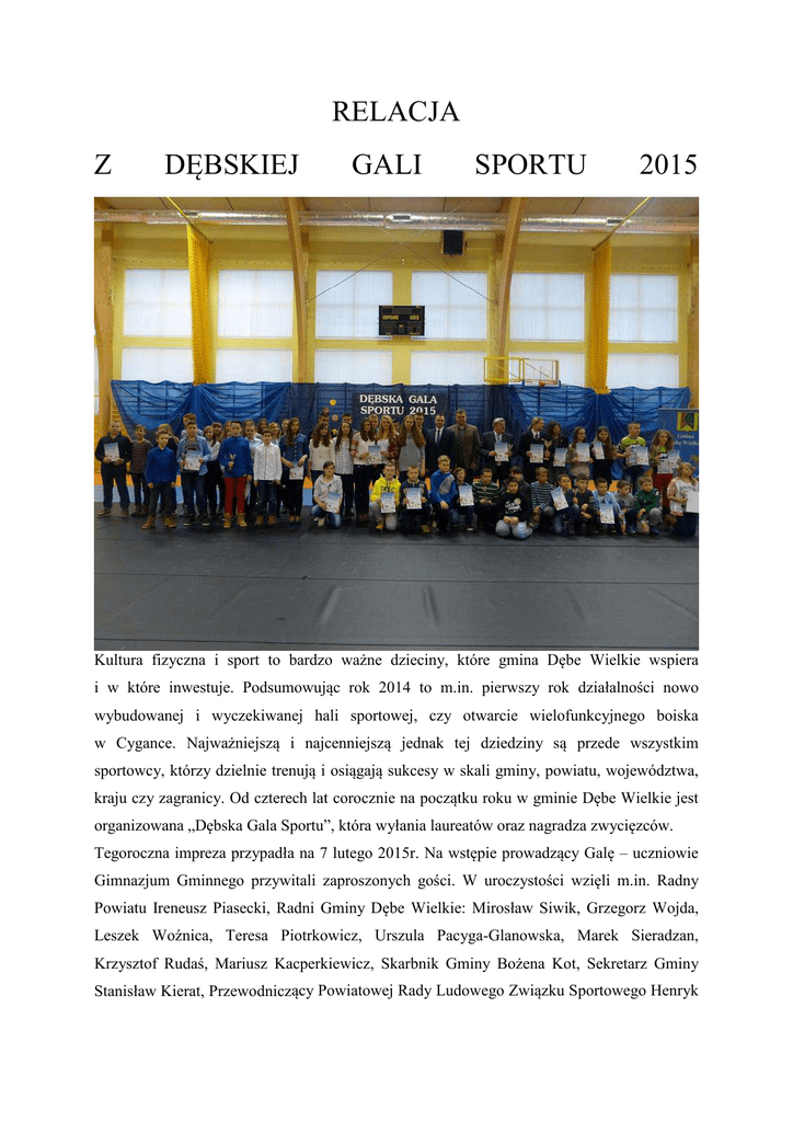 RELACJA Z DĘBSKIEJ GALI SPORTU 2015 Kultura fizyczna i sport to bardzo ważne dzieciny, które gmina Dębe Wielkie wspiera i w które inwestuje. Podsumowując rok 2014 to m.in. pierwszy rok działalności nowo wybudowanej i wyczekiwanej hali sportowej, czy otwarcie wielofunkcyjnego boiska w Cygance. Najważniejszą i najcenniejszą jednak tej dziedziny są przede wszystkim sportowcy, którzy dzielnie trenują i osiągają sukcesy w skali gminy, powiatu, województwa, kraju czy zagranicy. Od czterech lat corocznie na początku roku w gminie Dębe Wielkie jest organizowana „Dębska Gala Sportu”, która wyłania laureatów oraz nagradza zwycięzców. Tegoroczna impreza przypadła na 7 lutego 2015r. Na wstępie prowadzący Galę – uczniowie Gimnazjum Gminnego przywitali zaproszonych gości. W uroczystości wzięli m.in. Radny Powiatu Ireneusz Piasecki, Radni Gminy Dębe Wielkie: Mirosław Siwik, Grzegorz Wojda, Leszek Woźnica, Teresa Piotrkowicz, Urszula Pacyga-Glanowska, Marek Sieradzan, Krzysztof Rudaś, Mariusz Kacperkiewicz, Skarbnik Gminy Bożena Kot, Sekretarz Gminy Stanisław Kierat, Przewodniczący Powiatowej Rady Ludowego Związku Sportowego Henryk Smuga, Przewodniczący Powiatowego Szkolnego Związku Sportowego w Mińsku Mazowieckim Józef Tkaczyk, Dyrektor Szkoły Podstawowej w Rudzie Małgorzata Rudnik, Wicedyrektor Gimnazjum Gminnego Olga Laskowska, Wicedyrektor Szkoły Podstawowej w Dębem Wielkim Agnieszka Wojda, Dyrektor Oddziału Banku Spółdzielczego w Dębem Wielkim Bożena Adamiec, Prezes Akademii Sztuk Walki Dawid Matwiej, Prezes Klubu Kolarskiego V-MAX Jacek Tomkiewicz, sołtysi , dziennikarze lokalnej prasy i mediów oraz liczni mieszkańcy. Oficjalnego otwarcia Gali Sportu 2015 dokonał osobiście Wójt Gminy Dębe Wielkie Krzysztof Kalinowski, który podsumował rok 2014 oraz zdradził kolejne plany inwestycyjne. Następnie przyszła kolej na uroczyste wręczenie nagród przez Przewodniczącego Kapituły Konkursowej Leszka Woźnicę oraz Wójta Gminy Krzysztofa Kalinowskiego. W poszczególnych kategoriach statuetki otrzymali: - W kategorii Najlepszy Sportowiec – szkoły podstawowe: * Nagroda I stopnia – Michał Szczygielski – Szkoła Podstawowa w Dębem Wielkim * Nagroda II stopnia – Mateusz Piotrkowicz – Szkoła Podstawowa w Dębem Wielkim * Nagroda III stopnia – Natalia Sasin – Szkoła Podstawowa w Rudzie W Kategorii Najlepiej Rokujący Zawodnik – szkoły podstawowe: *Mateusz Krawczyk – Szkoła Podstawowa w Dębem Wielkim W Kategorii Najlepsza Drużyna – szkoły podstawowe: • Nagroda I stopnia – drużyna Cheerleaderek ze Szkoły Podstawowej w Dębem Wielkim w składzie: Maria Brzózka, Daria Bielińska, Julia Kalinowska, Kalina Kotomska, Kinga Królikowska, Natalia Lesińska, Ewelina Nowak, Patrycja Sulejewska, Aleksandra Szatańska, Justyna Zawada, Oliwia Woźnica, Małgorzata Nieborek, Karolina Wawer, Natalia Przybysz, Patrycja Szczepanik, Nina Wieczorek, Aleksandra Przybysz • Nagroda II stopnia – drużyna piłki nożnej i piłki ręcznej chłopców ze Szkoły Podstawowej w Dębem Wielkim w składzie: Michał Szczygielski, Jakub Piotrkowicz, Patryk Rygalski, Dominik Opejda, Marcin Czerederecki, Szymon Pietrzak, Krystian Czerwiński, Krzysztof Pasik, Adam Piekut, Kacper Zagórski, Maksymilian Lisiecki, Mateusz Piotrkowicz, Antoni Tkaczyk, Mateusz Krawczyk • Nagroda III stopnia - ex aequo – drużyna piłki nożnej ze Szkoły Podstawowej w Rudzie (młodsza) w składzie: Patryk Siporski, Bartłomiej Pękacki, Maciej Jagliński, Jan Wieczorek, Artur Szopa, Wiktor Wilczyński oraz drużyna piłki nożnej ze Szkoły Podstawowej w Rudzie (strasza) w składzie: Sebastian Górecki, Kacper Konowrocki, Sebastian Linde, Wojciech Marzec, Igor Porębski, Patryk Przybylski, Bartosz Rabczewski - w kategorii Najlepszy sportowiec – Gimnazjum Gminne: * Jarosław Pasik - w kategorii Najlepiej Rokujący Zawodnik – Gimnazjum Gminne: * Aleksandra Sasin - w kategorii Najlepsza Drużyna – Gimnazjum Gminne: * Drużyna Piłki nożnej chłopców w składzie: Jarosław Pasik, Michał Malesa, Karol Zbrożek, Daniel Zdun, Oskar Wojdyga, Bartek Woś, Bartek Siwiec, Radek Tkaczyk, Michał Chrzanowski - w Kategorii Najlepszy Sportowiec – open: * Nagroda I stopnia – Jakub Soszka z Klubu Kolarskiego V-MAX * Nagroda II stopnia – Monika Wtulich z Akademii Sztuk Walki * Nagroda III stopnia – Katarzyna Mazurowska z Akademii Sztuk Walki - w Kategorii Najlepiej Rokujący Zawodnik – open: * Ewelina Nowak z Klubu Kolarskiego V-MAX - w kategorii Najlepsza Drużyna – open: * Drużyna Piłki nożnej Gminno Ludowo Uczniowskiego Klubu Sportowego „Płomień” w skałdzie: Daniel Głuchowski, Łukasz Kielak,Mateusz Wojda, Mateusz Malesa, Radosław Malesa, Kamil Dróżd, Bartek Niemczyk, Mateusz Cacko, Arkadiusz Mróz, Mateusz Król, Mateusz Kowalczyk, Maciej Czerwiński, Kamil Konowrocki, Paweł Kowalski Piotr Rogala, Grzegorz Siporski - w kategorii Najlepszy Nauczyciel Wychowania Fizycznego * Józef Tkaczyk – nauczyciel Gimnazjum Gminnego -w kategorii Najlepszy Trener * Dawid Matwiej – trener Akademii Sztuk Walki Oficjalna część została uatrakcyjniona przez barwne, rytmiczne, akrobatyczne występy taneczne i muzyczne dziewcząt z dębskiej podstawówki oraz Gimnazjum Gminnego. Oprawą muzyczną natomiast zajęli się sprawnie didżeje z Gimnazjum Gminnego. Na zakończenie dwie organizacje sportowe działające na terenie gminy Dębe Wielkie – wręczyły Wójtowi Gminy Krzysztofowi Kalinowskiemu – pamiątkowe upominki: koszulkę klubową z herbem gminy Dębe Wielkie przez Prezesa Kluby V-MAX Jacka Tomkiewicza oraz dyplom uznania „Dla Przyjaciela Siatkówki w Klubie Metro Warszawa” przekazanego w imieniu Zarządu Klubu Metro Warszawa przez trenera siatkówki Klubu Metro Dębe Wielkie Roberta Szumowskiego. Niewątpliwie sport w naszej gminie jest na wysokim poziomie, czego dopełnieniem są czołowe miejsca na podium, czy wyróżnienia. Z 