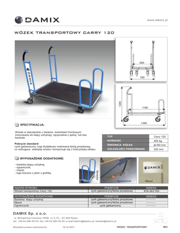 www.damix.pl WÓZEK TRANSPORTOWY CARRY 120 650 1200 780 1180 1360 SPECYFIKACJA: Wózek w standardzie z dwiema barierkami frontowymi (mocowane do klapy uchylnej), opcjonalnie z jedną lub bez barierek. Pokrycie standard: cynk galwaniczny, nogi dodatkowo malowane farbą proszkową, co wzbogaca estetykę wózka i komponuje się z kolorystyką sklepu. TYP Carry 120 NOŚNOŚĆ 400 kg. ŚREDNICA KÓŁKA 160 mm ODLEGŁOŚCI PARKOWANIA 320 mm WYPOSAŻENIE DODATKOWE: Barierka - barierka klapy uchylnej, - ogranicznik, - maszt, - logo boczne z plexi z grafiką. Ogranicznik Maszt NAZWA WYROBU Wózek transportowy Carry 120 POKRYCIE cynk galwaniczny/farba proszkowa INDEKS 919-343-793 WYPOSAŻENIE DODATKOWE Barierka klapy uchylnej Maszt Ogranicznik POKRYCIE cynk galwaniczny/farba proszkowa cynk galwaniczny/farba proszkowa cynk galwaniczny INDEKS DAMIX Sp. z o.o. ul. Bohaterów Czerwca 1956r. nr 3; PL - 87-500 Rypin tel. +48 54 280 45 54; fax +48 54 280 45 40; e-mail:[email protected]; [email protected] Wszelkie prawa zastrzeżone 10.10.2011 “WÓZKI TRANSPORTOWE” W3