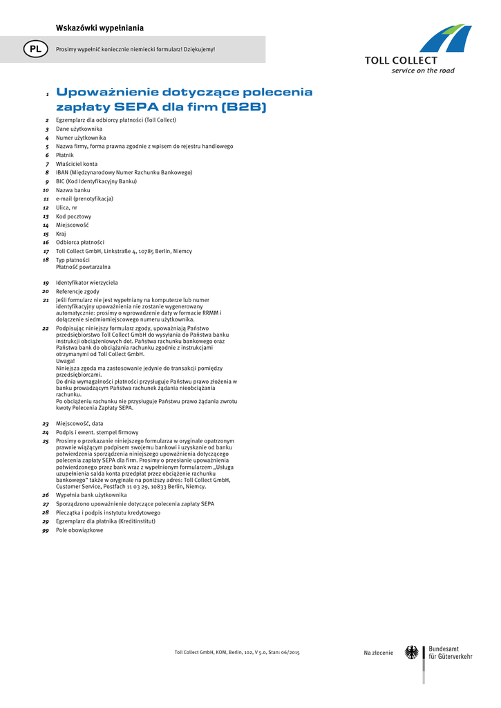 Wskazówki wypełniania PL Prosimy wypełnić koniecznie niemiecki formularz! Dziękujemy! 1 Upoważnienie dotyczące polecenia zapłaty SEPA dla firm (B2B) 2 3 4 5 6 7 8 9 10 11 12 13 14 15 16 17 18 Egzemplarz dla odbiorcy płatności (Toll Collect) Dane użytkownika Numer użytkownika Nazwa firmy, forma prawna zgodnie z wpisem do rejestru handlowego Płatnik Właściciel konta IBAN (Międzynarodowy Numer Rachunku Bankowego) BIC (Kod Identyfikacyjny Banku) Nazwa banku e-mail (prenotyfikacja) Ulica, nr Kod pocztowy Miejscowość Kraj Odbiorca płatności Toll Collect GmbH, Linkstraße 4, 10785 Berlin, Niemcy Typ płatności Płatność powtarzalna 19 20 21 Identyfikator wierzyciela Referencje zgody Jeśli formularz nie jest wypełniany na komputerze lub numer identyfikacyjny upoważnienia nie zostanie wygenerowany automatycznie: prosimy o wprowadzenie daty w formacie RRMM i dołączenie siedmiomiejscowego numeru użytkownika. Podpisując niniejszy formularz zgody, upoważniają Państwo przedsiębiorstwo Toll Collect GmbH do wysyłania do Państwa banku instrukcji obciążeniowych dot. Państwa rachunku bankowego oraz Państwa bank do obciążania rachunku zgodnie z instrukcjami otrzymanymi od Toll Collect GmbH. Uwaga! Niniejsza zgoda ma zastosowanie jedynie do transakcji pomiędzy przedsiębiorcami. Do dnia wymagalności płatności przysługuje Państwu prawo złożenia w banku prowadzącym Państwa rachunek żądania nieobciążania rachunku. Po obciążeniu rachunku nie przysługuje Państwu prawo żądania zwrotu kwoty Polecenia Zapłaty SEPA. 22 23 24 25 26 27 28 29 99 Miejscowość, data Podpis i ewent. stempel firmowy Prosimy o przekazanie niniejszego formularza w oryginale opatrzonym prawnie wiążącym podpisem swojemu bankowi i uzyskanie od banku potwierdzenia sporządzenia niniejszego upoważnienia dotyczącego polecenia zapłaty SEPA dla firm. Prosimy o przesłanie upoważnienia potwierdzonego przez bank wraz z wypełnionym formularzem „Usługa uzupełnienia salda konta przedpłat przez obciążenie rachunku bankowego” także w oryginale na poniższy adres: Toll Collect GmbH, Customer Service, Postfach 11 03 29, 10833 Berlin, Niemcy. Wypełnia bank użytkownika Sporządzono upoważnienie dotyczące polecenia zapłaty SEPA Pieczątka i podpis instytutu kredytowego Egzemplarz dla płatnika (Kreditinstitut) Pole obowiązkowe Toll Collect GmbH, KOM, Berlin, 102, V 5.0, Stan: 06/2015 Powered by TCPDF (www.tcpdf.org) Na zlecenie