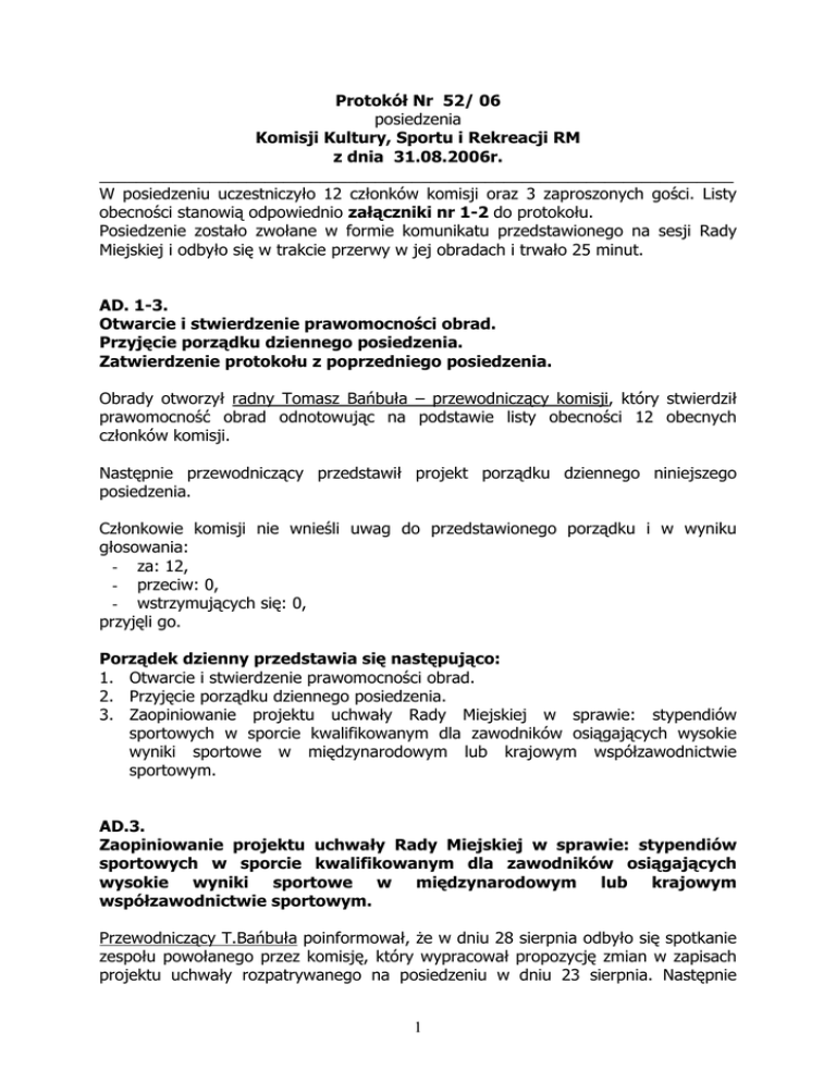 Protokół Nr 52/ 06 posiedzenia Komisji Kultury, Sportu i Rekreacji RM z dnia 31.08.2006r. _____________________________________________________________________ W posiedzeniu uczestniczyło 12 członków komisji oraz 3 zaproszonych gości. Listy obecności stanowią odpowiednio załączniki nr 1-2 do protokołu. Posiedzenie zostało zwołane w formie komunikatu przedstawionego na sesji Rady Miejskiej i odbyło się w trakcie przerwy w jej obradach i trwało 25 minut. AD. 1-3. Otwarcie i stwierdzenie prawomocności obrad. Przyjęcie porządku dziennego posiedzenia. Zatwierdzenie protokołu z poprzedniego posiedzenia. Obrady otworzył radny Tomasz Bańbuła – przewodniczący komisji, który stwierdził prawomocność obrad odnotowując na podstawie listy obecności 12 obecnych członków komisji. Następnie przewodniczący przedstawił projekt porządku dziennego niniejszego posiedzenia. Członkowie komisji nie wnieśli uwag do przedstawionego porządku i w wyniku głosowania: - za: 12, - przeciw: 0, - wstrzymujących się: 0, przyjęli go. Porządek dzienny przedstawia się następująco: 1. Otwarcie i stwierdzenie prawomocności obrad. 2. Przyjęcie porządku dziennego posiedzenia. 3. Zaopiniowanie projektu uchwały Rady Miejskiej w sprawie: stypendiów sportowych w sporcie kwalifikowanym dla zawodników osiągających wysokie wyniki sportowe w międzynarodowym lub krajowym współzawodnictwie sportowym. AD.3. Zaopiniowanie projektu uchwały Rady Miejskiej w sprawie: stypendiów sportowych w sporcie kwalifikowanym dla zawodników osiągających wysokie wyniki sportowe w międzynarodowym lub krajowym współzawodnictwie sportowym. Przewodniczący T.Bańbuła poinformował, że w dniu 28 sierpnia odbyło się spotkanie zespołu powołanego przez komisję, który wypracował propozycję zmian w zapisach projektu uchwały rozpatrywanego na posiedzeniu w dniu 23 sierpnia. Następnie 1 przewodniczący szczegółowo omówił te propozycje odczytując zapisy poprzednie i proponowane w II wersji projektu, który stanowi załącznik nr 3 do protokołu. Jednocześnie przewodniczący zaznaczył, że uchwała w miarę zdobywania doświadczeń i potrzeb może być zmieniana. Radny K.Dziewior wniósł uwagi do treści zapisu § 7, w pkt 1 załącznika nr 1. Stwierdził, że jest on w sprzeczności z zapisem § 1 uchwały, który wymienia stowarzyszenia tutaj pominięte. Radny zaproponował skreślenie, ujętego w nawiasach dopisku, tj. „dotyczy zawodników zrzeszonych w klubach sportowych”, ewentualnie zamiast niego wpisać „zgodnie z § 1 uchwały”. Naczelnik WKS A.Równicki odnosząc się w/w uwag wyjaśnił, że zapis tego akurat paragrafu, jest wynikiem uzgodnień i konsultacji, jakie były dokonane z nadzorem prawnym Urzędu Wojewódzkiego. Jeżeli chodzi o sportowców niezrzeszonych, to tacy mają prawo sami wystąpić o stypendium. W takim przypadku Prezydent na wniosek kogokolwiek, czy też na podstawie uzyskanych informacji może zawiesić stypendium. Przewodniczący T.Bańbuła i przyjął uwagę radnego. Radny K.Dziewior wniósł uwagi co do zwiększenia puli środków na stypendia w dyscyplinie siatkówka mężczyzn (II liga), tj. z 500 do 800 zł, szczególnie w stosunku do siatkówki kobiet. Zdaniem radnego wysokość stypendiów powinna być wyrównana i jednakowa dla wszystkich. Radny zgodził się z wysokością stypendiów w hokeju (ekstraklasa). Przewodniczący T.Bańbuła wyjaśnił, że I liga kobiet nie jest równoważna I lidze mężczyzn, tylko II. Z-ca prezydenta Z.Jaskiernia ustosunkowując się do uwag radnego K.Dziewiora, wskazał, że nie można patrzeć na wszystkie dyscypliny w jednakowy sposób. Należy zwrócić uwagę na potencjał i jednocześnie koszty funkcjonowania dyscyplin sportowych zderzając dwie dyscypliny, np. piłkę nożną kobiet z siatkówką mężczyzn. Te sprawy były bardzo dokładnie analizowane, doszło do spotkania z zarządem klubu „Czarni”, w którym grają dziewczyny. Poinformował o obecnej sytuacji tej drużyny. W chwili obecnej chcąc utrzymać byt tej dyscypliny, ten poziom dofinansowania młodych zawodniczek, pozwoli na utrzymanie się w ich klasie i jest on satysfakcjonujący. Natomiast siatkówka mężczyzn, to już jest zupełnie inny świat, w związku z powyższym stypendia tu zaproponowane tylko w cząstkowy sposób są w stanie ratować sytuacje, dlatego, że jest to dyscyplina, która przy dobrych i sprzyjających okolicznościach ma szansę dorównać do ekstraklasy siatkówki. Również spotkanie z władzami klubu wykazało, że osoby wprowadzone do drużyny pod względem personalnym są w stanie zapewnić przyzwoity poziom gry. Radny A.Jagiełłowicz wyraził generalnie negatywne zdanie co do podejmowania takiej uchwały i oznajmił, że będzie głosował przeciw niej. 2 Wobec faktu wszczęcia dyskusji ad novum głos zabrał przewodniczący RM B.Kabała, który stwierdził, że po to został powołany zespół, aby przeanalizować propozycje i wypracować konkretne propozycje zmian. Wobec zaistniałej sytuacji przewodniczący postawił wniosek formalny o przyjęcie, w całości, propozycji zespołu, ewentualnie zdjęcie z obrad dzisiejszej sesji projektu uchwały. Radny K.Winiarski zwrócił uwagę, że symulacja kosztów opiewająca na kwotę 356 000 zł, dotyczyła okresu 4 miesięcznego, a regulamin się zmienił i są 3 miesiące, więc kwota powinna być mniejsza. Jest to kolejny przykład na to, że uchwała jest przygotowana „na kolanie” i w sposób formalny w ogóle nie nadaje się do głosowania. Poza tym podpisy osób zobowiązanych do zatwierdzenia uchwały dotyczą „starego” projektu, a nie „nowego”. Radny Z.Dziewanowski podkreślił, że jest to bardzo ważna uchwała i mimo zarzutów formalnych, które uznał za negatywne, jednak należy ją podjąć na dzisiejszej sesji, tym bardziej, że specjalnie w tym celu został powołany zespół. Zwłoka o jeden miesiąc na pewno wpłynie negatyw