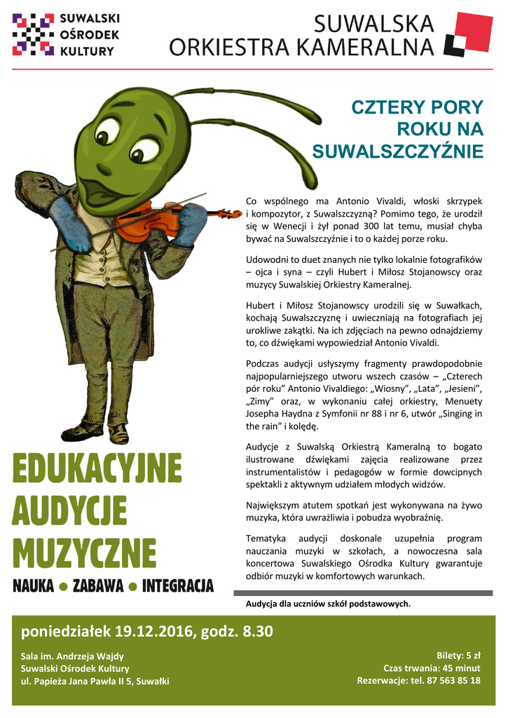 CZTERY PORY ROKU NA SUWALSZCZYŹNIE Co wspólnego ma Antonio Vivaldi, włoski skrzypek i kompozytor, z Suwalszczyzną? Pomimo tego, że urodził się w Wenecji i żył ponad 300 lat temu, musiał chyba bywać na Suwalszczyźnie i to o każdej porze roku. Udowodni to duet znanych nie tylko lokalnie fotografików – ojca i syna – czyli Hubert i Miłosz Stojanowscy oraz muzycy Suwalskiej Orkiestry Kameralnej. Hubert i Miłosz Stojanowscy urodzili się w Suwałkach, kochają Suwalszczyznę i uwieczniają na fotografiach jej urokliwe zakątki. Na ich zdjęciach na pewno odnajdziemy to, co dźwiękami wypowiedział Antonio Vivaldi. Podczas audycji usłyszymy fragmenty prawdopodobnie najpopularniejszego utworu wszech czasów – „Czterech pór roku” Antonio Vivaldiego: „Wiosny”, „Lata”, „Jesieni”, „Zimy” oraz, w wykonaniu całej orkiestry, Menuety Josepha Haydna z Symfonii nr 88 i nr 6, utwór „Singing in the rain” i kolędę. Audycje z Suwalską Orkiestrą Kameralną to bogato ilustrowane dźwiękami zajęcia realizowane przez instrumentalistów i pedagogów w formie dowcipnych spektakli z aktywnym udziałem młodych widzów. Największym atutem spotkań jest wykonywana na żywo muzyka, która uwrażliwia i pobudza wyobraźnię. Tematyka audycji doskonale uzupełnia program nauczania muzyki w szkołach, a nowoczesna sala koncertowa Suwalskiego Ośrodka Kultury gwarantuje odbiór muzyki w komfortowych warunkach. Audycja dla uczniów szkół podstawowych. poniedziałek 19.12.2016, godz. 8.30 Sala im. Andrzeja Wajdy Suwalski Ośrodek Kultury ul. Papieża Jana Pawła II 5, Suwałki Bilety: 5 zł Czas trwania: 45 minut Rezerwacje: tel. 87 563 85 18