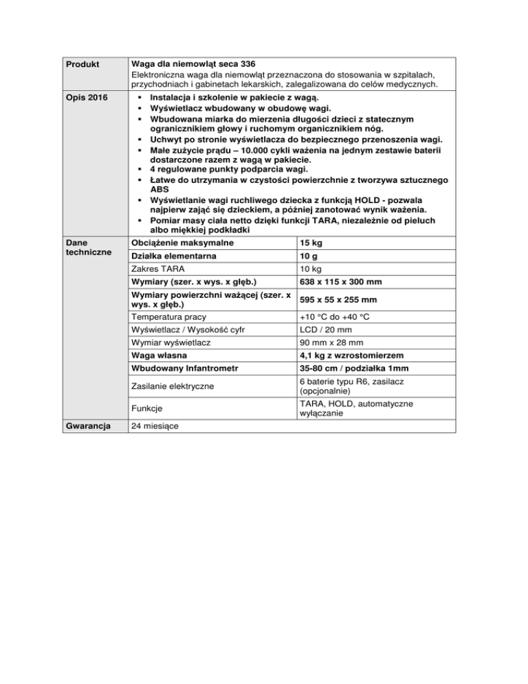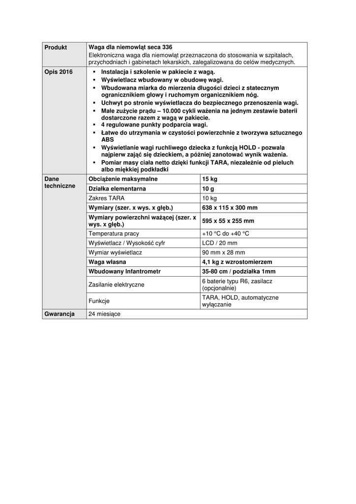Produkt Opis 2016 Dane techniczne Gwarancja Waga dla niemowląt seca 336 Elektroniczna waga dla niemowląt przeznaczona do stosowania w szpitalach, przychodniach i gabinetach lekarskich, zalegalizowana do celów medycznych. Instalacja i szkolenie w pakiecie z wagą. Wyświetlacz wbudowany w obudowę wagi. Wbudowana miarka do mierzenia długości dzieci z statecznym ogranicznikiem głowy i ruchomym organicznikiem nóg. Uchwyt po stronie wyświetlacza do bezpiecznego przenoszenia wagi. Małe zużycie prądu – 10.000 cykli ważenia na jednym zestawie baterii dostarczone razem z wagą w pakiecie. 4 regulowane punkty podparcia wagi. Łatwe do utrzymania w czystości powierzchnie z tworzywa sztucznego ABS Wyświetlanie wagi ruchliwego dziecka z funkcją HOLD - pozwala najpierw zająć się dzieckiem, a później zanotować wynik ważenia. Pomiar masy ciała netto dzięki funkcji TARA, niezależnie od pieluch albo miękkiej podkładki Obciążenie maksymalne 15 kg Działka elementarna 10 g Zakres TARA 10 kg Wymiary (szer. x wys. x głęb.) 638 x 115 x 300 mm Wymiary powierzchni ważącej (szer. x wys. x głęb.) 595 x 55 x 255 mm Temperatura pracy +10 °C do +40 °C Wyświetlacz / Wysokość cyfr LCD / 20 mm Wymiar wyświetlacz 90 mm x 28 mm Waga własna 4,1 kg z wzrostomierzem Wbudowany Infantrometr 35-80 cm / podziałka 1mm Zasilanie elektryczne 6 baterie typu R6, zasilacz (opcjonalnie) Funkcje TARA, HOLD, automatyczne wyłączanie 24 miesiące