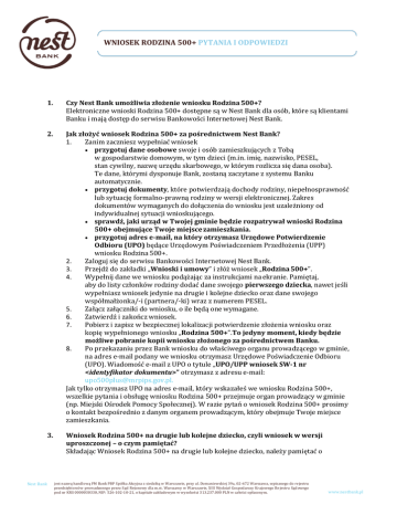 WNIOSEK RODZINA 500+ PYTANIA I ODPOWIEDZI 1. Czy Nest Bank umożliwia złożenie wniosku Rodzina 500+? Elektroniczne wnioski Rodzina 500+ dostępne są w Nest Bank dla osób, które są klientami Banku i mają dostęp do serwisu Bankowości Internetowej Nest Bank. 2. Jak złożyć wniosek Rodzina 500+ za pośrednictwem Nest Bank? 1. Zanim zaczniesz wypełniać wniosek przygotuj dane osobowe swoje i osób zamieszkujących z Tobą w gospodarstwie domowym, w tym dzieci (m.in. imię, nazwisko, PESEL, stan cywilny, nazwę urzędu skarbowego, w którym rozlicza się dana osoba). Te dane, którymi dysponuje Bank, zostaną zaczytane z systemu Banku automatycznie. przygotuj dokumenty, które potwierdzają dochody rodziny, niepełnosprawność lub sytuację formalno-prawną rodziny w wersji elektronicznej. Zakres dokumentów wymaganych do dołączenia do wniosku jest uzależniony od indywidualnej sytuacji wnioskującego. sprawdź, jaki urząd w Twojej gminie będzie rozpatrywał wnioski Rodzina 500+ obejmujące Twoje miejsce zamieszkania. przygotuj adres e-mail, na który otrzymasz Urzędowe Potwierdzenie Odbioru (UPO) będące Urzędowym Poświadczeniem Przedłożenia (UPP) wniosku Rodzina 500+. 2. Zaloguj się do serwisu Bankowości Internetowej Nest Bank. 3. Przejdź do zakładki „Wnioski i umowy” i złóż wniosek „Rodzina 500+”. 4. Wypełnij dane we wniosku podążając za instrukcjami na ekranie. Pamiętaj, aby do listy członków rodziny dodać dane swojego pierwszego dziecka, nawet jeśli wypełniasz wniosek jedynie na drugie i kolejne dziecko oraz dane swojego współmałżonka/-i (partnera/-ki) wraz z numerem PESEL. 5. Załącz załączniki do wniosku, o ile będą one wymagane. 6. Zatwierdź i zakończ wniosek. 7. Pobierz i zapisz w bezpiecznej lokalizacji potwierdzenie złożenia wniosku oraz kopię wypełnionego wniosku „Rodzina 500+”.To jedyny moment, kiedy będzie możliwe pobranie kopii wniosku złożonego za pośrednictwem Banku. 8. Po przekazaniu przez Bank wniosku do właściwego organu prowadzącego w gminie, na adres e-mail podany we wniosku otrzymasz Urzędowe Poświadczenie Odbioru (UPO). Wiadomość e-mail z UPO o tytule „UPO/UPP wniosek SW-1 nr <identyfikator dokumentu>” otrzymasz z adresu e-mail: [email protected]. Jak tylko otrzymasz UPO na adres e-mail, który wskazałeś we wniosku Rodzina 500+, wszelkie pytania i obsługę wniosku Rodzina 500+ przejmuje organ prowadzący w gminie (np. Miejski Ośrodek Pomocy Społecznej). W razie pytań o wniosek Rodzina 500+ prosimy o kontakt bezpośrednio z danym organem prowadzącym, który obejmuje Twoje miejsce zamieszkania. 3. Wniosek Rodzina 500+ na drugie lub kolejne dziecko, czyli wniosek w wersji uproszczonej – o czym pamiętać? Składając Wniosek Rodzina 500+ na drugie lub kolejne dziecko, należy pamiętać o Nest Bank jest nazwą handlową FM Bank PBP Spółka Akcyjna z siedzibą w Warszawie, przy ul. Domaniewskiej 39a, 02-672 Warszawa, wpisanego do rejestru przedsiębiorców prowadzonego przez Sąd Rejonowy dla m.st. Warszawy w Warszawie, XIII Wydział Gospodarczy Krajowego Re jestru Sądowego pod nr KRS 0000030330, NIP: 526-102-10-21, o kapitale zakładowym w wysokości 313.237.000 PLN w całości opłaconym. www.nestbank.pl konieczności podania danych pierwszego dziecka oraz dodatkowych członków rodziny (np. małżonka) w sekcji III „Dane członków rodziny”. Nest Bank 4. Gdzie złożyć wniosek Rodzina 500+? Wniosek możesz złożyć przez Internet: w serwisie internetowym Nest Bank; przez platformę ePUAP; przez Platformę Usług Elektronicznych (PUE) ZUS-u; w serwisie Emp@tia Ministerstwa Rodziny, Pracy i Polityki Społecznej; w serwisach internetowych wybranych banków w Polsce. Wniosek Rodzina 500+ możesz złożyć również pocztowo lub osobiście w miejscu wskazanym przez organ prowadzący w gminie, któremu podlegasz ze względu na miejsce zamieszkania. Wniosku Rodzina 500+ nie można złożyć w oddziale ani przez infolinii Nest Bank. 5. Czy muszę być klientem Nest Bank, aby złożyć wniosek Rodzina 500+ za pośrednictwem tego Banku? Elektroniczne wnioski Rodzina 500+ dostępne są w Nest Bank jedynie dla osób, które są klientami Banku i mają dostęp do serwisu Bankowości Internetowej Nest Bank. 6. Jestem klientem Nest Bank i mam dostęp do serwisu Bankowości Internetowej Nest Bank. Dlaczego nie mogę złożyć wniosku Rodzina 500+? Jeśli otworzyłeś konto w Nest Bank potwierdzając swoje dane przelewem aktywacyjnym z innego banku nie możesz złożyć wniosku Rodzina 500+ przez serwis Bankowości Internetowej Nest Bank. Konieczne jest złożenie wniosku w formie papierowej, w ośrodku pomocy społecznej w Twoim miejscu zamieszkania. Poniżej możesz pobrać interaktywne formularze PDF, dzięki którym w łatwy sposób wypełnisz i wydrukujesz wymagane dokumenty: http:// 7. Skąd mam wiedzieć, do jakiego organu prowadzącego w gminie skierować wniosek? Zwróć się do gminy, w której mieszkasz, o taką informację. 8. Jakie konto podać we wniosku Rodzina 500+ do wypłaty świadczeń? Możesz wskazać dowolne konto bankowe, na które chcesz otrzymywać świadczenia na swoje dzieci. Jeśli składasz wniosek w serwisie Bankowości Internetowej Nest Bank, możesz wskazać konto w Nest Bank lub w dowolnym innym banku. Pieniądze możesz również odbierać w formie innej niż przelew na konto – w celu uzyskania informacji o alternatywnej formie wypłaty, skontaktuj się z organem prowadzącym w Twojej gminie. 9. Czy mogę podać we wniosku Rodzina 500+ konto dziecka do wypłaty świadczeń? Wnioskujący może wskazać dowolne konto, na które będą przekazywane środki, przy czym we wniosku Rodzina 500+ można wskazać tylko jeden numer konta do otrzymywania świadczeń na wszystkie dzieci. 10. Czy po wysłaniu wniosku Rodzina 500+ przez serwis Bankowości Internetowej Nest Bank będzie można go modyfikować? Nie, nie ma takiej możliwości. Jeśli chcesz zmodyfikować