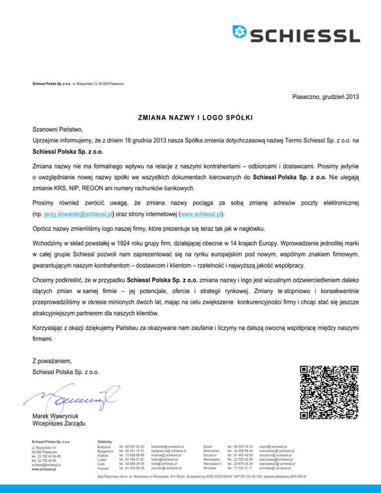 Schiessl Polska Sp. z o.o., ul. Raszyńska 13, 05-500 Piaseczno Piaseczno, grudzień 2013 ZMIANA NAZWY I LOGO SPÓŁKI Szanowni Państwo, Uprzejmie informujemy, że z dniem 16 grudnia 2013 nasza Spółka zmienia dotychczasową nazwę Termo Schiessl Sp. z o.o. na Schiessl Polska Sp. z o.o. Zmiana nazwy nie ma formalnego wpływu na relacje z naszymi kontrahentami – odbiorcami i dostawcami. Prosimy jedynie o uwzględnianie nowej nazwy spółki we wszystkich dokumentach kierowanych do Schiessl Polska Sp. z o.o. Nie ulegają zmianie KRS, NIP, REGON ani numery rachunków bankowych. Prosimy również zwrócić uwagę, że zmiana nazwy pociąga za sobą zmianę adresów poczty elektronicznej (np. [email protected]) oraz strony internetowej (www.schiessl.pl). Oprócz nazwy zmieniliśmy logo naszej firmy, które prezentuje się teraz tak jak w nagłówku. Wchodzimy w skład powstałej w 1924 roku grupy firm, działającej obecnie w 14 krajach Europy. Wprowadzenie jednolitej marki w całej grupie Schiessl pozwoli nam zaprezentować się na rynku europejskim pod nowym, wspólnym znakiem firmowym, gwarantującym naszym kontrahentom – dostawcom i klientom – rzetelność i najwyższą jakość współpracy. Chcemy podkreślić, że w przypadku Schiessl Polska Sp. z o.o. zmiana nazwy i logo jest wizualnym odzwierciedleniem daleko idących zmian w samej firmie – jej potencjale, ofercie i strategii rynkowej. Zmiany te stopniowo i konsekwentnie przeprowadziliśmy w okresie minionych dwóch lat, mając na celu zwiększenie konkurencyjności firmy i chcąc stać się jeszcze atrakcyjniejszym partnerem dla naszych klientów. Korzystając z okazji dziękujemy Państwu za okazywane nam zaufanie i liczymy na dalszą owocną współpracę między naszymi firmami. Z poważaniem, Schiessl Polska Sp. z o.o. Marek Wawryniuk Wiceprezes Zarządu