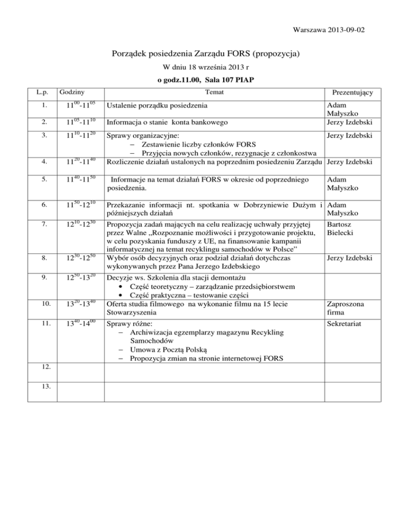 Warszawa 2013-09-02 Porządek posiedzenia Zarządu FORS (propozycja) W dniu 18 września 2013 r o godz.11.00, Sala 107 PIAP L.p. Godziny Temat Prezentujący 1. 1100-1105 Ustalenie porządku posiedzenia 2. 1105-1110 Informacja o stanie konta bankowego 3. 1110-1120 4. 1120-1140 Sprawy organizacyjne: Jerzy Izdebski − Zestawienie liczby członków FORS − Przyjęcia nowych członków, rezygnacje z członkostwa Rozliczenie działań ustalonych na poprzednim posiedzeniu Zarządu Jerzy Izdebski 5. 1140-1150 Informacje na temat działań FORS w okresie od poprzedniego posiedzenia. 6. 1150-1210 Przekazanie informacji nt. spotkania w Dobrzyniewie Dużym i Adam późniejszych działań Małyszko 7. 1210-1230 8. 1230-1250 Propozycja zadań mających na celu realizację uchwały przyjętej przez Walne „Rozpoznanie możliwości i przygotowanie projektu, w celu pozyskania funduszy z UE, na finansowanie kampanii informatycznej na temat recyklingu samochodów w Polsce” Wybór osób decyzyjnych oraz podział działań dotychczas wykonywanych przez Pana Jerzego Izdebskiego 9. 1250-1320 10. 1320-1340 11. 1340-1400 12. 13. Decyzje ws. Szkolenia dla stacji demontażu • Część teoretyczny – zarządzanie przedsiębiorstwem • Część praktyczna – testowanie części Oferta studia filmowego na wykonanie filmu na 15 lecie Stowarzyszenia Sprawy różne: − Archiwizacja egzemplarzy magazynu Recykling Samochodów − Umowa z Pocztą Polską − Propozycja zmian na stronie internetowej FORS Adam Małyszko Jerzy Izdebski Adam Małyszko Bartosz Bielecki Jerzy Izdebski Zaproszona firma Sekretariat