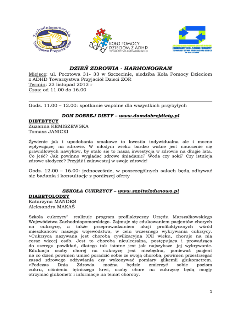 DZIEŃ ZDROWIA - HARMONOGRAM Miejsce: ul. Pocztowa 31- 33 w Szczecinie, siedziba Koła Pomocy Dzieciom z ADHD Towarzystwa Przyjaciół Dzieci ZOR Termin: 23 listopad 2013 r Czas: od 11.00 do 16.00 Godz. 11.00 – 12.00: spotkanie wspólne dla wszystkich przybyłych DOM DOBREJ DIETY – www.domdobrejdiety.pl DIETETYCY Zuzanna REMISZEWSKA Tomasz JANICKI Żywienie jak i upodobania smakowe to kwestia indywidualna ale i mocno wpływającej na zdrowie. W młodym wieku bardzo ważne jest nauczenie się prawidłowych nawyków, by stało się to naszą inwestycją w zdrowie na długie lata. Co jeść? Jak powinno wyglądać zdrowe śniadanie? Woda czy soki? Czy istnieją zdrowe słodycze? Przyjdź i zainwestuj w swoje zdrowie! Godz. 12.00 – 16.00: jednocześnie, w poszczególnych salach będą odbywać się badania i konsultacje z poniższej oferty SZKOŁA CUKRZYCY – www.szpitalzdunowo.pl DIABETOLODZY Katarzyna MANDES Aleksandra MAKAŚ Szkoła cukrzycy" realizuje program profilaktyczny Urzędu Marszałkowskiego Województwa Zachodniopomorskiego. Zajmuje się edukowaniem pacjentów chorych na cukrzycę, a także przeprowadzaniem akcji profilaktycznych wśród mieszkańców naszego województwa, w celu wczesnego wykrywania cukrzycy. >Cukrzyca nazywana jest chorobą cywilizacyjną XXI wieku, choruje na nią coraz więcej osób. Jest to choroba nieuleczalna, postępująca i prowadząca do szeregu powikłań, dlatego tak istotne jest jak najszybsze jej wykrywanie. Edukacja osoby chorej na cukrzycę jest niezbędna, ponieważ pacjent na co dzień powinien umieć poradzić sobie ze swoją chorobą, powinien przestrzegać zasad zdrowego odżywiania czy wykonywać pomiary glikemii glukometrem. >Podczas Dnia Zdrowia można będzie zmierzyć sobie poziom cukru, ciśnienia tętniczego krwi, osoby chore na cukrzycę będą mogły otrzymać glukometr i informacje na temat choroby. 1 GABINET ZDROWE NOGI ELŻBIETA GIERAT - www.gierat.com.pl PODOLODZY Ida JANKOWSKA Kacper RUDOLF Specjaliści podolodzy udzielą porad w zakresie pielęgnacji stóp. Wrastający paznokieć, odciski, modzele, brodawki wirusowe (tzw. "kurzajki"), pękające pięty, stopa cukrzycowa i wszystko inne co przysparza ból i dyskomfort stopom, to wyzwanie dla nich. Wieloletnie doświadczenie, wysoka jakość usług oraz indywidualne podejście do Klienta pomogą im rozwiązać każdy problem stóp. Podczas sobotnich konsultacji każdy będzie mógł uzyskać fachową poradę. KOREMED – www.fizykoterapia-szczecin.pl KOMPLEKSOWA REHABILITACJA MEDYCZNA FIZJOTERAPEUCI Beata OLESIAK Honorata FLAK Specjalistki fizjoterapeutki udzielą porad w zakresie dbania o prawidłową sylwetkę, poprawy stanu zdrowia i ogólnej kondycji. Zaprezentują sposoby rozładowania napięcia z użyciem technik masażu i odpowiednich ćwiczeń. Podczas dnia zdrowia podziela się swoja wiedzą, udzielą fachowych porad zarówno dorosłym, jak i dzieciom. DZIEŃ ZDROWIA w siedzibie Koła Pomocy Dzieciom z ADHD TPD ZOR i Specjalistycznej Placówce Wsparcia Dziennego Dla Dzieci i Młodzieży z ADHD TPD ZOR to nie tylko sposobność zdobycia gruntownej wiedzy i praktyki w zakresie szeroko pojętego zdrowia naszych dzieci i nas samych, ale również możliwość wsparcia działań Placówki, w zakresie doposażenia sal terapeutyczno – szkoleniowych, w których realizowane są specjalistyczne zajęcia dla dzieci i młodzieży z ADHD. Przysłowiową „cegiełkę” będzie kosztować każde badanie wykonane podczas DNIA ZDROWIA! SERDECZNIE ZAPRASZAMY ! 2