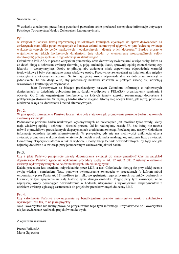 Szanowna Pani, W związku z zadanymi przez Panią pytaniami pozwalam sobie przekazać następujące informacje dotyczące Polskiego Towarzystwa Nauk o Zwierzętach Laboratoryjnych. Pyt. 1. w związku z Państwa liczną reprezentacją w lokalnych komisjach etycznych do spraw doświadczeń na zwierzętach mam kilka pytań związanych z Państwa celami statutowymi ujętymi, w tym "ochroną zwierząt wykorzystywanych do celów naukowych i edukacyjnych i dbanie o ich dobrostan" Bardzo proszę o wyjaśnienie na jakich konkretnych działaniach (nie chodzi o wymienienie poszczególnych celów statutowych) polega spełnianie tego obowiązku statutowego? Członkowie PolLASA to przede wszystkim pracownicy oraz kierownicy zwierzętarni, a więc osoby, które na co dzień dbają o dobrostan zwierząt (karmią je, poją, zmieniają klatki, sprawują opiekę zootechniczną czy lekarsko – weterynaryjną). Osoby te pilnują, aby zwierzęta miały zapewnione odpowiednie warunki środowiskowe i były obsługiwane przez właściwe osoby. Pracownicy zwierzętarni są linią kontaktu między zwierzętami a eksperymentatorami. Są to najczęściej osoby odpowiedzialne za dobrostan zwierząt w jednostkach. To one dbają o to, aby pracownicy naukowi stosowali w praktyce zasadę 3R, udzielają wskazówek i kontrolują ich wykonanie. Jako Towarzystwo na bieżąco przekazujemy naszym Członkom informacje o najnowszych doniesieniach w dziedzinie dobrostanu (m.in. dzięki współpracy z FELASA), organizujemy seminaria i odczyty. Co 2 lata organizujemy konferencje, na których tematy szeroko rozumianego dobrostanu i praktycznego stosowania 3R zajmują bardzo istotne miejsce. Istotną rolę odegra także, jak sądzę, powołana niedawno sekcja ds. dobrostanu i metod alternatywnych. Pyt. 2. W jaki sposób zamierzacie Państwo łączyć takie cele statutowe jak promowanie poziomu badań naukowych z ochroną zwierząt? Podnoszenie poziomu badań naukowych wykonywanych na zwierzętach jest możliwe tylko wtedy, kiedy mają właściwą opiekę i ochronę – również prawną. Od lat realizujemy zasadę 3R, bez której nie można mówić o prawidłowo prowadzonych eksperymentach z udziałem zwierząt. Przekazujemy naszym Członkom informacje odnośnie technik alternatywnych. W przypadku, gdy nie ma możliwości uniknięcia użycia zwierząt, promujemy wykorzystanie właściwych modeli w celu maksymalnego ograniczenia liczby zwierząt. Doradzamy eksperymentatorom w takim wyborze i modyfikacji technik doświadczalnych, by były one jak najmniej dotkliwe dla zwierząt, przy jednoczesnym zachowaniu jakości badań. Pyt.3. Czy i jakie Państwo przyjęliście zasady dopuszczania zwierząt do eksperymentów? Czy na przykład dopuszczacie Państwo zgodę na wykonanie procedury ujętej w art. 12 ust. 2 ptk. 2 ustawy o ochronie zwierząt wykorzystywanych do celów naukowych lub edukacyjnych? Każda procedura jest oceniana indywidualnie przez LKE, a nasi Członkowie kierują się przy takiej ocenie swoją wiedzą i sumieniem. Tzw. ponowne wykorzystanie zwierzęcia w procedurach (o którym mówi wspomniany przez Panią art. 12) możliwe jest tylko po spełnieniu rygorystycznych warunków podanych w Ustawie, w tym spojrzenia na całą historię życia danego osobnika. Pragnę przy tym zaznaczyć, że to najczęściej osoby posiadające doświadczenie w hodowli, utrzymaniu i wykonywaniu eksperymentów z udziałem zwierząt zgłaszają zastrzeżenia do projektów przedstawianych do oceny LKE. Pyt. 4. Czy członkowie Państwa stowarzyszenia są beneficjentami grantów ministerstwa nauki i szkolnictwa wyższego? Jeśli tak, to na jakie projekty. Jako Towarzystwo nie mamy prawa do pozyskiwania tego typu informacji. Przynależność do Towarzystwa nie jest związana z realizacją projektów naukowych. Z wyrazami szacunku Prezes PolLASA Marta Gajewska