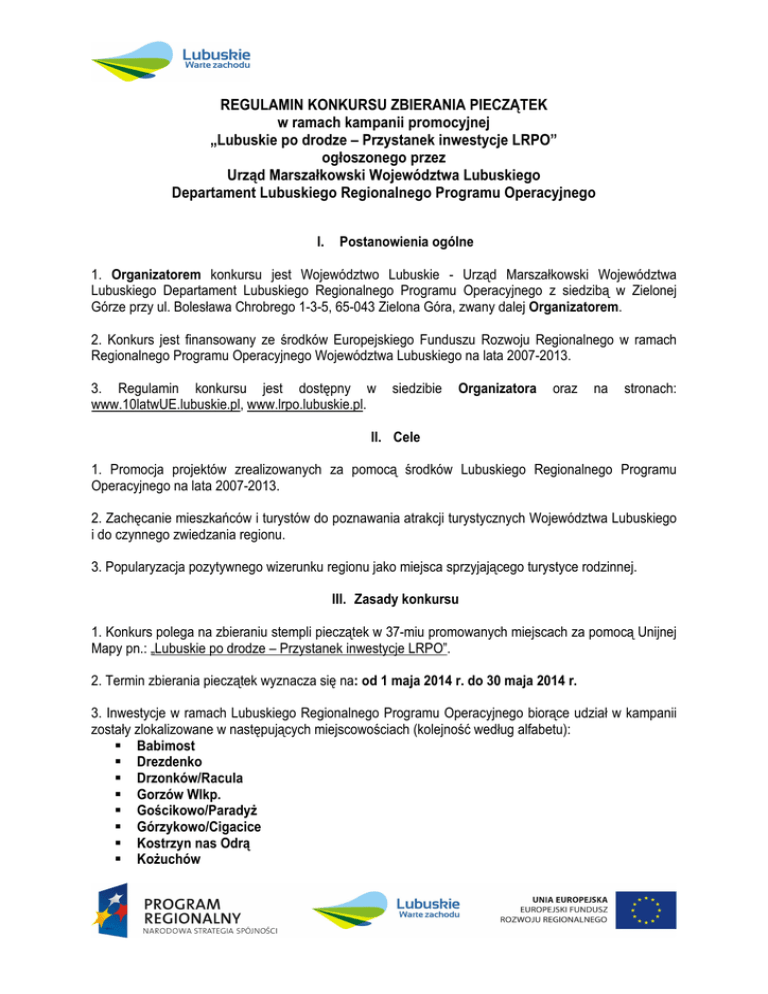 REGULAMIN KONKURSU ZBIERANIA PIECZĄTEK w ramach kampanii promocyjnej „Lubuskie po drodze – Przystanek inwestycje LRPO” ogłoszonego przez Urząd Marszałkowski Województwa Lubuskiego Departament Lubuskiego Regionalnego Programu Operacyjnego I. Postanowienia ogólne 1. Organizatorem konkursu jest Województwo Lubuskie - Urząd Marszałkowski Województwa Lubuskiego Departament Lubuskiego Regionalnego Programu Operacyjnego z siedzibą w Zielonej Górze przy ul. Bolesława Chrobrego 1-3-5, 65-043 Zielona Góra, zwany dalej Organizatorem. 2. Konkurs jest finansowany ze środków Europejskiego Funduszu Rozwoju Regionalnego w ramach Regionalnego Programu Operacyjnego Województwa Lubuskiego na lata 2007-2013. 3. Regulamin konkursu jest dostępny w www.10latwUE.lubuskie.pl, www.lrpo.lubuskie.pl. siedzibie Organizatora oraz na stronach: II. Cele 1. Promocja projektów zrealizowanych za pomocą środków Lubuskiego Regionalnego Programu Operacyjnego na lata 2007-2013. 2. Zachęcanie mieszkańców i turystów do poznawania atrakcji turystycznych Województwa Lubuskiego i do czynnego zwiedzania regionu. 3. Popularyzacja pozytywnego wizerunku regionu jako miejsca sprzyjającego turystyce rodzinnej. III. Zasady konkursu 1. Konkurs polega na zbieraniu stempli pieczątek w 37-miu promowanych miejscach za pomocą Unijnej Mapy pn.: „Lubuskie po drodze – Przystanek inwestycje LRPO”. 2. Termin zbierania pieczątek wyznacza się na: od 1 maja 2014 r. do 30 maja 2014 r. 3. Inwestycje w ramach Lubuskiego Regionalnego Programu Operacyjnego biorące udział w kampanii zostały zlokalizowane w następujących miejscowościach (kolejność według alfabetu): Babimost Drezdenko Drzonków/Racula Gorzów Wlkp. Gościkowo/Paradyż Górzykowo/Cigacice Kostrzyn nas Odrą Kożuchów Lubniewice Lubsko Łagów Międzyrzecz Nowa Sól Nowe Miasteczko Nowogród Bobrzański Nowy Kisielin Ochla Ośno Lubuskie Radwanów Sława Słubice Sulechów Sulęcin Świebodzin Wiechlice/Szprotawa Wschowa Zielona Góra Żagań Żary 4. Dokładne dane teleadresowe tj. Tytuł Beneficjenta, Nazwa Beneficjenta oraz adres, gdzie można uzyskać stempel pieczątki znajdują się w Załączniku nr 1 do niniejszego regulaminu, który stanowi jego integralną część. Lista znajduje się również w notatniku podróżnika „Lubuskie po drodze – Przystanek inwestycje LRPO”, w Biurze Organizatora konkursu oraz na stronach: www.10latwUE.lubuskie.pl, www.lrpo.lubuskie.pl. 5. Pieczątki należy zbierać na odwrocie mapy konkursowej, która po wypełnieniu, tj. zdobyciu minimum 1 pieczątki stanowi kupon konkursowy. Pozostałe materiały tj. notatnik podróżnika pozostaje pamiątką osoby biorącej udział w konkursie. 6. Mapę można otrzymać w punktach, biorących udział w kampanii wymienionych w podpunkcie 3 oraz w siedzibie Organizatora. 7. Każdemu posiadaczowi mapy w terminie trwania konkursu określonym w podpunkcie 2 przysługuje bezpłatne wejście na teren obiektu, w godzinach jego funkcjonowania w celu otrzymania stempla pieczątki. IV. Warunki uczestnictwa 1. Konkurs ma charakter regionalny i jest otwarty dla wszystkich osób fizycznych. 2. Każdy uczestnik konkursu posiada swoją mapę, w której zdobywa pieczątki. Po zdobyciu minimum 1 (jednego) stempla pieczątkami mapa stanowi kupon konkursowy. 3. Osoby niepełnoletnie, które biorą udział w konkursie, muszą na mapie uzupełnić/uzyskać pisemną zgodę rodziców bądź prawnych opiekunów na udział w konkursie. Formularz takiej zgody znajduje się na odwrocie mapy. 4. Warunkiem uczestnictwa w konkursie jest przesłanie wypełnionej danymi osobowymi całej mapy. 5. W konkursie bierze udział każda osoba fizyczna, która wyśle mapę na adres Organizatora lub złoży ją w specjalnej urnie zlokalizowaną w miejscach opisanych w podpunkcie 6. 6. Uczestnik konkursu może złożyć swoją mapę konkursową w dwudziestu urnach znajdujących się w 20 punktach na terenie Województwa Lubuskiego. Urny będą dostępne w następujących miejscowościach: Babimost Drezdenko Gorzów Wlkp. Gościkowo/Paradyż Kostrzyn nas Odrą Kożuchów Lubniewice Lubsko Łagów Międzyrzecz Nowa Sól Nowogród Bobrzański Sława Sulechów Sulęcin Świebodzin Wiechlice/Szprotawa Wschowa Zielona Góra Żagań 7. Dokładne dane teleadresowe punktów o których mowa w punkcie 6, w których można złożyć mapę konkursową znajdują się w Załączniku nr 1 do niniejszego regulaminu, który stanowi jego integralną część. 8. Mapę konkursową należy złożyć w urnie, wysłać pocztą lub dostarczyć osobiście do siedziby Organizatora w terminie od 01.05.2014 do 30.05.2014 r. W przypadku wysłania pocztą decyduje data stempla pocztowego. 9. Mapę konkursową należy przesłać pocztą bądź dostarczyć osobiście na adres: Urząd Marszałkowski Województwa Lubuskiego Departament Lubuskiego Regionalnego Programu Operacyjnego, ul. Bolesława Chrobrego 1-3-5, 65-043 Zielona Góra w terminie od dnia ogłoszenia konkursu do 30.05.2014. 10. Uczestnik konkursu może przesłać tylko jedną mapę konkursową. 11. Mapa konkursowa otrzymana po terminie nie będzie brała udziału w losowaniu nagród. Organizator konkursu nie ponosi odpowiedzialności za ewentualne zaginięcie mapy powstałe w czasie przesyłki. 12. Losowanie zostanie przeprowadzone przez komisję konkursową. Skład komisji zostanie podany na stronach: www.10latwUE.lubuskie.pl, www.lrpo.lubuskie.pl. 13. Lista nagrodzonych osób zostanie opublikowana na stronach: www.10latwUE.lubuskie.pl, www.lrpo.lubuskie.pl oraz www.lubuskie.pl. Zwycięzcy zostaną również poinformowani o wygranej telefonicznie. Odbiór wygranej nastąpi podczas uroczystości wręczenia nagród, o której zwycięzcy zostaną poinformowani telefonicznie przez Organizatora. 14. W przypadku nieodebrania nagród podczas uroczystości ich wręczenia, laureaci mogą zgłosić się osobiście po ich odbiór w ciągu 1 miesiąca od ogłoszenia wyników do sied