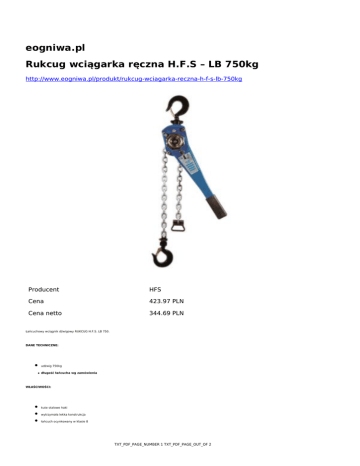 eogniwa.pl Rukcug wciągarka ręczna H.F.S – LB 750kg http://www.eogniwa.pl/produkt/rukcug-wciagarka-reczna-h-f-s-lb-750kg Producent HFS Cena 423.97 PLN Cena netto 344.69 PLN Łańcuchowy wciągnik dźwigowy RUKCUG H.F.S. LB 750. DANE TECHNICZNE: udźwig 750kg długość łańcucha wg zamówienia WŁAŚCIWOŚCI: kute stalowe haki wytrzymała lekka konstrukcja łańcuch ocynkowany w klasie 8 TXT_PDF_PAGE_NUMBER 1 TXT_PDF_PAGE_OUT_OF 2 wolny bieg łańcucha do szybszej obsługi zamknięte koła zębate w skrzyni automatyczny hamulec z podwójnym systemem zabezpieczeń wszystkie koła zębate z łożyskami tłocznymi trwała powłoka lakiernicza haki z łożyskami ułatwiają obracanie ładunku. TXT_PDF_PAGE_NUMBER 2 TXT_PDF_PAGE_OUT_OF 2