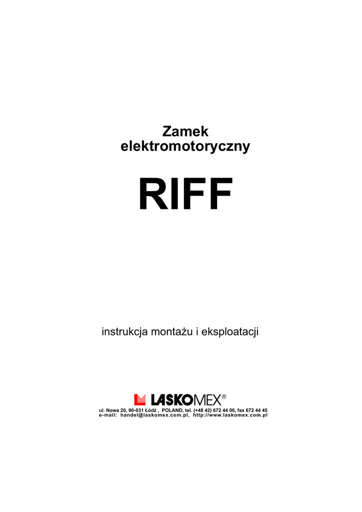 Zamek elektromotoryczny RIFF instrukcja monta¿u i eksploatacji ul. Nowa 20, 90-031 £ód , POLAND, tel. (+48 42) 672 44 00, fax 672 44 45 e-mail: [email protected], http://www.laskomex.com.pl Przeznaczenie Zamki elektromotoryczne Riff przeznaczone s¹ do wszelkiego typu drzwi przystosowanych do monta¿u zamków zgodnych ze standardem DIN 18250. W przeciwieñstwie do zamków tradycyjnych, w których rygiel napêdzany jest bezporednio przez wk³adkê bêbenkow¹, w zamkach elektromotorycznych rygiel poruszany jest przez silnik krokowy. Dziêki takiemu rozwi¹zaniu zamek nie jest podatny na tradycyjne metody stosowane przez w³amywaczy- zamki oparte o rozwi¹zanie tego typu uznawane s¹ za jedne z bezpieczniejszych. Zamek posiada czujnik magnetyczny, który wraz z umieszczonym w odpowiednim miejscu futryny magnesem stanowi uk³ad okrelaj¹cy po³o¿enie drzwi. Czujnik ten zapobiega uruchomieniu zamka w nieodpowiednim momencie, pozwala na wykrycie stanu otwarcia, zamkniêcia czy niedomkniêcia drzwi. Odrêbny czujnik dostarcza informacji o po³o¿eniu rygla (rygiel wsuniêty lub wysuniêty). Dla osób przyzwyczajonych do tradycyjnego sposobu otwierania drzwi przewidziana zosta³a mo¿liwoæ zamontowania wk³adki bêbenkowej, przy pomocy której mo¿na odblokowaæ zamek. Zamek mo¿e byæ stosowany w dowolnych systemach kontroli dostêpu, w szczególnoci z zamkiem szyfrowym Riff. Gwarantowany termin dzia³ania zamka 10 lat. Opis dzia³ania zamka Zamek mo¿e byæ sterowany przez dowolne urz¹dzenie zewnêtrzne- zamek szyfrowy, system kontroli dostêpu, a w najprostszym wypadku zwyk³y przycisk. Schemat po³¹czeñ zamka przedstawiony jest na rysunku nr.1. Po krótkim wciniêciu przycisku P1 (zamiast przycisku mog¹ to byæ styki przekanika urz¹dzenia steruj¹cego) zamek zostanie odblokowany. W przypadku, kiedy w przeci¹gu 20 s drzwi nie zostan¹ otwarte zamek zamknie siê automatycznie. Ponowne wciniêcie przycisku P1 spowoduje zablokowanie zamka i pozostanie zamkniêty przez nieograniczony czas, tak¿e po zaniku zasilania lub przerwaniu kabla. UWAGA! Obecnoæ wk³adki bêbenkowej umo¿liwia awaryjne otwarcie zamka Warunkiem zablokowania zamka jest w³aciwe po³o¿enie drzwi - musz¹ one zostaæ zamkniête. Jeli przycisk P1 zostanie wciniêty na czas ok 1,5 s zamek zostanie odblokowany i pozostanie w tym stanie tak d³ugo, jak utrzymywane bêdzie zwarcie przycisku P1. UWAGA! Zamek analizuje po³o¿enie skrzyd³a drzwi wzglêdem futryny. Umo¿liwia to czujnik magnetyczny znajduj¹cy siê w zamku i magnes sta³y zamontowany w futrynie. Jeli drzwi nie zostan¹ dok³adnie zamkniête to czujnik uniemo¿liwi zablokowanie zamka. Jeli dojdzie do sytuacji w której czujnik wykryje zamkniêcie drzwi, jednak w krótkim czasie po tym zdarzeniu zostan¹ one ponownie otwarte to rygiel zamka zostanie wysuniêty (mimo ¿e drzwi nie zosta³y poprawnie zamkniête). Po up³ywie ok. 2 s rygiel zamka zostanie wsuniêty umo¿liwiaj¹c ponowne zamkniêcie drzwi (sytuacja taka mo¿e mieæ miejsce np. przy trzaniêciu drzwiami). Jeli zamek zosta³ odblokowany przy pomocy klucza, a drzwi nie zosta³y otworzone w ci¹gu 20 s to zamek zostanie automatycznie zablokowany. Zamek mo¿na przy pomocy klucza zablokowaæ w stanie zamkniêtym- w tym celu klucz nale¿y przekrêciæ do oporu zgodnie z ruchem wskazówek zegara. W zamku znajduje rolka s³u¿¹ca do pozycjonowania po³o¿enia drzwi wzglêdem futryny. Rolka ta powoduje ¿e zamkniêcie i otwarcie drzwi wymaga u¿ycia pewnej si³y, co eliminuje do minimum przypadkowe otwarcie lub zamkniêcie drzwi przy odblokowanym zamku. Docisk rolki do p³askownika zamontowanego w futrynie jest regulowany- s³u¿y do tego celu ruba znajduj¹ca siê w dolnej czêci korpusu zamka (patrz rys. 4). Jeli drzwi zamykane s¹ przez samozamykacz to wskazane jest aby rolka by³a ca³kowicie schowana wewn¹trz zamka. Instalowanie zamka i jego pod³¹czenie do linii sterowania zewnêtrznego - Przygotowaæ otwór w drzwiach zamka zgodnie z rys. 3, - Wykonaæ otwór na wylot zgodnie z rys. 3 do wk³adki bêbenkowej, - Wykonaæ otwory, przez które wyprowadzone zostan¹ przewody, - Dokonaæ regulacji wysuniêcia rolki w-g wzoru: szerokoæ szczeliny miêdzy drzwiami a futryn¹ + 3 mm, - Wykonaæ po³¹czenia elektryczne zgodnie z rys. 1, - przewód czerwony 10,8 ... 16 V DC - przewód czarny masa - przewód zielony sterowanie otwieraniem (OPEN) - przewód bia³y sygna³ DOOR Sygna³ DOOR steruje podawaniem masy w przypadkach: odblokowania zamka silnikiem, odblokowania zamka kluczem, przy niepe³nym wysuniêciu rygla i przy fizycznym uszkodzeniu drzwi - Wstawiæ zamek w otwór w drzwiach i wyprowadziæ przewody, - Zamocowaæ zamek za pomoc¹ dwóch wkrêtów, - O ile to konieczne wstawiæ wk³adkê bêbenkowa i zablokowaæ j¹ wkrêtem M5x55 - Upewniæ siê, ¿e zamek otwiera siê za pomoc¹ klucza, a rygiel chowa siê bez problemu. - Wyznaczyæ miejsce monta¿u p³askownika w futrynie drzwi, - Wykonaæ wpust o g³êbokoci 3mm dla mocowania p³askownika, - Wykonaæ otwory o rednicy 12mm pod magnes oraz wpust o g³êbokoci 20mm do rygla, - Zamocowaæ p³askownik za pomoc¹ trzech wkrêtów, - Zamkn¹æ drzwi i sprawdziæ dzia³anie zamka. Kompletacja zestawu 1. Zamek elektromechaniczny z³o¿ony 1szt 2. P³askownik H=20mm* w zestawie z magnesem 1szt 3. Wkrêt M5x55 do mocowania wk³adki bêbenkowej 1szt 4. ruba mocowania zamka i p³askownika 5 szt 5. Instrukcja instalatora i u¿ytkownika 1 szt 6. Opakowanie 1szt * Na zamówienie zamek mo¿e byæ wyposa¿ony w p³askownik H=24mm. - PIN + 16,5 20 FUNKCJA 1 GND 2 +6...15 V 3 OPEN 4 DOOR krêtem M5x55 wa siê bez PK-1 500 mA max. P1 R1 1K 8 3 165 rzy niepe³nym 67,5 50 13 miêdzy drzwiami 35 nêtrznego 1000 Kg 20 mm 0,2 s 50 mm 300000* cykli 10,8 16 V 0,8* A < 18* uA < 0,5 A -26...+60 oC < 0,8 kg 240x95x30 30 y rolka by³a Dane techniczne 1. Dopuszczalny nacisk na rygiel 2. Maksymalne wysuniêcie rygla 3. Czas wysuniêcia i wsuniêcia rygla 4. Odleg³oæ o