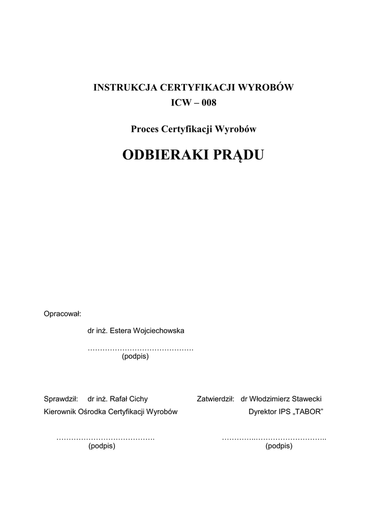 INSTRUKCJA CERTYFIKACJI WYROBÓW ICW – 008 Proces Certyfikacji Wyrobów ODBIERAKI PRĄDU Opracował: dr inż. Estera Wojciechowska ……………………………………. (podpis) Sprawdził: dr inż. Rafał Cichy Kierownik Ośrodka Certyfikacji Wyrobów …………………………………. (podpis) Zatwierdził: dr Włodzimierz Stawecki Dyrektor IPS „TABOR” …………..……………………….. (podpis) SPIS TREŚCI 1. Informacje ogólne 2. Definicje 3. Wyroby podlegające ocenie zgodności objęte niniejszą instrukcją 4. Dokumenty związane 4.1. Dokumenty normatywne związane z certyfikacją wyrobów 4.2. Dokumenty odniesienia 5. Typ programu certyfikacji wyrobu wg. PN-EN ISO/IEC 17067:2014-01 5.1. Program certyfikacji wyrobów – typ 1a 5.2. Program certyfikacji wyrobów – typ 3 6. Etapy procesu certyfikacji 6.1. Etapy procesu certyfikacji w oparciu o program certyfikacji wyrobów – typ 1a 6.2. Etapy procesu certyfikacji w oparciu o program certyfikacji wyrobów – typ 3 7. Proces certyfikacji wyrobu 7.1. Zapytania, oferty 7.2. Wnioski, Zamówienia 7.3. Przegląd wniosku/Rejestracja wniosku 7.4. Umowa o przeprowadzenie certyfikacji wyrobu 7.5. Przekazanie/udostępnienie próbki wyrobu do oceny 7.6. Przegląd dokumentacji 7.7. Ocena warunków organizacyjno - technicznych 7.8. Ocena wyrobu 7.9. Raport z oceny 7.10. Decyzja o przyznaniu bądź odmowie wydania dokumentacji certyfikacyjnej 7.11. Wydanie dokumentacji certyfikacyjnej /Zakończenie procesu certyfikacji 7.12. Badanie satysfakcji Klienta 7.13. Nadzór 8. Przeniesienie praw własności dokumentu certyfikacyjnego 9. Skargi lub odwołania 10. Deklaracja zachowania poufności informacji 11. Warunki ubezpieczenia 2 1. Informacje ogólne Certyfikację wyrobów prowadzą akredytowane przez Polskie Centrum Akredytacji Jednostki Certyfikujące spełniające wymagania normę PN-EN 17065 i IAF GD5 Niniejsza Instrukcja Certyfikacji Wyrobów dotyczy procesu dobrowolnej certyfikacji wyrobów, nie podlegających oznaczeniu znakiem CE, ocenianych w Jednostce ds. Certyfikacji OCW IPS „TABOR” w Poznaniu. Niniejsza Instrukcja Certyfikacji Wyrobów opracowany został w celu zapoznania się potencjalnych Klientów Jednostki ds. Certyfikacji OCW IPS „TABOR” z zagadnieniami procesu certyfikacji wyrobów w odniesieniu do: – dokumentów normatywnych związanych z certyfikacją, – systemu certyfikacji, – etapów certyfikacji, pozostałych zapisów dotyczących oceny wyrobów 2. Definicje: – Certyfikacja wyrobu – zasady, procedury i zarządzenia dotyczące przeprowadzenia oceny zgodności wyrobu przez stronę trzecią - IPS „TABOR”, które mają na celu uzyskanie przez zamawiającego „Certyfikatu zgodności”. – Certyfikat zgodności – dokument wystawiony przez jednostkę certyfikującą potwierdzający spełnienie przez dany wyrób wymagań zawartych w dokumencie odniesienia. – Dokument odniesienia – kryterium oceny i certyfikacji wyrobu, którym mogą być: normy europejskie, normy krajowe, normy zakładowe, specyfikacje techniczne, przepisy prawne dotyczące wyrobów będących przedmiotem certyfikacji. – Wyrób – wynik procesu, usługi (np. transport), wytwór intelektualny (np. program komputerowy, słownik), przedmiot materialny (np. silnik, część mechaniczna), materiały przetworzone (np. smar). – Program certyfikacji – system certyfikacji odnoszący się do określonych wyrobów, do których mają zastosowanie te same wyspecyfikowane wymagania, określone zasady i procedury. – Przedmiot zamówienia – wyrób proces lub usługa 3. Wyroby podlegające ocenie zgodności objęte niniejszą instrukcją: – odbieraki prądu, – nakładki stykowe. 3 4. Dokumenty związane z certyfikacją wyrobów: 4.1. Dokumenty normatywne związane z certyfikacją wyrobów: – Ustawa z dnia 30 sierpnia 2002 r. o systemie oceny zgodności (Dz. U. 2002 Nr 166 poz. 1360 z późn. zm.), – Ustawa z dnia 13 kwietnia 2016 r. o systemach oceny zgodności i nadzoru rynku (Dz. U. 2016 poz. 542 z późn. zm.), – Ustawa z dnia 28 marca 2003 r. o transporcie kolejowym (Dz. U. z 2015 r. poz. 1297, z późn. zm.), – Dyrektywa Parlamentu Europejskiego i Rady 2008/57/WE z dnia 17 czerwca 2008 r. w sprawie interoperacyjności systemu kolei we Wspólnocie (z późn. zm.); – PN-EN ISO/IEC 17065:2013-03 Ocena zgodności. Wymagania dla jednostek certyfikujących wyroby, procesy i usługi – PN-EN ISO/IEC 17067:2014-01 Ocena zgodności -- Podstawy certyfikacji wyrobów oraz wytyczne dotyczące programów certyfikacji wyrobów – PN-EN ISO/IEC 17000:2006 Ocena zgodności -- Terminologia i zasady ogólne – PN-EN ISO/IEC 17020:2012 Ogólne kryteria działania różnych rodzajów jednostek kontrolujących – PN-EN ISO/IEC 17021 – Wymagania dla jednostek prowadzących audity i certyfikację systemów zarządzania; – PN-EN ISO/IEC 17025 Ogólne wymagania dotyczące kompetencji laboratoriów badawczych i wzorcujących – ISO/IEC TR 17026:2015 Conformity assessment — Example of a certification scheme for tangible products – PN-EN ISO 9001:2009 - Systemy zarządzania jakością -- Wymagania – PN-EN ISO 19011:2012 - Wytyczne dotyczące auditowania systemów zarządzania – DA-06 Polityka dotycząca zapewnienia spójności pomiarowej; – Techniczne Specyfikacje Interoperacyjności 4.2 Dokumenty odniesienia: – PN-K 92004:1997. Tabor tramwajowy -- Odbierak prądu tramwajowy -Wymagania i metody badań – PN-EN 50155:2007. Zastosowania kolejowe -- Wyposażenie elektroniczne stosowane w taborze 4 5. Typ programu certyfikacji wyrobu wg. PN-EN ISO/IEC 17067:2014-01 5.1. Program certyfikacji wyrobu – typ 1a Rodzaj wydawanego dokumentu certyfikacyjnego Typ programu certyfikacji wyrobu wg. PN-EN ISO/IEC 17067 Funkcje i działania w zakresie oceny zgodności w programach certyfikacji wyrobu – – – Certyfikat Zgodności Wyrobu 1a – – Wybór, obejmujący działania planowania i przygotowania, okreś