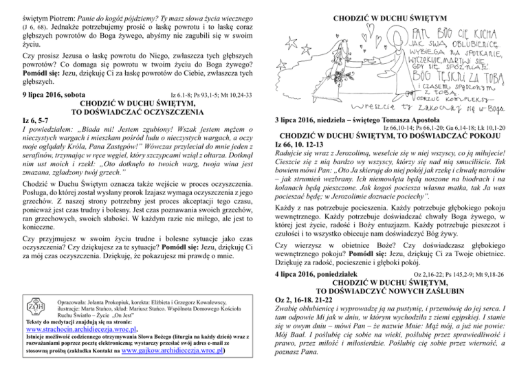 świętym Piotrem: Panie do kogóż pójdziemy? Ty masz słowa życia wiecznego (J 6, 68). Jednakże potrzebujemy prosić o łaskę powrotu i to łaskę coraz głębszych powrotów do Boga żywego, abyśmy nie zagubili się w swoim życiu. CHODZIĆ W DUCHU ŚWIĘTYM Czy prosisz Jezusa o łaskę powrotu do Niego, zwłaszcza tych głębszych powrotów? Co domaga się powrotu w twoim życiu do Boga żywego? Pomódl się: Jezu, dziękuję Ci za łaskę powrotów do Ciebie, zwłaszcza tych głębszych. 9 lipca 2016, sobota Iz 6.1-8; Ps 93,1-5; Mt 10,24-33 CHODZIĆ W DUCHU ŚWIĘTYM, TO DOŚWIADCZAĆ OCZYSZCZENIA Iz 6, 5-7 I powiedziałem: „Biada mi! Jestem zgubiony! Wszak jestem mężem o nieczystych wargach i mieszkam pośród ludu o nieczystych wargach, a oczy moje oglądały Króla, Pana Zastępów!” Wówczas przyleciał do mnie jeden z serafinów, trzymając w ręce węgiel, który szczypcami wziął z ołtarza. Dotknął nim ust moich i rzekł: „Oto dotknęło to twoich warg, twoja wina jest zmazana, zgładzony twój grzech.” Chodzić w Duchu Świętym oznacza także wejście w proces oczyszczenia. Posługa, do której został wysłany prorok Izajasz wymaga oczyszczenia z jego grzechów. Z naszej strony potrzebny jest proces akceptacji tego czasu, ponieważ jest czas trudny i bolesny. Jest czas poznawania swoich grzechów, ran grzechowych, swoich słabości. W każdym razie nic miłego, ale jest to konieczne. Czy przyjmujesz w swoim życiu trudne i bolesne sytuacje jako czas oczyszczenia? Czy dziękujesz za te sytuacje? Pomódl się: Jezu, dziękuję Ci za mój czas oczyszczenia. Dziękuję, że pokazujesz mi prawdę o mnie. Opracowała: Jolanta Prokopiuk, korekta: Elżbieta i Grzegorz Kowalewscy, ilustracje: Marta Stańco, skład: Mariusz Stańco. Wspólnota Domowego Kościoła Ruchu Światło – Życie „On Jest” Teksty do medytacji znajdują się na stronie: www.strachocin.archidiecezja.wroc.pl. Istnieje możliwość codziennego otrzymywania Słowa Bożego (liturgia na każdy dzień) wraz z rozważaniami poprzez pocztę elektroniczną; wystarczy przesłać swój adres e-mail ze stosowną prośbą (zakładka Kontakt na www.gajkow.archidiecezja.wroc.pl) 3 lipca 2016, niedziela – świętego Tomasza Apostoła Iz 66,10-14; Ps 66,1-20; Ga 6,14-18; Łk 10,1-20 CHODZIĆ W DUCHU ŚWIĘTYM, TO DOŚWIADCZAĆ POKOJU Iz 66, 10. 12-13 Radujcie się wraz z Jerozolimą, weselcie się w niej wszyscy, co ją miłujecie! Cieszcie się z nią bardzo wy wszyscy, którzy się nad nią smuciliście. Tak bowiem mówi Pan: „Oto Ja skieruję do niej pokój jak rzekę i chwałę narodów – jak strumień wezbrany. Ich niemowlęta będą noszone na biodrach i na kolanach będą pieszczone. Jak kogoś pociesza własna matka, tak Ja was pocieszać będę; w Jerozolimie doznacie pociechy”. Każdy z nas potrzebuje pocieszenia. Każdy potrzebuje głębokiego pokoju wewnętrznego. Każdy potrzebuje doświadczać chwały Boga żywego, w której jest życie, radość i Boży entuzjazm. Każdy potrzebuje pieszczot i czułości i to wszystko obiecuje nam doświadczyć Bóg żywy. Czy wierzysz w obietnice Boże? Czy doświadczasz głębokiego wewnętrznego pokoju? Pomódl się: Jezu, dziękuję Ci za Twoje obietnice. Dziękuję za radość, pocieszenie i głęboki pokój. 4 lipca 2016, poniedziałek Oz 2,16-22; Ps 145,2-9; Mt 9,18-26 CHODZIĆ W DUCHU ŚWIĘTYM, TO DOŚWIADCZYĆ NOWYCH ZAŚLUBIN Oz 2, 16-18. 21-22 Zwabię oblubienicę i wyprowadzę ją na pustynię, i przemówię do jej serca. I tam odpowie Mi jak w dniu, w którym wychodziła z ziemi egipskiej. I stanie się w owym dniu – mówi Pan – że nazwie Mnie: Mąż mój, a już nie powie: Mój Baal. I poślubię cię sobie na wieki, poślubię przez sprawiedliwość i prawo, przez miłość i miłosierdzie. Poślubię cię sobie przez wierność, a poznasz Pana. Bóg żywy nie jest sztywnym kołkiem. Nie jest istotą żyjącą gdzieś poza naszą historią i światem. Bóg żywy jest kochającą osobą, która pragnie być kochana, oczekiwana i zapraszana. Bóg żywy pragnie być oblubieńcem człowieka. Bóg w Jezusie pragnie objawiać swoją czułą miłość, tylko czy my tego pragniemy i potrzebujemy? aby dobra materialne nie zagłuszyły tego co najważniejsze w życiu. Czy pragniesz doświadczyć czułej miłości Boga żywego? Kim jest dla ciebie Bóg? Pomódl się: Jezu, dziękuję Ci, że jesteś czułą miłością. Dziękuję, że pragniesz przyjść do mnie i mnie poślubić. 7 lipca 2016, czwartek Oz 11,1-9; Ps 80,2-16; Mt 10,7-15 CHODZIĆ W DUCHU ŚWIĘTYM, TO DOŚWIADCZAĆ BOŻEJ MIŁOŚCI Oz 11, 1-4 Miłowałem Izraela, gdy jeszcze był dzieckiem, i syna swego wezwałem z Egiptu. Im bardziej ich wzywałem, tym dalej odchodzili ode Mnie, składali ofiary Baalom i bożkom palili kadzidła. A przecież Ja uczyłem chodzić Efraima, na swe ramiona ich brałem; oni zaś nie rozumieli, że przywracałem im zdrowie. Pociągnąłem ich ludzkimi więzami, a były to więzy miłości. 5 lipca 2016, wtorek Oz 8,4-13; Ps 115,3-10; Mt 9,32-37 CHODZIĆ W DUCHU ŚWIĘTYM, TO DOŚWIADCZYĆ W NOWY SPOSÓB RELACJI Z BOGIEM Oz 8, 4-7 Synowie Izraela ustanawiali sobie królów, ale beze Mnie. Książąt mianowali – też bez mojej wiedzy. Czynili posągi ze srebra swego i złota – na własną zagładę. Odrzucam cielca twojego, Samario, gniew mój się na nich rozpala; jak długo jeszcze nie będą mogli być wolni od winy synowie Izraela? Wykonał go rzemieślnik, lecz nie jest on bogiem. Ludzie żyją tak jakby Boga nie było. Ustanawiają sobie władców, którzy się z Bogiem żywym nie liczą. Ustanawiają prawa, które zaprzeczają prawu naturalnemu. My również często żyjemy tak jakby Boga nie było. Nie konsultujemy z Nim naszych planów i podejmowanych decyzji. Nie prosimy o wsparcie i nie dziękujemy za nie. Bóg w praktyce jest nie obecny w naszym życiu. W jaki sposób Bóg żywy jest obecny w twoim życiu? Czy swoje problemy ko