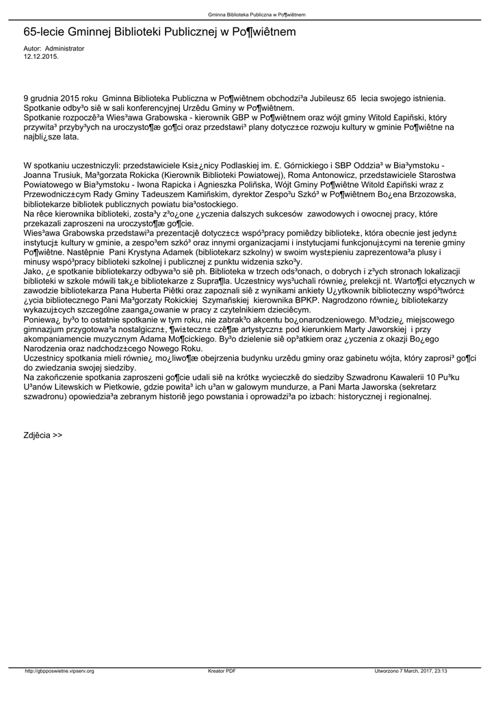 Gminna Biblioteka Publiczna w Po¶wiêtnem 65-lecie Gminnej Biblioteki Publicznej w Po¶wiêtnem Autor: Administrator 12.12.2015. 9 grudnia 2015 roku Gminna Biblioteka Publiczna w Po¶wiêtnem obchodzi³a Jubileusz 65 lecia swojego istnienia. Spotkanie odby³o siê w sali konferencyjnej Urzêdu Gminy w Po¶wiêtnem. Spotkanie rozpoczê³a Wies³awa Grabowska - kierownik GBP w Po¶wiêtnem oraz wójt gminy Witold £apiñski, który przywita³ przyby³ych na uroczysto¶æ go¶ci oraz przedstawi³ plany dotycz±ce rozwoju kultury w gminie Po¶wiêtne na najbli¿sze lata. W spotkaniu uczestniczyli: przedstawiciele Ksi±¿nicy Podlaskiej im. £. Górnickiego i SBP Oddzia³ w Bia³ymstoku Joanna Trusiuk, Ma³gorzata Rokicka (Kierownik Biblioteki Powiatowej), Roma Antonowicz, przedstawiciele Starostwa Powiatowego w Bia³ymstoku - Iwona Rapicka i Agnieszka Poliñska, Wójt Gminy Po¶wiêtne Witold £apiñski wraz z Przewodnicz±cym Rady Gminy Tadeuszem Kamiñskim, dyrektor Zespo³u Szkó³ w Po¶wiêtnem Bo¿ena Brzozowska, bibliotekarze bibliotek publicznych powiatu bia³ostockiego. Na rêce kierownika biblioteki, zosta³y z³o¿one ¿yczenia dalszych sukcesów zawodowych i owocnej pracy, które przekazali zaproszeni na uroczysto¶æ go¶cie. Wies³awa Grabowska przedstawi³a prezentacjê dotycz±c± wspó³pracy pomiêdzy bibliotek±, która obecnie jest jedyn± instytucj± kultury w gminie, a zespo³em szkó³ oraz innymi organizacjami i instytucjami funkcjonuj±cymi na terenie gminy Po¶wiêtne. Nastêpnie Pani Krystyna Adamek (bibliotekarz szkolny) w swoim wyst±pieniu zaprezentowa³a plusy i minusy wspó³pracy biblioteki szkolnej i publicznej z punktu widzenia szko³y. Jako, ¿e spotkanie bibliotekarzy odbywa³o siê ph. Biblioteka w trzech ods³onach, o dobrych i z³ych stronach lokalizacji biblioteki w szkole mówili tak¿e bibliotekarze z Supra¶la. Uczestnicy wys³uchali równie¿ prelekcji nt. Warto¶ci etycznych w zawodzie bibliotekarza Pana Huberta Piêtki oraz zapoznali siê z wynikami ankiety U¿ytkownik biblioteczny wspó³twórc± ¿ycia bibliotecznego Pani Ma³gorzaty Rokickiej Szymañskiej kierownika BPKP. Nagrodzono równie¿ bibliotekarzy wykazuj±cych szczególne zaanga¿owanie w pracy z czytelnikiem dzieciêcym. Poniewa¿ by³o to ostatnie spotkanie w tym roku, nie zabrak³o akcentu bo¿onarodzeniowego. M³odzie¿ miejscowego gimnazjum przygotowa³a nostalgiczn±, ¶wi±teczn± czê¶æ artystyczn± pod kierunkiem Marty Jaworskiej i przy akompaniamencie muzycznym Adama Mo¶cickiego. By³o dzielenie siê op³atkiem oraz ¿yczenia z okazji Bo¿ego Narodzenia oraz nadchodz±cego Nowego Roku. Uczestnicy spotkania mieli równie¿ mo¿liwo¶æ obejrzenia budynku urzêdu gminy oraz gabinetu wójta, który zaprosi³ go¶ci do zwiedzania swojej siedziby. Na zakoñczenie spotkania zaproszeni go¶cie udali siê na krótk± wycieczkê do siedziby Szwadronu Kawalerii 10 Pu³ku U³anów Litewskich w Pietkowie, gdzie powita³ ich u³an w galowym mundurze, a Pani Marta Jaworska (sekretarz szwadronu) opowiedzia³a zebranym historiê jego powstania i oprowadzi³a po izbach: historycznej i regionalnej. Zdjêcia >> http://gbpposwietne.vipserv.org Kreator PDF Utworzono 7 March, 2017, 23:13