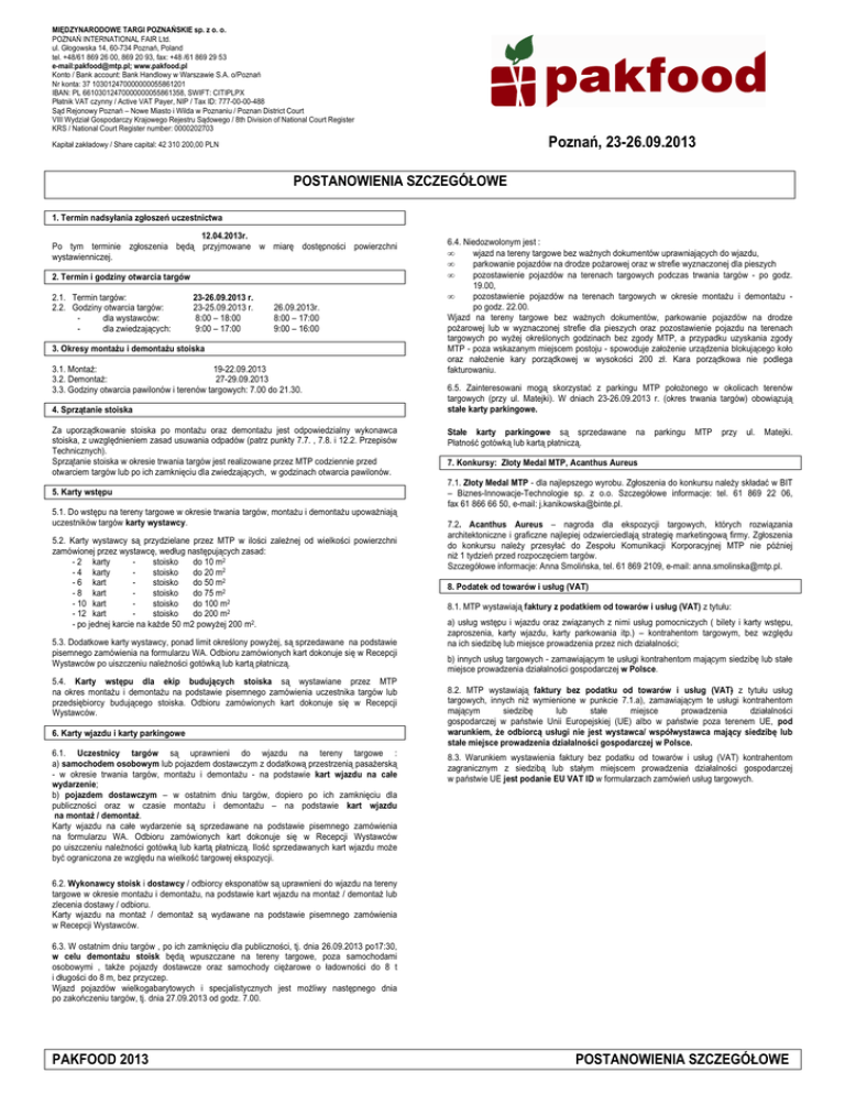 MIĘDZYNARODOWE TARGI POZNAŃSKIE sp. z o. o. POZNAŃ INTERNATIONAL FAIR Ltd. ul. Głogowska 14, 60-734 Poznań, Poland tel. +48/61 869 26 00, 869 20 93, fax: +48 /61 869 29 53 e-mail:[email protected]; www.pakfood.pl Konto / Bank account: Bank Handlowy w Warszawie S.A. o/Poznań Nr konta: 37 103012470000000055861201 IBAN: PL 66103012470000000055861358, SWIFT: CITIPLPX Płatnik VAT czynny / Active VAT Payer, NIP / Tax ID: 777-00-00-488 Sąd Rejonowy Poznań – Nowe Miasto i Wilda w Poznaniu / Poznan District Court VIII Wydział Gospodarczy Krajowego Rejestru Sądowego / 8th Division of National Court Register KRS / National Court Register number: 0000202703 Poznań, 23-26.09.2013 Kapitał zakładowy / Share capital: 42 310 200,00 PLN POSTANOWIENIA SZCZEGÓŁOWE 1. Termin nadsyłania zgłoszeń uczestnictwa 12.04.2013r. Po tym terminie zgłoszenia będą przyjmowane w miarę dostępności powierzchni wystawienniczej. 2. Termin i godziny otwarcia targów 2.1. Termin targów: 2.2. Godziny otwarcia targów: dla wystawców: dla zwiedzających: 23-26.09.2013 r. 23-25.09.2013 r. 8:00 – 18:00 9:00 – 17:00 26.09.2013r. 8:00 – 17:00 9:00 – 16:00 3. Okresy montażu i demontażu stoiska 3.1. Montaż: 19-22.09.2013 3.2. Demontaż: 27-29.09.2013 3.3. Godziny otwarcia pawilonów i terenów targowych: 7.00 do 21.30. 4. Sprzątanie stoiska Za uporządkowanie stoiska po montażu oraz demontażu jest odpowiedzialny wykonawca stoiska, z uwzględnieniem zasad usuwania odpadów (patrz punkty 7.7. , 7.8. i 12.2. Przepisów Technicznych). Sprzątanie stoiska w okresie trwania targów jest realizowane przez MTP codziennie przed otwarciem targów lub po ich zamknięciu dla zwiedzających, w godzinach otwarcia pawilonów. 5. Karty wstępu 5.1. Do wstępu na tereny targowe w okresie trwania targów, montażu i demontażu upoważniają uczestników targów karty wystawcy. 5.2. Karty wystawcy są przydzielane przez MTP w ilości zależnej od wielkości powierzchni zamówionej przez wystawcę, według następujących zasad: - 2 karty stoisko do 10 m2 - 4 karty stoisko do 20 m2 - 6 kart stoisko do 50 m2 - 8 kart stoisko do 75 m2 - 10 kart stoisko do 100 m2 - 12 kart stoisko do 200 m2 - po jednej karcie na każde 50 m2 powyżej 200 m2. 5.3. Dodatkowe karty wystawcy, ponad limit określony powyżej, są sprzedawane na podstawie pisemnego zamówienia na formularzu WA. Odbioru zamówionych kart dokonuje się w Recepcji Wystawców po uiszczeniu należności gotówką lub kartą płatniczą. 5.4. Karty wstępu dla ekip budujących stoiska są wystawiane przez MTP na okres montażu i demontażu na podstawie pisemnego zamówienia uczestnika targów lub przedsiębiorcy budującego stoiska. Odbioru zamówionych kart dokonuje się w Recepcji Wystawców. 6. Karty wjazdu i karty parkingowe 6.1. Uczestnicy targów są uprawnieni do wjazdu na tereny targowe : a) samochodem osobowym lub pojazdem dostawczym z dodatkową przestrzenią pasażerską - w okresie trwania targów, montażu i demontażu - na podstawie kart wjazdu na całe wydarzenie; b) pojazdem dostawczym – w ostatnim dniu targów, dopiero po ich zamknięciu dla publiczności oraz w czasie montażu i demontażu – na podstawie kart wjazdu na montaż / demontaż. Karty wjazdu na całe wydarzenie są sprzedawane na podstawie pisemnego zamówienia na formularzu WA. Odbioru zamówionych kart dokonuje się w Recepcji Wystawców po uiszczeniu należności gotówką lub kartą płatniczą. Ilość sprzedawanych kart wjazdu może być ograniczona ze względu na wielkość targowej ekspozycji. 6.4. Niedozwolonym jest : • wjazd na tereny targowe bez ważnych dokumentów uprawniających do wjazdu, • parkowanie pojazdów na drodze pożarowej oraz w strefie wyznaczonej dla pieszych • pozostawienie pojazdów na terenach targowych podczas trwania targów - po godz. 19.00, • pozostawienie pojazdów na terenach targowych w okresie montażu i demontażu po godz. 22.00. Wjazd na tereny targowe bez ważnych dokumentów, parkowanie pojazdów na drodze pożarowej lub w wyznaczonej strefie dla pieszych oraz pozostawienie pojazdu na terenach targowych po wyżej określonych godzinach bez zgody MTP, a przypadku uzyskania zgody MTP - poza wskazanym miejscem postoju - spowoduje założenie urządzenia blokującego koło oraz nałożenie kary porządkowej w wysokości 200 zł. Kara porządkowa nie podlega fakturowaniu. 6.5. Zainteresowani mogą skorzystać z parkingu MTP położonego w okolicach terenów targowych (przy ul. Matejki). W dniach 23-26.09.2013 r. (okres trwania targów) obowiązują stałe karty parkingowe. Stałe karty parkingowe są sprzedawane na parkingu MTP przy ul. Matejki. Płatność gotówką lub kartą płatniczą. 7. Konkursy: Złoty Medal MTP, Acanthus Aureus 7.1. Złoty Medal MTP - dla najlepszego wyrobu. Zgłoszenia do konkursu należy składać w BIT – Biznes-Innowacje-Technologie sp. z o.o. Szczegółowe informacje: tel. 61 869 22 06, fax 61 866 66 50, e-mail: [email protected]. 7.2. Acanthus Aureus – nagroda dla ekspozycji targowych, których rozwiązania architektoniczne i graficzne najlepiej odzwierciedlają strategię marketingową firmy. Zgłoszenia do konkursu należy przesyłać do Zespołu Komunikacji Korporacyjnej MTP nie później niż 1 tydzień przed rozpoczęciem targów. Szczegółowe informacje: Anna Smolińska, tel. 61 869 2109, e-mail: [email protected]. 8. Podatek od towarów i usług (VAT) 8.1. MTP wystawiają faktury z podatkiem od towarów i usług (VAT) z tytułu: a) usług wstępu i wjazdu oraz związanych z nimi usług pomocniczych ( bilety i karty wstępu, zaproszenia, karty wjazdu, karty parkowania itp.) – kontrahentom targowym, bez względu na ich siedzibę lub miejsce prowadzenia przez nich działalności; b) innych usług targowych - zamawiającym te usługi kontrahentom mającym siedzibę lub stałe miejsce prowadzenia działalności gospodarczej w Polsce. 8.2. MTP wystawiają faktury bez podatku od towarów i usług (