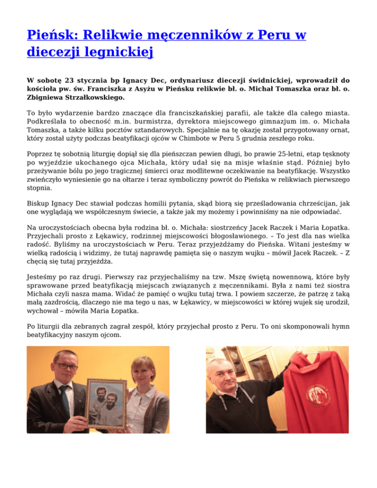 Pieńsk: Relikwie męczenników z Peru w diecezji legnickiej W sobotę 23 stycznia bp Ignacy Dec, ordynariusz diecezji świdnickiej, wprowadził do kościoła pw. św. Franciszka z Asyżu w Pieńsku relikwie bł. o. Michał Tomaszka oraz bł. o. Zbigniewa Strzałkowskiego. To było wydarzenie bardzo znaczące dla franciszkańskiej parafii, ale także dla całego miasta. Podkreślała to obecność m.in. burmistrza, dyrektora miejscowego gimnazjum im. o. Michała Tomaszka, a także kilku pocztów sztandarowych. Specjalnie na tę okazję został przygotowany ornat, który został użyty podczas beatyfikacji ojców w Chimbote w Peru 5 grudnia zeszłego roku. Poprzez tę sobotnią liturgię dopiął się dla pieńszczan pewien długi, bo prawie 25-letni, etap tęsknoty po wyjeździe ukochanego ojca Michała, który udał się na misje właśnie stąd. Później było przeżywanie bólu po jego tragicznej śmierci oraz modlitewne oczekiwanie na beatyfikację. Wszystko zwieńczyło wyniesienie go na ołtarze i teraz symboliczny powrót do Pieńska w relikwiach pierwszego stopnia. Biskup Ignacy Dec stawiał podczas homilii pytania, skąd biorą się prześladowania chrześcijan, jak one wyglądają we współczesnym świecie, a także jak my możemy i powinniśmy na nie odpowiadać. Na uroczystościach obecna była rodzina bł. o. Michała: siostrzeńcy Jacek Raczek i Maria Łopatka. Przyjechali prosto z Łękawicy, rodzinnej miejscowości błogosławionego. – To jest dla nas wielka radość. Byliśmy na uroczystościach w Peru. Teraz przyjeżdżamy do Pieńska. Witani jesteśmy w wielką radością i widzimy, że tutaj naprawdę pamięta się o naszym wujku – mówił Jacek Raczek. – Z chęcią się tutaj przyjeżdża. Jesteśmy po raz drugi. Pierwszy raz przyjechaliśmy na tzw. Mszę świętą nowennową, które były sprawowane przed beatyfikacją miejscach związanych z męczennikami. Była z nami też siostra Michała czyli nasza mama. Widać że pamięć o wujku tutaj trwa. I powiem szczerze, że patrzę z taką małą zazdrością, dlaczego nie ma tego u nas, w Łękawicy, w miejscowości w której wujek się urodził, wychował – mówiła Maria Łopatka. Po liturgii dla zebranych zagrał zespół, który przyjechał prosto z Peru. To oni skomponowali hymn beatyfikacyjny naszym ojcom. Jędrzej Rams, dziennikarz „Gościa Legnickiego”/red. foto: Jędrzej Rams /Foto Gość za: www.franciszkanie.pl