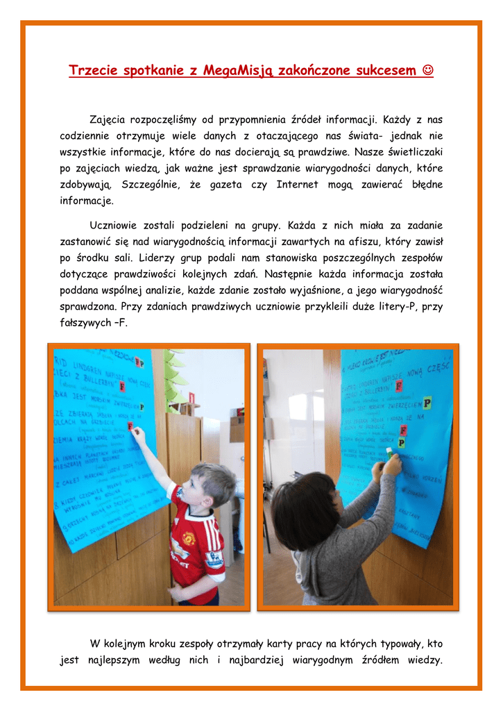 Trzecie spotkanie z MegaMisją zakończone sukcesem Zajęcia rozpoczęliśmy od przypomnienia źródeł informacji. Każdy z nas codziennie otrzymuje wiele danych z otaczającego nas świata- jednak nie wszystkie informacje, które do nas docierają są prawdziwe. Nasze świetliczaki po zajęciach wiedzą, jak ważne jest sprawdzanie wiarygodności danych, które zdobywają. Szczególnie, że gazeta czy Internet mogą zawierać błędne informacje. Uczniowie zostali podzieleni na grupy. Każda z nich miała za zadanie zastanowić się nad wiarygodnością informacji zawartych na afiszu, który zawisł po środku sali. Liderzy grup podali nam stanowiska poszczególnych zespołów dotyczące prawdziwości kolejnych zdań. Następnie każda informacja została poddana wspólnej analizie, każde zdanie zostało wyjaśnione, a jego wiarygodność sprawdzona. Przy zdaniach prawdziwych uczniowie przykleili duże litery-P, przy fałszywych –F. W kolejnym kroku zespoły otrzymały karty pracy na których typowały, kto jest najlepszym według nich i najbardziej wiarygodnym źródłem wiedzy. Zwyciężyła książka, wszystkie zespoły przyznały jej maksymalną ilość gwiazdek. Najsłabiej w tym „rankingu” wypadli rówieśnicy. Nasi uczniowie wiedzą w jaki sposób mogą potwierdzić jakąś informację. Potrafią także prawidłowo konstruować pytania, które mogliby zadać innym by ją potwierdzić. Czekamy na kolejne wyzwania. Wychowawcy świetlicy