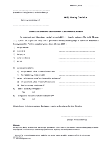 Oleśnica, dnia ............................... ...................................................................... (nazwisko i imię (imiona) wnioskodawcy) Wójt Gminy Oleśnica ...................................................................... (adres wnioskodawcy) ..................................................................... ZGŁOSZENIE ZAMIARU GŁOSOWANIA KORESPONDENCYJNEGO Na podstawie art. 53a ustawy z dnia 5 stycznia 2011 r. - Kodeks wyborczy (Dz. U. Nr 21, poz. 112, z późn. zm.) zgłaszam swój zamiar głosowania korespondencyjnego w wyborach Prezydenta Rzeczypospolitej Polskiej zarządzonych na dzień 10 maja 2015 r. 1) imię (imiona) ...................................................................... 2) nazwisko ...................................................................... 3) imię ojca ...................................................................... 4) data urodzenia ...................................................................... 5) PESEL ...................................................................... 6) adres zamieszkania: 7) 8) a) miejscowość, ulica, nr domu/mieszkania ...................................................................... b) kod pocztowy, miejscowość ...................................................................... adres, na który ma zostać wysłany pakiet wyborczy* a) miejscowość, ulica, nr domu/mieszkania ...................................................................... b) kod pocztowy, miejscowość ...................................................................... odbiór osobisty w Urzędzie** TAK 9) NIE dołączenie nakładki w alfabecie Braille'a** TAK NIE Oświadczam, że jestem wpisany do stałego rejestru wyborców w Gminie Oleśnica. ............................................................ (podpis wnioskodawcy) UWAGI: Do wyborcy, który przed dniem pierwszego głosowania zgłosił zamiar głosowania korespondencyjnego, również w przypadku ewentualnego ponownego głosowania, wysłany zostanie pakiet wyborczy. * Wypełnić w przypadku gdy adres, na który ma zostać wysłany pakiet wyborczy różni się od adresu zamieszkania ** Właściwe podkreślić