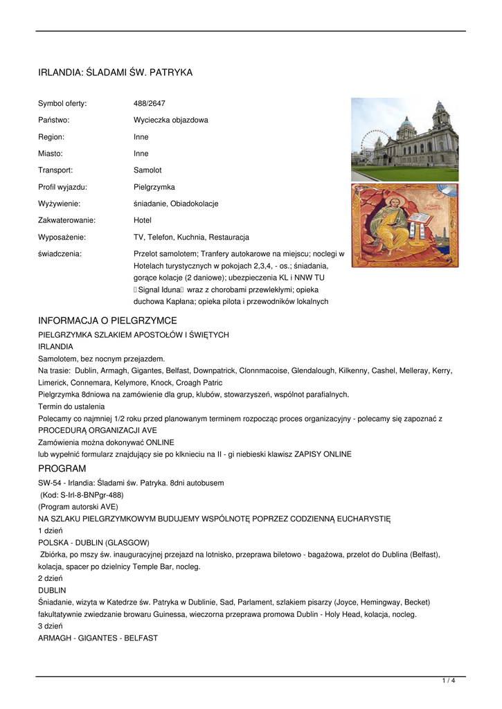 Zbiórka, po mszy św. inauguracyjnej przejazd na lotnisko, przeprawa biletowo - bagażowa, przelot do Dublina (Belfast),
