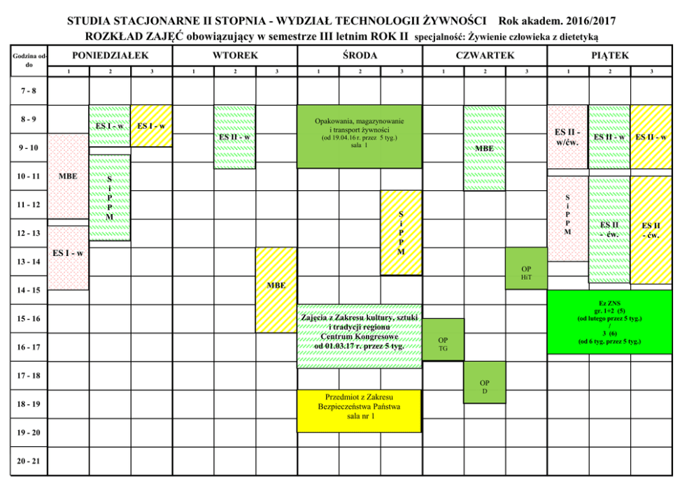 STUDIA STACJONARNE II STOPNIA - WYDZIAŁ TECHNOLOGII ŻYWNOŚCI Rok akadem. 2016/2017 ROZKŁAD ZAJĘĆ obowiązujący w semestrze III letnim ROK II specjalność: Żywienie człowieka z dietetyką PONIEDZIAŁEK Godzina oddo 1 ŚRODA WTOREK 2 3 ES I - w ES I - w 1 2 3 1 PIĄTEK CZWARTEK 2 3 1 2 3 1 2 3 ES II w/ćw. ES II - w ES II - w ES II - ćw. ES II - ćw. 7-8 8-9 Opakowania, magazynowanie i transport żywności ES II - w (od 19.04.16 r. przez 5 tyg.) sala 1 9 - 10 10 - 11 MBE 11 - 12 S i P P M S i P P M S i P P M 12 - 13 13 - 14 MBE ES I - w OP HiT 14 - 15 15 - 16 16 - 17 MBE Zajęcia z Zakresu kultury, sztuki i tradycji regionu Centrum Kongresowe od 01.03.17 r. przez 5 tyg. 17 - 18 18 - 19 19 - 20 20 - 21 Ez ZNS gr. 1+2 (5) (od lutego przez 5 tyg.) / 3 (6) (od 6 tyg. przez 5 tyg.) OP TG OP Przedmiot z Zakresu Bezpieczeństwa Państwa sala nr 1 D OBJAŚNIENIA: ŻCZzD II rok, III sem. EzZNS - Elektyw z zakresu nauk społecznych: Komunikacja w zarządzaniu – ćwiczenia sala nr 1.41. Katedry Technologii Owoców, Warzyw i Grzybów ZzZK,SiTR - Zajęcia z zakresu kultury, sztuki i tradycji regionu – Budynek Wydziały Leśnego - Centrum kongresowe, al. 29 Listopada 46 (od 01.03.17 r. przez 5 tyg.) PzZBP - Przedmiot z zakresu bezpieczeństwa państwa: Bezpieczeństwo narodowe - wykład sala 1 (od lutego przez 8 tyg.) 1. Technologia gastronomiczna SDiPM – Seminarium dyplomowe i praca magisterska – sala 0.111 Elektyw specjalizacyjny I (wykład): Żywienie a zdrowie człowieka – sala 0.111 (od 10 tyg. sem. przez 5 tyg.) Elektyw specjalizacyjny II (wykład): Edukacja żywieniowa – sala 0.111 (lutego przez 5 tyg.) Elektyw specjalizacyjny II (ćwiczenia): Edukacja żywieniowa – sala 0.111 (od 6 tyg. przez 5 tyg.) OP: Opakowania … ćw. – od. 19.04.17 r. przez 8 tyg. sala 1.104 KŻCz MBE – Metody badań eksperymentalnych – sala własna 3. Higiena i toksykologia żywności SDiPM – Seminarium dyplomowe i praca magisterska – sala 1.87 Elektyw specjalizacyjny I (wykład): Żywienie a zdrowie człowieka. Przewlekłe choroby niezakaźne – sala 1.87 (1 poł. sem przez 8 tyg.) Elektyw specjalizacyjny II (wykład): Dietetyka II - sala 1.1 (1 poł sem. 28.02.17 r.) – sala 1.104 (1 poł sem. 03.03.17 r.) Elektyw specjalizacyjny II (ćwiczenia): Dietetyka II – sala 1.105/1.102 termin do ustalenia z prowadzącym OP: Opakowania … ćw. – od. 19.04.17 r. przez 8 tyg. sala 1.105 KŻCz MBE – Metody badań eksperymentalnych – sala własna 2. Dietetyka SDiPM – Seminarium dyplomowe i praca magisterska – sala 1.87 Elektyw specjalizacyjny I (wykład): Dietoprofilaktyka. Choroby niezakaźne żywieniowo-zależne – sala 1.87 (2 poł. sem przez 8 tyg.) Elektyw specjalizacyjny II (wykład): Leczenie żywieniowe w wybranych jednostkach chorobowych – sala 1.87 (1 poł sem. przez 5 tyg.) Elektyw specjalizacyjny II (ćwiczenia): Leczenie żywieniowe w wybranych jednostkach chorobowych – sala 1.105 (1 poł. sem. przez 3 tyg.) OP: Opakowania … ćw. – od. 19.04.17 r. przez 8 tyg. sala 1.104 KŻCz MBE – Metody badań eksperymentalnych – sala własna