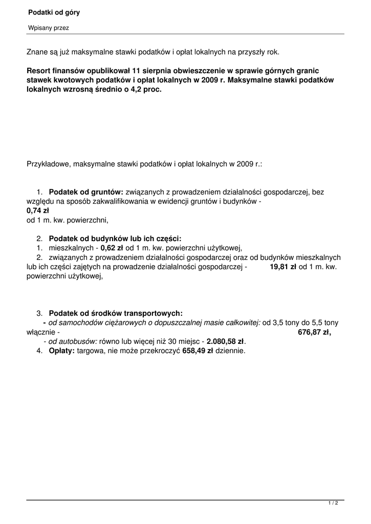 Podatki od góry Wpisany przez Znane są już maksymalne stawki podatków i opłat lokalnych na przyszły rok. Resort finansów opublikował 11 sierpnia obwieszczenie w sprawie górnych granic stawek kwotowych podatków i opłat lokalnych w 2009 r. Maksymalne stawki podatków lokalnych wzrosną średnio o 4,2 proc. Przykładowe, maksymalne stawki podatków i opłat lokalnych w 2009 r.: 1. Podatek od gruntów: związanych z prowadzeniem działalności gospodarczej, bez względu na sposób zakwalifikowania w ewidencji gruntów i budynków 0,74 zł od 1 m. kw. powierzchni, 2. Podatek od budynków lub ich części: 1. mieszkalnych - 0,62 zł od 1 m. kw. powierzchni użytkowej, 2. związanych z prowadzeniem działalności gospodarczej oraz od budynków mieszkalnych lub ich części zajętych na prowadzenie działalności gospodarczej 19,81 zł od 1 m. kw. powierzchni użytkowej, 3. Podatek od środków transportowych: - od samochodów ciężarowych o dopuszczalnej masie całkowitej: od 3,5 tony do 5,5 tony włącznie 676,87 zł, - od autobusów: równo lub więcej niż 30 miejsc - 2.080,58 zł. 4. Opłaty: targowa, nie może przekroczyć 658,49 zł dziennie. 1/2 Podatki od góry Wpisany przez Obwieszczenie MF: plik pdf Więcej: www.samorzad.pap.pl 2/2