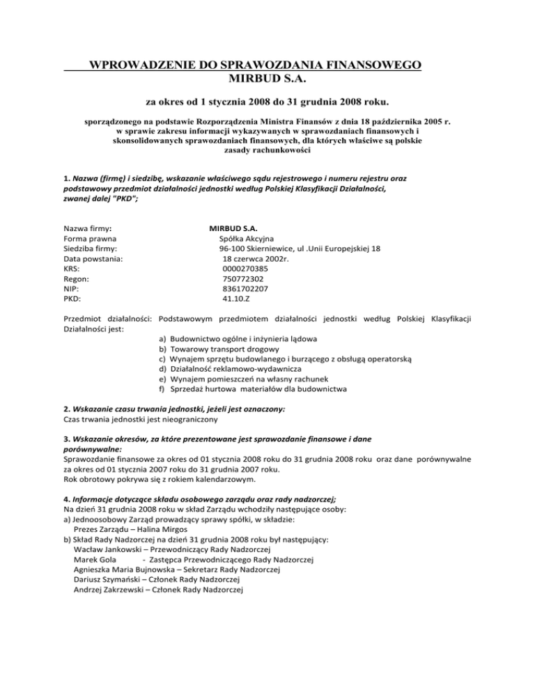 WPROWADZENIE DO SPRAWOZDANIA FINANSOWEGO MIRBUD S.A. za okres od 1 stycznia 2008 do 31 grudnia 2008 roku. sporządzonego na podstawie Rozporządzenia Ministra Finansów z dnia 18 października 2005 r. w sprawie zakresu informacji wykazywanych w sprawozdaniach finansowych i skonsolidowanych sprawozdaniach finansowych, dla których właściwe są polskie zasady rachunkowości 1. Nazwa (firmę) i siedzibę, wskazanie właściwego sądu rejestrowego i numeru rejestru oraz podstawowy przedmiot działalności jednostki według Polskiej Klasyfikacji Działalności, zwanej dalej "PKD"; Nazwa firmy: Forma prawna Siedziba firmy: Data powstania: KRS: Regon: NIP: PKD: MIRBUD S.A. Spółka Akcyjna 96-100 Skierniewice, ul .Unii Europejskiej 18 18 czerwca 2002r. 0000270385 750772302 8361702207 41.10.Z Przedmiot działalności: Podstawowym przedmiotem działalności jednostki według Polskiej Klasyfikacji Działalności jest: a) Budownictwo ogólne i inżynieria lądowa b) Towarowy transport drogowy c) Wynajem sprzętu budowlanego i burzącego z obsługą operatorską d) Działalność reklamowo-wydawnicza e) Wynajem pomieszczeń na własny rachunek f) Sprzedaż hurtowa materiałów dla budownictwa 2. Wskazanie czasu trwania jednostki, jeżeli jest oznaczony: Czas trwania jednostki jest nieograniczony 3. Wskazanie okresów, za które prezentowane jest sprawozdanie finansowe i dane porównywalne: Sprawozdanie finansowe za okres od 01 stycznia 2008 roku do 31 grudnia 2008 roku oraz dane porównywalne za okres od 01 stycznia 2007 roku do 31 grudnia 2007 roku. Rok obrotowy pokrywa się z rokiem kalendarzowym. 4. Informacje dotyczące składu osobowego zarządu oraz rady nadzorczej; Na dzień 31 grudnia 2008 roku w skład Zarządu wchodziły następujące osoby: a) Jednoosobowy Zarząd prowadzący sprawy spółki, w składzie: Prezes Zarządu – Halina Mirgos b) Skład Rady Nadzorczej na dzień 31 grudnia 2008 roku był następujący: Wacław Jankowski – Przewodniczący Rady Nadzorczej Marek Gola - Zastępca Przewodniczącego Rady Nadzorczej Agnieszka Maria Bujnowska – Sekretarz Rady Nadzorczej Dariusz Szymański – Członek Rady Nadzorczej Andrzej Zakrzewski – Członek Rady Nadzorczej 5. Wskazanie, czy sprawozdanie finansowe i dane porównywalne zawierają dane łączne – jeżeli w skład przedsiębiorstwa wchodzą wewnętrzne jednostki organizacyjne sporządzające samodzielne sprawozdania finansowe W niniejszym sprawozdaniu za lata obrotowe: 2007r. oraz 2008r. nie wchodziły jednostki samodzielnie sporządzające sprawozdania finansowe 6. Wskazanie, czy przedsiębiorstwo jest jednostką dominującą lub znaczącym inwestorem oraz czy sporządza skonsolidowane sprawozdanie finansowe Przedsiębiorstwo jest jednostką dominującą i sporządza skonsolidowane sprawozdanie finansowe, w skład którego wchodzą jednostkowe sprawozdania MIRBUD S.A. oraz jednostki zależnej JHM Development Spółka z o.o. Spółka JHM DEVELOPMENT została zarejestrowana w rejestrze przedsiębiorców w dniu 06.06.2008 roku pod numerem KRS 0000307631. MIRBUD S.A. posiada 100% udziałów w jednostce zależnej. Udziały zostały w całości pokryte gotówką. 7. W przypadku sprawozdania finansowego sporządzonego za okres, w czasie którego nastąpiło połączenie spółek - wskazanie, że jest to sprawozdanie finansowe sporządzone po połączeniu oraz wskazanie zastosowanej metody rozliczenia połączenia; Nie dotyczy 8. Wskazanie, czy sprawozdanie finansowe zostało sporządzone przy założeniu kontynuowania działalności gospodarczej w dającej się przewidzieć przyszłości oraz czy nie istnieją okoliczności wskazujące na zagrożenie kontynuowania działalności; Roczne sprawozdanie finansowe zostało sporządzone przy założeniu kontynuowania działalności gospodarczej jednostki w dającej się przewidzieć przyszłości oraz nie istnieją okoliczności wskazujące na zagrożenie kontynuowania działalności 9. Stwierdzenie, że sprawozdania finansowe podlegały przekształceniu w celu zapewnienia porównywalności danych, a zestawienie i objaśnienie różnic, będących wynikiem korekt z tytułu zmian zasad (polityki) rachunkowości lub korekt błędów podstawowych, zostało zamieszczone w dodatkowej nocie objaśniającej; Sprawozdania finansowe nie podlegały przekształceniu. 10. Wskazanie, czy w przedstawionym sprawozdaniu finansowym lub danych porównywalnych dokonano korekt wynikających z zastrzeżeń w opiniach podmiotów uprawnionych do badania o sprawozdaniach finansowych za lata, za które sprawozdanie finansowe lub dane porównywalne zostały zamieszczone w prospekcie W niniejszym sprawozdaniu finansowym nie dokonano korekt wynikających z zastrzeżeń w opiniach podmiotów uprawnionych do badania sprawozdań finansowych, gdyż opinie wydane przez niezależnych biegłych rewidentów wydano bez zastrzeżeń. 11. Opis przyjętych zasad (polityki) rachunkowości, w tym metod wyceny aktywów i pasywów, ustalenia przychodów, kosztów i wyniku finansowego oraz sposobu sporządzenia sprawozdania finansowego i danych porównywalnych Sprawozdania finansowe zostały sporządzone w oparciu o przepisy Ustawy z dnia 29 września 1994 roku o rachunkowości wraz z późniejszymi zmianami oraz o Polityką rachunkowości firmy z dnia 10 lipca 2004 roku. Zasady obowiązujące przy sporządzaniu sprawozdania nie odbiegały od niżej opisanych zasad. Wszystkie dane zaprezentowano w złotych, o ile nie zaznaczono inaczej. Jednostka sporządza: 1. rachunek zysków i strat w wariancie kalkulacyjnym. 2. rachunek przepływów pieniężnych sporządzany jest metodą pośrednią. 11.1 Rzeczowe aktywa trwałe, wartości niematerialne i prawne Rzeczowe aktywa trwałe wycenione są według cen nabycia lub kosztów wytworzenia pomniejszonych o odpisy amortyzacyjne. Środki trwałe o wartości początkowej nie przekraczającej 3 500 zł oraz przewidywanym okresie użytkowania poniżej jednego roku mogą być jednorazowo amor