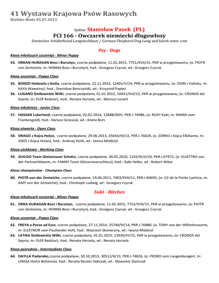 41 Wystawa Krajowa Psów Rasowych Bielsko-Biała 05.07.2015 Sędzia: Stanisław Pasek (PL) FCI 166 - Owczarek niemiecki długowłosy Deutscher Schäferhund Langstockhaar / German Shepherd Dog Long and harsh outer coat Psy - Dogs Klasa młodszych szczeniąt - Minor Puppy 54. ORKAN HURAGAN Boss i Bursztyn, czarne podpalane, 11.02.2015, 7751/XVII/15, PKR w przygotowaniu, (o: PIOTR von Zenteiche, m: HONNA Boss i Bursztyn), hod.: Grzegosz Czyruk, wł.: Grzegorz Czyruk Klasa szczeniąt - Puppy Class 55. BONZO Hodowla z Koźla, czarne podpalane, 22.11.2014, 12401/V/14, PKR w przygotowaniu, (o: ODIN z Folinku, m: KAYA Wawelno), hod.: Stanisław Bonczyński, wł.: Krzysztof Papież 56. LUGANO Śmiłowickie Wilki, czarne podpalane, 01.01.2015, 10431/XVI/15, PKR w przygotowaniu, (o: CRONOS del Seprio, m: FLER Redstar), hod.: Renata Horzela, wł.: Mariusz Lenert Klasa młodzieży - Junior Class 57. HASSAN Luberland, czarne podpalane, 02.02.2014, 12688/XXIV, PKR.I-74986, (o: ROKY Kabi, m: KIMMI vom Frankengold), hod.: Dariusz Grzesiuk, wł.: Aneta Bors Klasa otwarta - Open Class 58. DRAGO z Kojca Holan, czarne podpalane, 29.06.2013, 25643/III/13, PKR.I-76028, (o: ZORKO z Kojca Elbikame, m: JOKO z Kojca Holan), hod.: Andrzej Holik, wł.: Iwona Miździoł Klasa użytkowa - Working Class 59. GUILDO Team Gleisenauer Scholss, czarne podpalane, 30.05.2010, 1242/XLVI/10, PKR.I-67972, (o: OUATTRO von der Partnachklamm, m: FANNY Team Gleisenauerschloss), hod.: Gabi Heller, wł.: Robert Wikar Klasa championów - Champion Class 60. PIOTR von der Zenteiche, czarne podpalane, 19.06.2011, 7403/XVII/11, PKR.I-69692, (o: U2 de la Petite Laeticia, m: AMY von der Zenteiche), hod.: Christoph Ludwig, wł.: Grzegorz Czyruk Suki - Bitches Klasa młodszych szczeniąt - Minor Puppy 61. ORKA HURAGAN Boss i Bursztyn, czarne podpalane, 11.05.2015, 7752/XVII/15, PKR w przygotowaniu, (o: PIOTR von Zenteiche, m: HONNA Boss i Bursztyn), hod.: Grzegosz Czyruk, wł.: Grzegorz Czyruk Klasa szczeniąt - Puppy Class 62. FREYA a Posse ad Esse, czarne podpalane, 27.11.2014, 25740/III/14, PKR.I-76880, (o: TONY von der Wilhelmswarte, m: ELLEYNOR vom Paullander Hof), hod.: Wojciech Skoneczny, wł.: Iwona Miździoł 63. LATIKA Śmiłowickie Wilki, czarne podpalane, 01.01.2015, 13930/IV/15, PKR w przygotowaniu, (o: CRONOS del Seprio, m: FLER Redstar), hod.: Renata Horzela, wł.: Renata Horzela Klasa pośrednia - Intermediate Class 64. DAYLLA Padaroko, czarne podpalane, 30.10.2013, 30512/II/13, PKR.I-74826, (o: PEDRO vom Langenbungert, m: UNIQA Hartis Bohemia), hod.: Renata Reuter-Sobczak, wł.: Sławomir Stańczyk 65. FARINA Andomi Poland,czarne podpalane, 02.01.2014, 12075/V/14, PKR.I-74929, (o: KWANTUM Kenola, m: HILDE vom Fichtenschlag), hod.: Dorota Pikulska, wł.: Aleksandra Demczyszyn 66. HUNDA Wlaldrudel von der Negra, czarne podpalane, 04.04.2014, 7723/XVII/14, PKR.I-77338, (o: PIOTR von Zenteiche, m: LAMA Linabero), hod.: Barbara Czyruk, wł.: Grzegorz Czyruk 67. MEGAN z Sachary, czarne podpalane, 06.09.2013, 12247/V/13, PKR.I-76694, (o: GIO vom Muhlenteich, m: HANIA z Sachary), hod.: Artur Śliczny, wł.: Stanisław Kubisty Klasa otwarta - Open Class 68. A-HRABINA Nieprzetary Szlak, czarne podpalane, 03.06.2013, 7568/XVII/13, PKR.I-73649, (o: PIOTR von Zenteiche, m: HONDA Linabero), hod.: Rafał Głowacki, wł.: Grzegorz Czyruk 69. HORSE'A Boss i Bursztyn, czarne podpalane, 05.04.2012, 7475/XVII/12, PKR.I-71397, (o: EMIL Nova Jamina, m: HONDA Linabero), hod.: Grzegosz Czyruk, wł.: Grzegorz Czyruk Sędzia: Stanisław Pasek (PL) FCI 166 - Owczarek niemiecki krótkowłosy Deutscher Schäferhund Stockhaar / German Shepherd Dog Double coat Psy - Dogs Klasa młodszych szczeniąt - Minor Puppy 70. DUX Wilk Hajera, czarne podpalane, 10.01.2015, 12317/V/15, PKR.I-77193, (o: MAFFEY vom Quartier Latin, m: IRIS Ontopus), hod.: Tadeusz Smaza, wł.: Tadeusz Smaza 71. YUKO z Tomickich Lasów, czarne podpalane, 07.01.2015, 12331/V/15, PKR.I-77311, (o: FRITZ vom Kuckucksland, m: TOOTSIE Tensor), hod.: Radosław Rokitka, wł.: Marcin Halski Klasa młodzieży - Junior Class 72. DRACO Śmiłowickie Wilki, czarne podpalane, 23.07.2014, 13908/V/14, PKR.I-77280, (o: CHIRO Śmiłowickie Wilki, m: SMARTIE vom Zellwaldrand), hod.: Renata Horzela, wł.: Jacek Szwed 73. OMEN z Domu Żyrków, czarne podpalane, 22.01.2014, 12022/V/14, PKR.I-74252, (o: FULZ di Zenevredo, m: KIA z Domu Żyrków), hod.: Józef Żyrek, wł.: Józef Żyrek Klasa pośrednia - Intermediate Class 74. NERO z Domu Żyrków ,czarne podpalane, 12.12.2013, 12027/V/13, PKR.I-74351, (o: LEX Marco Carras, m: ETNA z Jurajskiego Źródła), hod.: Józef Żyrek, wł.: Józef Żyrek Klasa otwarta - Open Class 75. TROJAN z Tomickich Lasów, czarne podpalane, 17.04.2013, 12249/V/13, PKR.I-76693, (o: SCHUMANN von Tronje, m: TOOTSIE Tensor), hod.: Radosław Rokitka, wł.: Patrycja Pagieła-Piątek 76. TYSON z Tomickich Lasów, czarne podpalane, 17.04.2013, 11881/V/13, PKR.I-73350, (o: SCHUMANN von Tronje, m: TOOTSIE Tensor), hod.: Radosław Rokitka, wł.: Radosław Rokitka Klasa użytkowa - Working Class 77. EIKO z Tomickich Lasów, czarne podpalane, 28.01.2009, 10838/V/09, PKR.I-66113, (o: YOKER vom Leithawald, m: ZORA z Tomickich Lasów), hod.: Radosław Rokitka, wł.: Paweł Ponikiewski 78. ESKO z Tomickich Lasów, czarne podpalane, 28.01.2009, 10526/V/09, PKR.I-64244, (o: YOKER vom Leithawald, m: ZORA z Tomickich Lasów), hod.: Radosław Rokitka, wł.: Monika Walczak Suki – Bitches Klasa młodszych szczeniąt - Minor Puppy 79. DIRMA Jarkowski Dwór, czarne , 26.01.2015, 12402/V15, PKR w przygotowaniu, (o: ZIDAN of Folkish Fest, m: BORA Jarkowski Dwór), hod.: Jarosław Opozda, wł.: Aleksandra Demczyszyn 80. MIYA von Gran Peregrino, wilczaste, 22.02.2015, 12400/V15, PKR w przygotowaniu, (o: DEMETRI Temperton, m: RYTSUKA de Peregrino), hod.: Alexander Moscoa Zeledon, wł.: Anna Ćwiklicka – Kocjan Klasa szczeniąt - Puppy Class 81. FORTUNE von Bad-Boll, czarne podpalane, 26.10.2014, 6043/XXXVI/