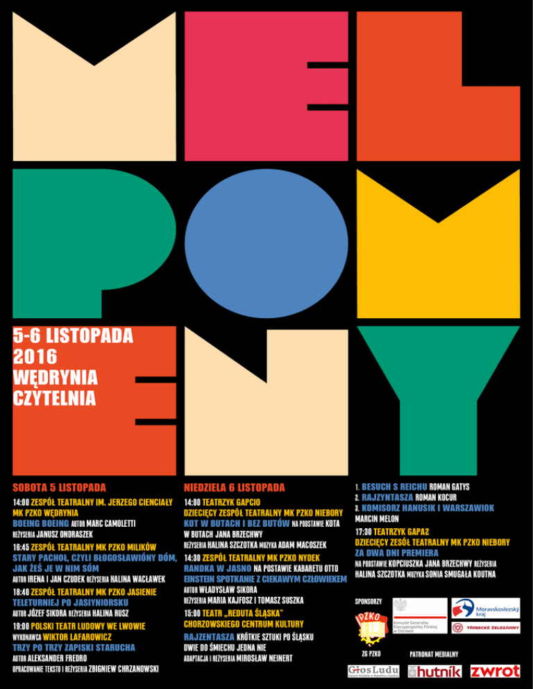 5-6 LISTOPADA 2016 WĘDRYNIA CZYTELNIA SOBOTA 5 LISTOPADA NIEDZIELA 6 LISTOPADA 14:00 ZESPÓŁ TEATRALNY IM. JERZEGO CIENCIAŁY MK PZKO WĘDRYNIA BOEING BOEING AUTOR MARC CAMOLETTI REŻYSERIA JANUSZ ONDRASZEK 16:45 ZESPÓŁ TEATRALNY MK PZKO MILIKÓW STARY PACHOŁ, CZYLI BŁOGOSŁAWIÓNY DÓM, JAK ŻEŚ JE W NIM SÓM AUTOR IRENA I JAN CZUDEK REŻYSERIA HALINA WACŁAWEK 18:40 ZESPÓŁ TEATRALNY MK PZKO JASIENIE TELETURNIEJ PO JASIYNIORSKU AUTOR JÓZEF SIKORA REŻYSERIA HALINA RUSZ 19:00 POLSKI TEATR LUDOWY WE LWOWIE WYKONAWCA WIKTOR LAFAROWICZ TRZY PO TRZY ZAPISKI STARUCHA AUTOR ALEKSANDER FREDRO OPRACOWANIE TEKSTU I REŻYSERIA ZBIGNIEW CHRZANOWSKI 14:00 TEATRZYK GAPCIO DZIECIĘCY ZESPÓŁ TEATRALNY MK PZKO NIEBORY KOT W BUTACH I BEZ BUTÓW NA PODSTAWIE KOTA W BUTACH JANA BRZECHWY REŻYSERIA HALINA SZCZOTKA MUZYKA ADAM MACOSZEK 14:30 ZESPÓŁ TEATRALNY MK PZKO NYDEK RANDKA W JASNO NA POSTAWIE KABARETU OTTO EINSTEIN SPOTKANIE Z CIEKAWYM CZŁOWIEKEM AUTOR WŁADYSŁAW SIKORA REŻYSERIA MARIA KAJFOSZ I TOMASZ SUSZKA 15:00 TEATR „REDUTA ŚLĄSKA” CHORZOWSKIEGO CENTRUM KULTURY RAJZENTASZA KRÓTKIE SZTUKI PO ŚLĄSKU DWIE DO ŚMIECHU JEDNA NIE ADAPTACJA I REŻYSERIA MIROSŁAW NEINERT 1. BESUCH S REICHU ROMAN GATYS 2. RAJZYNTASZA ROMAN KOCUR 3. KOMISORZ HANUSIK I WARSZAWIOK MARCIN MELON 17:30 TEATRZYK GAPA2 DZIECIĘCY ZESÓŁ TEATRALNY MK PZKO NIEBORY ZA DWA DNI PREMIERA NA PODSTAWIE KOPCIUSZKA JANA BRZECHWY REŻYSERIA HALINA SZCZOTKA MUZYKA SONIA SMUGAŁA KOUTNA SPONSORZY ZG PZKO PATRONAT MEDIALNY TŘINECKÝ TRZYNIECKI