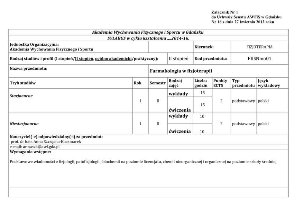 Załącznik Nr 1 do Uchwały Senatu AWFiS w Gdańsku Nr 16 z dnia 27 kwietnia 2012 roku Akademia Wychowania Fizycznego i Sportu w Gdańsku SYLABUS w cyklu kształcenia ....2014-16. Jednostka Organizacyjna: Akademia Wychowania Fizycznego i Sportu Rodzaj studiów i profil (I stopień/II stopień, ogólno akademicki/praktyczny): Nazwa przedmiotu: Tryb studiów II stopień Kod przedmiotu: FIISNmo01 Farmakologia w fizjoterapii Rok Semestr Rodzaj zajęć wykłady Stacjonarne 1 II 1 Liczba godzin Typ Język przedmiotu wykładowy 2 podstawowy polski 2 podstawowy polski 10 II ćwiczenia Punkty ECTS 15 15 ćwiczenia wykłady Niestacjonarne FIZJOTERAPIA Kierunek: 10 Nauczyciel(-e) odpowiedzialny(-i) za przedmiot: prof. dr hab. Anna Szczęsna-Kaczmarek e-mail: [email protected] Wymagania wstępne: Podstawowe wiadomości z fizjologii, patofizjologii , biochemii na poziomie licencjatu, chemii nieorganicznej i organicznej na poziomie szkoły średniej Cele przedmiotu: Zapoznanie z podstawową wiedzą dotycząca postaci leków, losów leków w organizmie i reakcji organizmu na lek w zależności od wieku. W oparciu o wiedzę podstawową zapoznanie z lekami stosowanymi w zabiegach fizjoterapeutycznych, możliwością interakcji z innymi lekami i suplementami diety. Opis efektów kształcenia dla przedmiotu oraz ich powiązanie z efektami kształcenia dla kierunku: Fizjoterapia WIEDZA Posiada wiedzę i umiejętności pozwalające wykorzystać właściwości określające grupy leków w zabiegach fizykoterapeutycznych w różnych jednostkach chorobowych. Wie, iż niektóre zabiegi W01 stosowane w fizjoterapii , u ludzi przyjmujących przewlekle określone leki mogą nie dawać zamierzonych efektów. Posiada wiedzę o zdrowiu związaną z niewłaściwym stosowaniem leków a w szczególności stosowaniu leków i suplementów oraz produktów żywnościowych dających wzajemne interakcje. W02 Posiada wiedzę pozwalającą na partnerską dyskusję z lekarzem prowadzącym zasadnicze postępowanie lecznicze u pacjenta skierowanego do zabiegów fizjoterapeutycznych Zna i rozumie zagadnienia oraz potrafi posługiwać się terminologią z zakresu nauk medycznych do W03 których należy farmakologia UMIEJĘTNOŚCI Analizuje wpływ leków na organizm człowieka Potrafi krytycznie interpretować informacje z piśmiennictwa oraz wyciągać krytyczne wnioski z badań U01 dotyczących wykorzystania leków w zabiegach fizjoterapeutycznych i suplementów diety. U02 U03 Potrafi wykorzystać poglądy innych specjalistów przy formułowaniu opinii na temat określonego postępowania usprawniającego w zakresie określonych grup leków stosowanych w tym postępowaniu Posiada umiejętności inicjowania , organizowania i realizowania działań ukierunkowanych na edukację zdrowotną w zakresie stosowania suplementów diety i leków z grupy OTC. K_W02… K_W03… K_W25… K_U15 K_U18… K_ U19 KOMPETENCJE K01 K02 Jest świadomy potrzeby uzupełniania i doskonalenia wiedzy w zakresie nowych leków , mechanizmu ich działania i zastosowania w postępowaniu fizjoterapeutycznym Potrafi określić priorytety i przestrzegać zasad etycznych w decyzjach i działaniach podejmowanych w stosunku do pacjenta K_K02… K_K05 K03 Promuje zachowania zdrowotne w działalności edukacyjnej i środowisku lokalnym K_K11 Kryteria i metody oceny osiągniętych efektów kształcenia: Weryfikacja efektów kształcenia W1,W2, W3, U1,U2 w zakresie wiedzy i umiejętności odbywa się na podstawie obecności na ćwiczeniach, dyskusji w trakcie omawiania zagadnień objętych programem w odniesieniu do sytuacji podawania leków z wykorzystaniem metod fizykoterapii np. jonoforezy . Rozwiązywania problemów związanych z polipragmazją , stosowaniem w sposób niekontrolowany leków NLPZ nie objętych kontrolą lekarza lub suplementów żywieniowych. Powyższa weryfikacja jest bieżącą oceną formującą, która służy bezpośrednio procesowi kształcenia. Pozwala dobierać narzędzia poprawiające efektywność procesu kształcenia. Po zakończeniu cyklu ćwiczeń i wykładów przeprowadzone będą pisemne lub ustne dwa kolokwia. Materiał objęty programem i realizowany w formie ćwiczeń będzie podzielony w porządku chronologicznym na dwie części. W oparciu o pytania rozwinięte, otwarte , oceniony będzie stopień przyswojenia materiału i umiejętności wykorzystania wiedzy w postępowaniu fizjoterapeutycznym. Pytania będą formułowane tak , by zweryfikować całościowo opisane wyżej efekty kształcenia, Odpowiedzi na pytania stawiane na kolokwium oceniane są w skali od 0-5 punktów. Student uzyska pozytywne oceny na podstawie 60% i więcej możliwych do zdobycia punktów. Student po zaliczeniu ćwiczeń przystąpi do pisemnego egzaminu. Pytania formułowane będą tak, by zweryfikować całość efektów kształcenia dotyczących wiedzy i umiejętności wynikających z założeń programowych. Odpowiedzi na pytania stawiane na egzaminie oceniane są w skali od 0-5 punktów. Student uzyska pozytywne oceny na podstawie 60% i więcej możliwych do zdobycia punktów. Metody i formy realizacji przedmiotu: Wykład problemowe z prezentacją multimedialną Wykłady – podanie wiedzy aktualnej, opartej o publikacje i podręczniki, opracowanej przez nauczyciela w formie prezentacji PowerPoint , z wykorzystaniem upraszczających i ułatwiających zrozumienie schematów i wykresów oraz podsumowujących wiedzę w zestawieniu tabelarycznym . Ćwiczenia – zajęcia prowadzone w formie konwersatoryjnej. Nauczyciel rozwija nowe treści w nawiązaniu do wiedzy wcześnie podanej studentowi. Student uczestniczy w dyskusji , której treści są ukierunkowane na konkretne spostrzeżenia studenta dotyczące reakcji jego organizmu na leki oraz oddziaływania leku na organizm ze szczególnym uwzględnieniem polipragmazji oraz sposobów podania leku umożliwiających działanie miejscowe na organizm pacjenta. Treści kształcenia: Wykłady: Podstawowe wiadomości o 