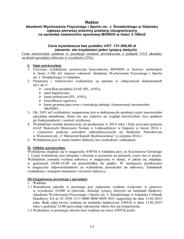 Rektor Akademii Wychowania Fizycznego i Sportu im. J. Śniadeckiego w Gdańsku ogłasza pierwszy pisemny przetarg nieograniczony na sprzedaż nawierzchni sportowej MONDO w ilości 3.186m2 Cena wywoławcza bez podatku VAT: 131.000,00 zł (słownie: sto trzydzieści jeden tysięcy złotych) Cena nawierzchni ustalona w przetargu zostanie powiększona o podatek VAT aktualny na dzień sprzedaży (obecnie w wysokości 23%). I. Opis nawierzchni: 1. Używana wykładzina syntetyczna kauczukowa MONDO w kolorze niebieskim w ilości 3.186 m2 stanowi własność Akademii Wychowania Fizycznego i Sportu im. J. Śniadeckiego w Gdańsku. 2. Parametry i właściwości wykładziny są opisane w załączonych dokumentach od 1 do 5: certyfikat produktu IAAF (PL, ANG), atest higieniczny, karta techniczna (PL, ANG), klasyfikacja ogniowa, karta gwarancyjna wraz z instrukcją obsługi i konserwacji nawierzchni MONDO. 3. Ok. 2451 m2 wykładziny zaopatrzone jest w doklejoną do spodniej części nawierzchni specjalną membranę, która nie ma wpływu na wygląd nawierzchni, lecz podnosi jej funkcjonalność i wartość użytkową. 4. Wykładzina została dostarczona od producenta w 2014 roku i była używana podczas IAAF Halowych Mistrzostw Świata w Lekkoatletyce w Sopocie w lutym 2014 r. i częściowo podczas zawodów lekkoatletycznych na Stadionie Narodowym w Warszawie pn „V Memoriał Kamili Skolimowskiej” w sierpniu 2014 r. 5. Wykładzina jest w stanie bardzo dobrym, bez uszkodzeń i zabrudzeń. II. Odbiór nawierzchni. Wykładzina znajduje się w magazynie AWFiS w Gdańsku przy ul. Kazimierza Górskiego 1. Część wykładziny jest oklejona i złożona w poziomie na paletach, część stoi w pionie. Wykładzina zostanie wydana nabywcy w magazynie w stanie, w jakim się znajduje, w godzinach 10:00-14:00 od poniedziałku do piątku. W momencie przekazania w magazynie odpowiedzialność za wykładzinę przechodzi na nabywcę. Załadunek wykładziny i transport staraniem i na koszt nabywcy. III. Organizacja przetargu i sprzedaży 1. Wadium. 1.1.Warunkiem udziału w przetargu jest wpłacenie wadium wyłącznie w gotówce w wysokości 10.000 zł (słownie: dziesięć tysięcy złotych) na rachunek bankowy Akademii Wychowania Fizycznego i Sportu im. J. Śniadeckiego w Gdańsku Citibank Handlowy SA nr 22 1030 1117 0000 0000 8899 5031 najpóźniej do dnia 13.02.2015 roku. Brak całej kwoty wadium na rachunku bankowym AWFiS w dniu 13.02.2015 roku o godzinie 12:00 spowoduje odrzucenie oferty bez jej rozpatrzenia. 1.2.Wyłoniony w przetargu oferent traci wadium na rzecz AWFiS jeżeli: 1/3 • nie dokona zapłaty całej zaoferowanej ceny nabycia nawierzchni z należnym podatkiem VAT, w terminie do 14 (czternastu) dni do dnia zamieszczenie informacji o wyniku przetargu na stronie internetowej www.awf.gda.pl w BIP-ie zgodnie z pkt. 9 poniżej, na rachunek bankowy Akademii Wychowania Fizycznego i Sportu i m. J. Śniadeckiego w Gdańsku Citibank Handlowy SA nr 22 1030 1117 0000 0000 8899 5007, z zastrzeżeniem pkt. 1.3 poniżej, • sprzedaż nawierzchni stała się niemożliwa z przyczyn leżących po stronie oferenta, w szczególności złożył ofertę niekompletną w odniesieniu do warunków określonych w pkt. 4 poniżej. • przedstawił w ofercie dane nieprawdziwe. 1.3 Wadium wraz z odsetkami (w wysokości jak za przechowanie na rachunku bankowym - a vista) oferenta, który przetarg wygra zostanie zaliczone na poczet ceny sprzedaży. Wadia pozostałych oferentów uczestniczących w niniejszym przetargu zostaną zwrócone nie później niż 7 dni od ogłoszenia wyników przetargu wraz z odsetkami w wysokości jak za przechowanie na rachunku bankowym (a vista). 2. Oferenci zainteresowani udziałem w przetargu mają obowiązek, w godzinach 10:00-14:00 od poniedziałku do piątku w siedzibie AWFiS, dokonania oględzin nawierzchni oraz zapoznania się z wszelkimi dokumentami dotyczącymi nawierzchni. 3. Osobami uprawnionymi do udzielania informacji na temat przetargu oraz do kontaktów z oferentami, w tym w zakresie oględzin i zapoznania z przedmiotem dzierżawy, są Kanclerz AWFiS mgr Olgierd Bojke i Zastępca Kanclerza AWFiS mgr inż. Wojciech Kozłowski (telefon [058] 343-29-45) i osoby przez nich wskazane. Pytania, oświadczenia, wnioski, zawiadomienia, informacje oraz wszelką inną korespondencję należy w formie pisemnej kierować na adres: Akademia Wychowania Fizycznego i Sportu im. Jędrzeja Śniadeckiego w Gdańsku, 80- 336 Gdańsk, ul. Kazimierza Górskiego 1 lub składać w Biurze Kanclerza AWFiS, ul. Józefa Czyżewskiego 30a, 80-336 Gdańsk, II piętro, pok.315 z dopiskiem „Przetarg nieograniczony na sprzedaż nawierzchni sportowej „MONDO” w ilości 3.186m2” lub faxem na nr (058) 343-29-26. 4. Oferta powinna zawierać: • imię, nazwisko i adres oferenta albo nazwę lub firmę oraz siedzibę, jeżeli oferentem jest osoba prawna lub inny podmiot; • dane konieczne do wystawienia faktury za sprzedaż nawierzchni; • konieczne pełnomocnictwa, jeśli są wymagane; • datę sporządzenia oferty; • oświadczenie, że oferent zapoznał się z warunkami przetargu i przyjmuje te warunki bez zastrzeżeń wg wzoru stanowiącego załącznik nr 6 do ogłoszenia; • oferowaną cenę nabycia nawierzchni bez podatku VAT (oferty z ceną niższa niż wywoławcza zostaną odrzucone); • do oferty należy dołączyć kopię dowodu wniesienia wadium, a także informację o numerze konta oferenta, na które AWFiS zwróci wpłacone wadium oferentom, których oferty nie zostały wybrane; • pisemne oferty należy składać w języku polskim; • oferta powinna być czytelnie podpisana imieniem i nazwiskiem osoby/osób składających ofertę lub podpis/y powinny być zaopatrzony/e w pieczątkę/i imienne. Każda strona oferty powinna być zaparafowana przez osobę/y podpisujące ofertę. Dokumenty nie pochodzące od oferenta powinny być złożone w oryginale lub potwierdzone za zgodność. 2/3 5. Oferenci skł