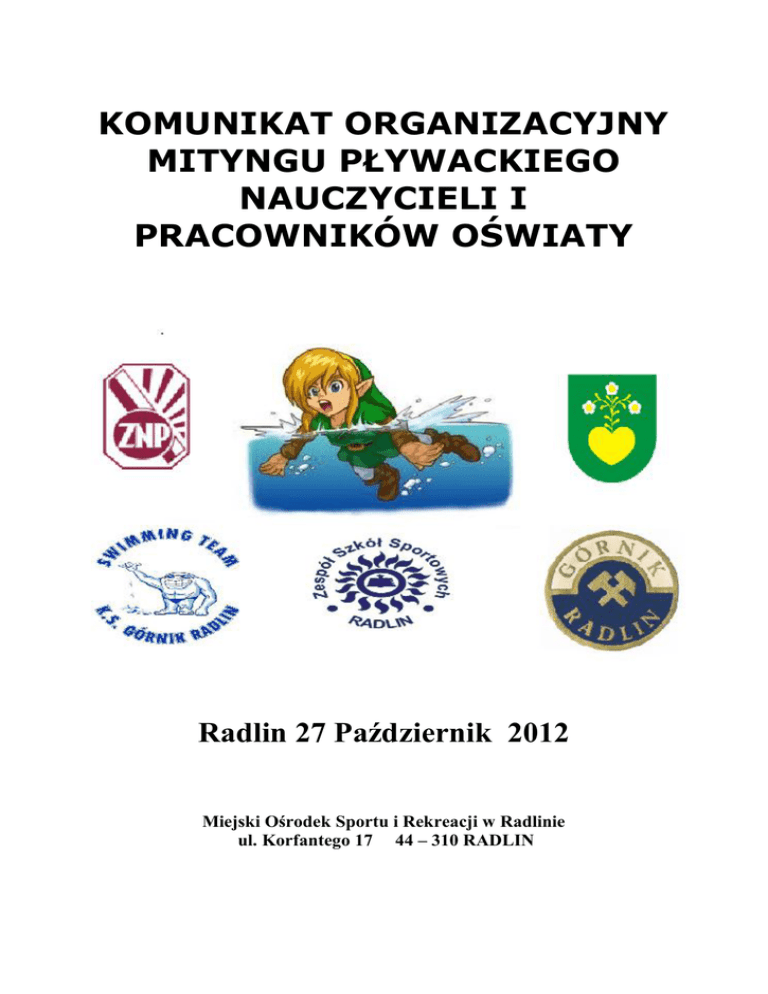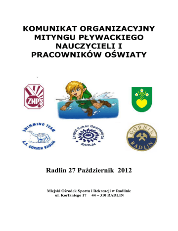 KOMUNIKAT ORGANIZACYJNY MITYNGU PŁYWACKIEGO NAUCZYCIELI I PRACOWNIKÓW OŚWIATY Radlin 27 Październik 2012 Miejski Ośrodek Sportu i Rekreacji w Radlinie ul. Korfantego 17 44 – 310 RADLIN Organizator: ZO ZNP z siedzibą w Wodzisławiu Śląskim Współorganizatorzy: MOSiR w Radlinie Zespół Szkół Sportowych w Radlinie Patronat: Zarząd Główny ZNP w Warszawie Zarząd Okręgu Śląskiego ZNP w Katowicach Urząd Miasta Radlin Urząd Miasta Wodzisław Śląsk Starostwo Powiatowe Wodzisław Śląski Patronat medialny: Media i Prasa Lokalna Dyrektor organizacyjny: Maria Tkocz; Naczelnik zawodów: Grażyna Gdańska; Szulc Wojciech Termin: 27 Październik 2012 Miejsce: Miejski Ośrodek Sportu i Rekreacji w Radlinie ul. Korfantego 17 44 – 310 RADLIN Dane techniczne: - basen sportowy: długość 25 m, 6 torów - pomiar czasu: ręczny 1. Uczestnictwo Prawo startu w zawodach mają zawodniczki i zawodnicy w wieku od 20 lat Każdy zawodnik może uczestniczyć w dwóch konkurencjach indywidualnych w każdym bloku oraz w sztafecie ( sztafetę stanowią zawodnicy jednego oddziału), Zawodniczki i zawodnicy muszą złożyć pisemne oświadczenie, że są zdrowi i startują na własną odpowiedzialność Starty na dystansach 400 m st. dowolnym. należy potwierdzić osobiście w sekretariacie zawodów (na pływalni) w trakcie rozgrzewki (w dniu rozgrywania konkurencji). Kategorie wiekowe: A 20 - 29 B 30 - 39 C 40 - 49 D 50 - i Starsi ( dopuszcza się start nauczycieli emerytowanych) 2. Zgłoszenia Zgłoszenia w formie LENEX File (program Entry Editor – do pobrania i zainstalowania na stronie: http://www.splash-software.ch lub na załączonym wzorze zgłoszenia imiennego należy przesłać w formie elektronicznej na adres: [email protected] w terminie do17.10.2012r. UWAGA: Nie dopuszcza się zgłoszeń po terminie i zmian konkurencji w trakcie zawodów. Lista startowa zostanie umieszczona na stronie: www.slozp.pl www.omegatiming.pl w dniu 26.10.2012 po godz. 19.30 Wyniki będą publikowane na bieżąco w Internecie na stronie www.omegatiming.pl 3. Przepisy techniczne: Zawody będą przeprowadzone seriami na czas. Serie zostaną ustalone według zgłoszonych czasów. Brak wyniku na karcie zgłoszenia powoduje umieszczenie zawodnika w najsłabszych seriach. Podczas zawodów obowiązują przepisy FINA i PZP. Zawodniczki i zawodnicy startują w konkurencjach indywidualnych i sztafetowych w kategoriach wiekowych wynikających z zasad zawodów. 4. Program zawodów: I blok 27.10.2012 08.00 - 09.00 09.00 – 09.30 9.40 9.50 rejestracje zawodników Rozgrzewka uroczyste otwarcie zawodów rozpoczęcie zawodów Konkurencje: Numer konkurencji dystans styl kategoria ½ ¾ 5/6 7/8 9/10 50 50 100 100 400 dow grzb klas mot dow K/M K/M K/M K/M K/M 11/12 4 x 50 dow K/M II blok 27.10.2012 Do ustalenia Rozgrzewka Do ustalenia rozpoczęcie zawodów Konkurencje: Numer konkurencji dystans styl Kategoria 13/14 15/16 17/18 19/20 21/22 23/24 50 50 100 100 100 4 x 50 mot klas dow grzb zm zm K/M K/M K/M K/M K/M K/M Podsumowanie zawodów udziałem zawodników i osób towarzyszących w sztafecie „na wesoło” 5. Nagrody: Za zajęcie miejsca 1-3 w konkurencjach indywidualnych we wszystkich kategoriach wiekowych – medale i dyplomy – (dekoracje odbędą się w trakcie trwania wyścigów), Nagrodami specjalnymi zostają nagrodzeni najlepsi zawodnicy wśród kobiet i mężczyzn. Ocenia się sumę punktów wg tabeli wielobojowej za 2 konkurencje (przy tej samej ilości pkt o kolejności decyduje najwartościowszy wynik wg tabeli). 6. Zasady finansowania: - koszty organizacyjne pokrywa organizator. - koszty uczestnictwa ponoszą uczestnicy: a) opłata startowa od każdego zawodnika wynosi 25 zł płatna do 22.10.2012 przelewem na konto: 87 1500 1214 1212 1009 3982 0000 b) w ramach opłaty startowej każdy zawodnik otrzymuje okolicznościowy upominek, 7. Zakwaterowanie własnym zakresie Propozycje noclegów: - HOTEL MIEJSKI GOŚCINIEC PSZOWSKI, ul. Traugutta 32 Pszów tel: 32 – 7291861 kom: 666-075-241, 602-135-526 ceny od 25 zł - HOTEL ODRA WODZISŁAW ŚL., ul. Czyżowicka Wodzisław Śl. tel. kom: 664-273-010 - HOTEL – RESTAURACJA MIMOZA, ul. Rymera 1, Rybnik-Niedobczyce tel: 32 – 4257365 32 - 7398245 9. Postanowienia końcowe Organizator zapewnia opiekę medyczną oraz komisję sędziowską. W sprawach nieokreślonych regulaminem, komunikatami oraz innymi przepisami decyzje podejmują według kompetencji: Dyrektor Organizacyjny, Naczelnik zawodów, Sędzia Główny. 10. Informacje: Wszelkie zapytania proszę kierować do: e-mail: [email protected] tel. 32 4563276 tel. kom. 694 617 062 Naczelnik zawodów Maciej Rojowski e-mail: [email protected] Zgłoszenia, lista startowa, wyniki Szulc Wojciech kom. 793252566 e-mail: [email protected]