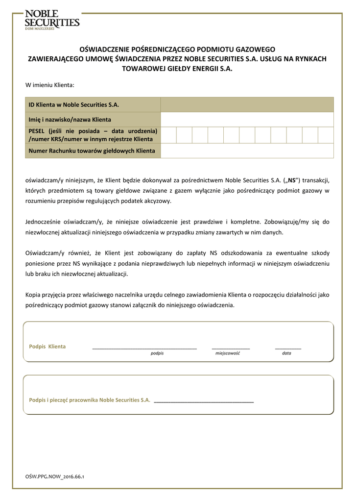 OŚWIADCZENIE POŚREDNICZĄCEGO PODMIOTU GAZOWEGO ZAWIERAJĄCEGO UMOWĘ ŚWIADCZENIA PRZEZ NOBLE SECURITIES S.A. USŁUG NA RYNKACH TOWAROWEJ GIEŁDY ENERGII S.A. W imieniu Klienta: ID Klienta w Noble Securities S.A. Imię i nazwisko/nazwa Klienta PESEL (jeśli nie posiada – data urodzenia) /numer KRS/numer w innym rejestrze Klienta Numer Rachunku towarów giełdowych Klienta oświadczam/y niniejszym, że Klient będzie dokonywał za pośrednictwem Noble Securities S.A. („NS”) transakcji, których przedmiotem są towary giełdowe związane z gazem wyłącznie jako pośredniczący podmiot gazowy w rozumieniu przepisów regulujących podatek akcyzowy. Jednocześnie oświadczam/y, że niniejsze oświadczenie jest prawdziwe i kompletne. Zobowiązuję/my się do niezwłocznej aktualizacji niniejszego oświadczenia w przypadku zmiany zawartych w nim danych. Oświadczam/y również, że Klient jest zobowiązany do zapłaty NS odszkodowania za ewentualne szkody poniesione przez NS wynikające z podania nieprawdziwych lub niepełnych informacji w niniejszym oświadczeniu lub braku ich niezwłocznej aktualizacji. Kopia przyjęcia przez właściwego naczelnika urzędu celnego zawiadomienia Klienta o rozpoczęciu działalności jako pośredniczący podmiot gazowy stanowi załącznik do niniejszego oświadczenia. Podpis Klienta ____________________________________________ podpis ________________ miejscowość Podpis i pieczęć pracownika Noble Securities S.A. __________________________________________ OŚW.PPG.NOW_2016.66.1 ___________ data