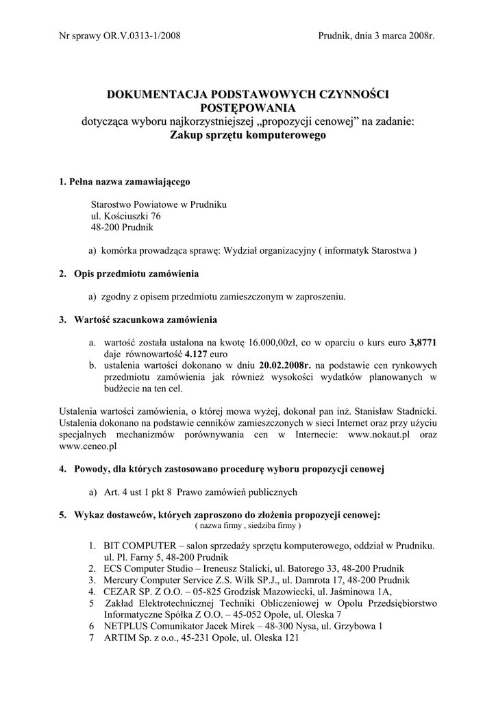 Nr sprawy OR.V.0313-1/2008 Prudnik, dnia 3 marca 2008r. DOKUMENTACJA PODSTAWOWYCH CZYNNOŚCI POSTĘPOWANIA dotycząca wyboru najkorzystniejszej „propozycji cenowej” na zadanie: Zakup sprzętu komputerowego 1. Pełna nazwa zamawiającego Starostwo Powiatowe w Prudniku ul. Kościuszki 76 48-200 Prudnik a) komórka prowadząca sprawę: Wydział organizacyjny ( informatyk Starostwa ) 2. Opis przedmiotu zamówienia a) zgodny z opisem przedmiotu zamieszczonym w zaproszeniu. 3. Wartość szacunkowa zamówienia a. wartość została ustalona na kwotę 16.000,00zł, co w oparciu o kurs euro 3,8771 daje równowartość 4.127 euro b. ustalenia wartości dokonano w dniu 20.02.2008r. na podstawie cen rynkowych przedmiotu zamówienia jak również wysokości wydatków planowanych w budżecie na ten cel. Ustalenia wartości zamówienia, o której mowa wyżej, dokonał pan inż. Stanisław Stadnicki. Ustalenia dokonano na podstawie cenników zamieszczonych w sieci Internet oraz przy użyciu specjalnych mechanizmów porównywania cen w Internecie: www.nokaut.pl oraz www.ceneo.pl 4. Powody, dla których zastosowano procedurę wyboru propozycji cenowej a) Art. 4 ust 1 pkt 8 Prawo zamówień publicznych 5. Wykaz dostawców, których zaproszono do złożenia propozycji cenowej: ( nazwa firmy , siedziba firmy ) 1. BIT COMPUTER – salon sprzedaży sprzętu komputerowego, oddział w Prudniku. ul. Pl. Farny 5, 48-200 Prudnik 2. ECS Computer Studio – Ireneusz Stalicki, ul. Batorego 33, 48-200 Prudnik 3. Mercury Computer Service Z.S. Wilk SP.J., ul. Damrota 17, 48-200 Prudnik 4. CEZAR SP. Z O.O. – 05-825 Grodzisk Mazowiecki, ul. Jaśminowa 1A, 5 Zakład Elektrotechnicznej Techniki Obliczeniowej w Opolu Przedsiębiorstwo Informatyczne Spółka Z O.O. – 45-052 Opole, ul. Oleska 7 6 NETPLUS Comunikator Jacek Mirek – 48-300 Nysa, ul. Grzybowa 1 7 ARTIM Sp. z o.o., 45-231 Opole, ul. Oleska 121 6. Wykaz dostawców, którzy złożyli propozycje cenowe: ( nazwa firmy , siedziba firmy, cena brutto ) 1. CEZAR SP. Z O.O. – 05-825 Grodzisk Mazowiecki, ul. Jaśminowa 1A, cena 13 342,90 zł 2. Zakład Elektrotechnicznej Techniki Obliczeniowej w Opolu Przedsiębiorstwo Informatyczne Spółka Z O.O. – 45-052 Opole, ul. Oleska 7, cena 13 865,30zł 3. NETPLUS Comunikator Jacek Mirek – 48-300 Nysa, ul. Grzybowa 1, cena: 14 361,64zł 4. ECS Ireneusz Stalicki, 48-200 Prudnik, ul. Batorego 33, cena: 12 903,19zł 5. ARTIM Sp. z o.o., 45-231 Opole, ul. Oleska 121, cena: 13 559,38zł 6. Mercury Computer Service Z.S. Wilk SP. J., 48-200 Prudnik, ul. Damrota 17, cena: 14 587,66zł 7. Opis kryteriów: a) Cena - 100% 8. Wskazanie wybranej propozycji cenowej: a) W wyniku przeprowadzonego postępowania wybrano propozycje cenową nr 4 Nazwa firmy: ECS Ireneusz Stalicki Siedziba firmy ( adres ): 48-200 Prudnik, ul. Batorego 33 Cena: 12 903,19zł brutto 9. Uzasadnienie wyboru i inne istotne z punku prowadzonego postępowania informacje: a) Wybrano ofertę z najkorzystniejsza ceną 10. W wyborze propozycji cenowej uczestniczyli: a) inż. Stanisław Stadnicki informatyk Starostwa wydz. org. b) mgr Mieczysław Stochniał Główny Specjalista ds zamówień publicznych 11. Protokół sporządził inż. Stanisław Stadnicki 12. Protokół o udzielenie zamówienia na podstawie przyjętej propozycji cenowej zatwierdził: kierownik komórki merytorycznej Naczelnik Wydziału Organizacyjnego Halina Lisiecka w dniu 3 marca 2008r Kierownik jednostki Starosta Prudnicki Radosław Roszkowski w dniu 3 marca 2008r.