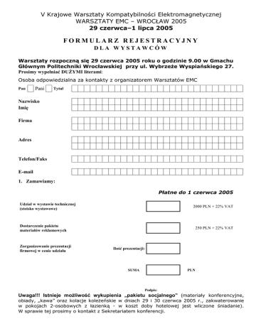 V Krajowe Warsztaty Kompatybilności Elektromagnetycznej WARSZTATY EMC – WROCŁAW 2005 29 czerwca–1 lipca 2005 FORMULARZ REJESTRACYJNY DLA WYSTAWCÓW Warsztaty rozpoczną się 29 czerwca 2005 roku o godzinie 9.00 w Gmachu Głównym Politechniki Wrocławskiej przy ul. Wybrzeże Wyspiańskiego 27. Prosimy wypełniać DUŻYMI literami: Osoba odpowiedzialna za kontakty z organizatorem Warsztatów EMC Pan Pani Tytuł Nazwisko Imię Firma Adres Telefon/Faks E-mail 1. Zamawiamy: Płatne do 1 czerwca 2005 Udział w wystawie technicznej (stoisko wystawowe) 2000 PLN + 22% VAT Dostarczenie pakietu materiałów reklamowych Zorganizowanie prezentacji firmowej w cenie udziału 250 PLN + 22% VAT Ilość prezentacji: SUMA PLN Podpis: Uwaga!!! Istnieje możliwość wykupienia „pakietu socjalnego” (materiały konferencyjne, obiady, „kawa” oraz kolacje koleżeńskie w dniach 29 i 30 czerwca 2005 r., zakwaterowanie w pokojach 2-osobowych z łazienką - w koszt doby hotelowej jest wliczone śniadanie). W sprawie tej prosimy o kontakt z Sekretariatem konferencji. 2. Prosimy wskazać sposób płatności: Kartą płatniczą – przez faks lub e-mail: AMERICAN EXPRESS DINERS CARD MASTERCARD VISA EUROCARD Numer karty Kwota Data: Data ważności PLN Nazwisko i imię posiadacza karty Podpis: Przelew na konto: Warunkiem uczestnictwa w konferencji jest przesłanie do 1 czerwca 2005 r. wypełnionego formularza rejestracyjnego na adres sekretariatu konferencji lub faksem na numer (071) 322 34 73 oraz wpłata do 1 czerwca 2005 r. kwoty zgodnej z wybranym wariantem na konto: Fundacja Rozwoju Politechniki Wrocławskiej Politechnika Wrocławska Ul. Wybrzeże Wyspiańskiego 27 50-370 Wrocław Nr konta: 33 1500 1067 1210 6002 1100 0000 Kredyt Bank II/O Wrocław Prosimy w blankiecie przelewu w opisie „tytułem” wpisać Warsztaty 2005wystawca i nazwę firmy. Potwierdzenie przyjęcia zamówienia zostanie wysłane po wpłynięciu pieniędzy. Oświadczamy, że jesteśmy uprawnieni do otrzymywania faktur VAT. Nasz numer NIP: Upoważniamy Fundację Rozwoju Politechniki Wrocławskiej do wystawienia faktury VAT bez naszego podpisu. Data: Podpis: Sekretariat konferencji WARSZTATY EMC – WROCŁAW 2005 Instytut Telekomunikacji i Akustyki Politechnika Wrocławska Wybrzeże Wyspiańskiego 27 50-370 Wrocław tel.: 0 pref. 71 3202559 0 pref. 71 3202947 tel / faks:0 pref. 71 3223473 e-mail: [email protected] internet: www.warsztaty-emc.pwr.wroc.pl