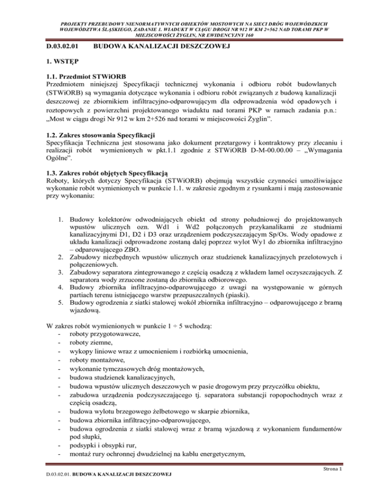 PROJEKTY PRZEBUDOWY NIENORMATYWNYCH OBIEKTÓW MOSTOWYCH NA SIECI DRÓG WOJEWÓDZKICH WOJEWÓDZTWA ŚLĄSKIEGO, ZADANIE 1. WIADUKT W CIĄGU DROGI NR 912 W KM 2+562 NAD TORAMI PKP W MIEJSCOWOŚCI ŻYGLIN, NR EWIDENCYJNY 160 D.03.02.01 BUDOWA KANALIZACJI DESZCZOWEJ 1. WSTĘP 1.1. Przedmiot STWiORB Przedmiotem niniejszej Specyfikacji technicznej wykonania i odbioru robót budowlanych (STWiORB) są wymagania dotyczące wykonania i odbioru robót związanych z budową kanalizacji deszczowej ze zbiornikiem infiltracyjno-odparowującym dla odprowadzenia wód opadowych i roztopowych z powierzchni projektowanego wiaduktu nad torami PKP w ramach zadania p.n.: „Most w ciągu drogi Nr 912 w km 2+526 nad torami w miejscowości Żyglin”. 1.2. Zakres stosowania Specyfikacji Specyfikacja Techniczna jest stosowana jako dokument przetargowy i kontraktowy przy zlecaniu i realizacji robót wymienionych w pkt.1.1 zgodnie z STWiORB D-M-00.00.00 – „Wymagania Ogólne”. 1.3. Zakres robót objętych Specyfikacją Roboty, których dotyczy Specyfikacja (STWiORB) obejmują wszystkie czynności umożliwiające wykonanie robót wymienionych w punkcie 1.1. w zakresie zgodnym z rysunkami i mają zastosowanie przy wykonaniu: 1. Budowy kolektorów odwodniających obiekt od strony południowej do projektowanych wpustów ulicznych ozn. Wd1 i Wd2 połączonych przykanalikami ze studniami kanalizacyjnymi D1, D2 i D3 oraz urządzeniem podczyszczającym Sp/Os. Wody opadowe z układu kanalizacji odprowadzone zostaną dalej poprzez wylot Wy1 do zbiornika infiltracyjno – odparowującego ZBO. 2. Zabudowy niezbędnych wpustów ulicznych oraz studzienek kanalizacyjnych przelotowych i połączeniowych. 3. Zabudowy separatora zintegrowanego z częścią osadczą z wkładem lamel oczyszczających. Z separatora wody zrzucone zostaną do zbiornika odbiorowego. 4. Budowy zbiornika infiltracyjno-odparowującego z uwagi na występowanie w górnych partiach terenu istniejącego warstw przepuszczalnych (piaski). 5. Budowy ogrodzenia z siatki stalowej wokół zbiornika infiltracyjno – odparowującego z bramą wjazdową. W zakres robót wymienionych w punkcie 1 ÷ 5 wchodzą: - roboty przygotowawcze, - roboty ziemne, - wykopy liniowe wraz z umocnieniem i rozbiórką umocnienia, - roboty montażowe, - wykonanie tymczasowych dróg montażowych, - budowa studzienek kanalizacyjnych, - budowa wpustów ulicznych deszczowych w pasie drogowym przy przyczółku obiektu, - zabudowa urządzenia podczyszczającego tj. separatora substancji ropopochodnych wraz z częścią osadczą, - budowa wylotu brzegowego żelbetowego w skarpie zbiornika, - budowa zbiornika infiltracyjno-odparowującego, - budowa ogrodzenia z siatki stalowej wraz z bramą wjazdową z wykonaniem fundamentów pod słupki, - podsypki i obsypki rur, - montaż rury ochronnej dwudzielnej na kablu energetycznym, Strona 1 D.03.02.01. BUDOWA KANALIZACJI DESZCZOWEJ PROJEKTY PRZEBUDOWY NIENORMATYWNYCH OBIEKTÓW MOSTOWYCH NA SIECI DRÓG WOJEWÓDZKICH WOJEWÓDZTWA ŚLĄSKIEGO, ZADANIE 1. WIADUKT W CIĄGU DROGI NR 912 W KM 2+562 NAD TORAMI PKP W MIEJSCOWOŚCI ŻYGLIN, NR EWIDENCYJNY 160 - ochrona przed korozją, zasyp wykopów gruntem rodzimym, przywrócenie terenu do stanu istniejącego, kontrola jakości, wykonanie powykonawczej dokumentacji geodezyjnej. 1.4. Określenia podstawowe Określenia podane w niniejszej ST są zgodne z odpowiednimi normami i określeniami podanymi w Specyfikacji D-M-00.00.00. 1.4.1. Kanał - liniowy obiekt inżynierski przeznaczony do grawitacyjnego odprowadzenia ścieków. 1.4.2. Kanał deszczowy - kanał przeznaczony do odprowadzenia ścieków opadowych i roztopowych. 1.4.3. Kanał doprowadzający - kanał deszczowy doprowadzający ścieki opadowe do odbiornika lub urządzeń technologicznych. 1.4.4. Kanał odprowadzający - kanał deszczowy odprowadzający ścieki do odbiornika. 1.4.5. Kanał otwarty /koryto żelbetowe o przekroju prostokątnym/ - kanał którego górna część obwodu przekroju poprzecznego jest otwarta. 1.4.6. Kanał zamknięty - kanał, którego obwód przekroju poprzecznego jest zamknięty. 1.4.7. Przykanalik - kanał przeznaczony do połączenia wpustu deszczowego z siecią kanalizacji deszczowej. 1.4.8. Kolektor, kanał zbiorczy - kanał przeznaczony do zbierania ścieków z kanałów i odprowadzenia ich do pompowni, oczyszczalni lub odbiornika. 1.4.9. Kanał przełazowy - kanał zamknięty o wysokości wewnętrznej większej lub równej 1,0 m. 1.4.10. Kanał nieprzełazowy - kanał zamknięty o wysokości wewnętrznej mniejszej niż 1,0 m. 1.4.11. Studzienka kanalizacyjna (rewizyjna) - obiekt na kanale nieprzełazowym przeznaczony do kontroli i prawidłowej eksploatacji kanałów. 1.4.12. Studzienka przelotowa - studzienka kanalizacyjna zlokalizowana na załamaniach osi kanału w planie na załamaniach spadku kanału oraz na odcinkach prostych. 1.4.13. Studzienka połączeniowa - studzienka kanalizacyjna przeznaczona do połączenia co najmniej dwóch kanałów dopływowych, w jeden kanał odpływowy. 1.4.14. Studzienka kaskadowa (spadowa) - studzienka kanalizacyjna, mająca dodatkowy przewód pionowy umożliwiający wytracenie nadmiaru energii ścieków, spływających z wyżej położonego kanału dopływowego do niżej położonego kanału odpływowego. 1.4.15. Studzienka wpadowa - studzienka, kanalizacyjna, odbierająca wody opadowe z rowów otwartych przydrożnych do układu kanalizacji deszczowej zamkniętej. 1.4.16. Studzienka monolityczna - studzienka, której co najmniej komora robocza jest wykonana w konstrukcji monolitycznej. Strona 2 D.03.02.01. BUDOWA KANALIZACJI DESZCZOWEJ PROJEKTY PRZEBUDOWY NIENORMATYWNYCH OBIEKTÓW MOSTOWYCH NA SIECI DRÓG WOJEWÓDZKICH WOJEWÓDZTWA ŚLĄSKIEGO, ZADANIE 1. WIADUKT W CIĄGU DROGI NR 912 W KM 2+562 NAD TORAMI PKP W MIEJSCOWOŚCI ŻYGLIN, NR EWIDENCYJNY 160 1.4.17. Studzienka prefabrykowana - studzienka, której co najmniej zasadnicza część komory roboczej i komin włazowy są wykona