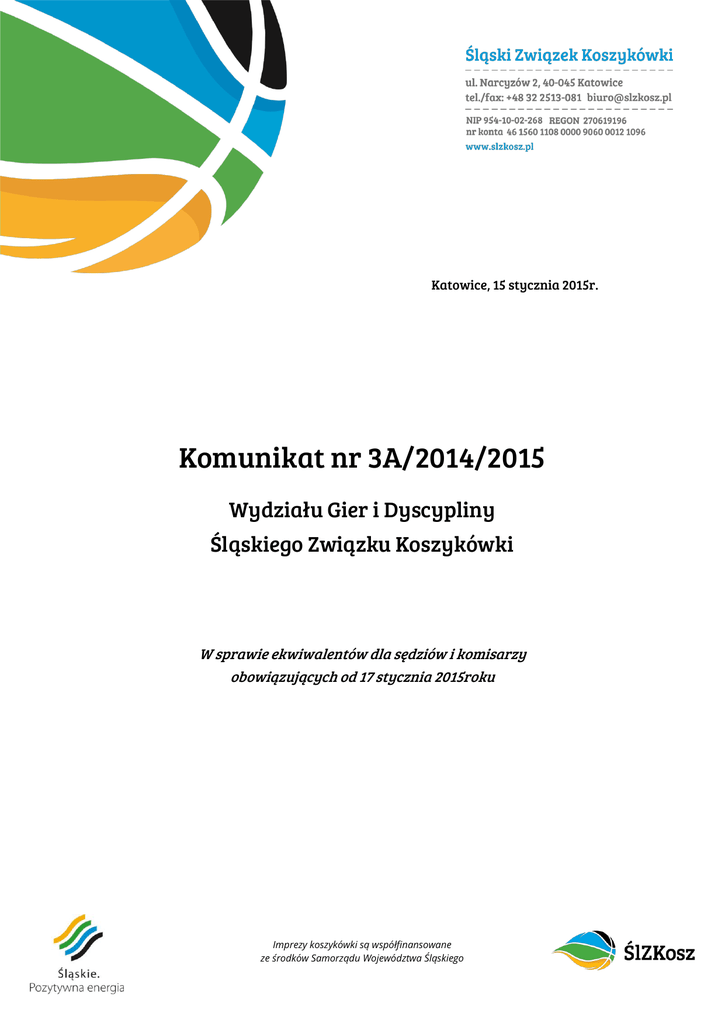 Katowice, 15 stycznia 2015r. Komunikat nr 3A/2014/2015 Wydziału Gier i Dyscypliny Śląskiego Związku Koszykówki W sprawie ekwiwalentów dla sędziów i komisarzy obowiązujących od 17 stycznia 2015roku Imprezy koszykówki są współfinansowane ze środków Samorządu Województwa Śląskiego 2 Ekwiwalenty dla sędziów 2014/2015 STAWKI SĘDZIOWSKIE 2014/2015 od 17 stycznia 2015 stawka zawiera ryczałt za prowadzenie zawodów wraz z dojazdem w PLN w granicach KATEGORIA pom. 31 - 50 miasta/stawka do 15 km do 30 km ROZGRYWEK km bazowa pow. 50 km o wejście do II ligii 150,00 164,00 177,00 195,00 240,00 liga wojewódzka 140,00 144,00 167,00 185,00 230,00 juniorzy starsi 90,00 104,00 117,00 135,00 180,00 juniorzy, juniorki starsze 80,00 94,00 107,00 125,00 170,00 kadeci, juniorki 60,00 74,00 87,00 105,00 150,00 kadetki, młodzicy 50,00 64,00 77,00 95,00 140,00 minikoszykówka 30,00 stolik wszystkie klasy rozgr. z wyłączeniem minikoszykówki i RC 40,00 54,00 67,00 85,00 Ekwiwalenty dla komisarzy technicznych 2014/2015 STAWKI KOMISARSKIE 2014/2015 stawka zawiera ryczałt za prowadzenie zawodów wraz z dojazdem w PLN KATEGORIA w granicach pom. 31 - 50 ROZGRYWEK miasta do 15 km do 30 km km o wejście do II ligii Pozostałe rozgrywki 3/4 stawki sędziego boiskowego pow. 50 km Ekwiwalenty dojazdowe dla sędziów funkcyjnych RC STAWKI DOJAZDÓW RC 2014/2015 KATEGORIA ROZGRYWEK rozgrywki szczebla centralnego ryczałt za dojazdy w obie strony w PLN w granicach miasta do 15 km do 30 km pom. 31 - 50 km 13,50 45,00 - 27,00 pow. 50 km 1. Stawki ekwiwalentów dla sędziów w rozgrywkach eliminacyjnych do 1 Ligi Kobiet zostaną ustalone przez organizatora rozgrywek. 2. Stawki ekwiwalentów w rozgrywkach centralnych (seniorskich i młodzieżowych) ustala Polski Związek Koszykówki. 3. Stawka zawiera ryczałt za prowadzenie zawodów wraz z dojazdem. 4. Dojazdy w w/w kwotach zawiera koszt podróży tam i z powrotem. Należy wpisać ją w delegację sędziowską pod pozycją 2 i 3 POKWITOWANIA rozbijając ja na dwie równe części. Imprezy koszykówki są współfinansowane ze środków Samorządu Województwa Śląskiego 3 5. Odległość dojazdu liczona ma być jako najkrótsza trasa drogowa z miejsca zamieszkania do miejsca rozgrywania spotkania wg serwisu www.targeo.pl Przewodnicząca WGiD Grażyna Szulik Rozdzielnik: 1. 2. 3. 4. 5. 6. 7. 8. Kluby. Opolski Związek Koszykówki. Prezes Zarządu ŚlZKosz. Kolegium Sędziów ŚlZKosz. Komisja Szkoleniowa ŚlZKosz. Biuro Związku. WGiD ŚlZKosz. Redakcja strony internetowej. Imprezy koszykówki są współfinansowane ze środków Samorządu Województwa Śląskiego