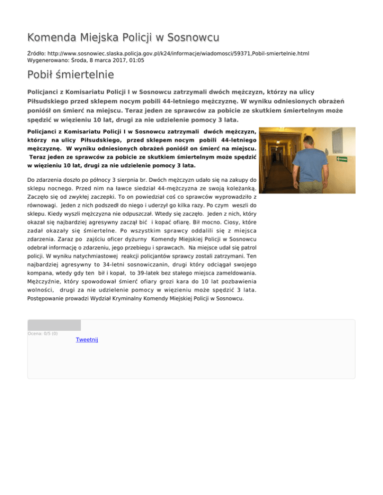 Komenda Miejska Policji w Sosnowcu Źródło: http://www.sosnowiec.slaska.policja.gov.pl/k24/informacje/wiadomosci/59371,Pobil-smiertelnie.html Wygenerowano: Środa, 8 marca 2017, 01:05 Pobił śmiertelnie Policjanci z Komisariatu Policji I w Sosnowcu zatrzymali dwóch mężczyzn, którzy na ulicy Piłsudskiego przed sklepem nocym pobili 44-letniego mężczyznę. W wyniku odniesionych obrażeń ponióśł on śmierć na miejscu. Teraz jeden ze sprawców za pobicie ze skutkiem śmiertelnym może spędzić w więzieniu 10 lat, drugi za nie udzielenie pomocy 3 lata. Policjanci z Komisariatu Policji I w Sosnowcu zatrzymali dwóch mężczyzn, którzy na ulicy Piłsudskiego, przed sklepem nocym pobili 44-letniego mężczyznę. W wyniku odniesionych obrażeń ponióśł on śmierć na miejscu. Teraz jeden ze sprawców za pobicie ze skutkiem śmiertelnym może spędzić w więzieniu 10 lat, drugi za nie udzielenie pomocy 3 lata. Do zdarzenia doszło po północy 3 sierpnia br. Dwóch mężczyzn udało się na zakupy do sklepu nocnego. Przed nim na ławce siedział 44-mężczyzna ze swoją koleżanką. Zaczęło się od zwykłej zaczepki. To on powiedział coś co sprawców wyprowadziło z równowagi. Jeden z nich podszedł do niego i uderzył go kilka razy. Po czym weszli do sklepu. Kiedy wyszli mężczyzna nie odpuszczał. Wtedy się zaczęło. Jeden z nich, który okazał się najbardziej agresywny zaczął bić i kopać ofiarę. Bił mocno. Ciosy, które zadał okazały się śmiertelne. Po wszystkim sprawcy oddalili się z miejsca zdarzenia. Zaraz po zajściu oficer dyżurny Komendy Miejskiej Policji w Sosnowcu odebrał informację o zdarzeniu, jego przebiegu i sprawcach. Na miejsce udał się patrol policji. W wyniku natychmiastowej reakcji policjantów sprawcy zostali zatrzymani. Ten najbardziej agresywny to 34-letni sosnowiczanin, drugi który odciągał swojego kompana, wtedy gdy ten bił i kopał, to 39-latek bez stałego miejsca zameldowania. Mężczyźnie, który spowodował śmierć ofiary grozi kara do 10 lat pozbawienia wolności, drugi za nie udzielenie pomocy w więzieniu może spędzić 3 lata. Postępowanie prowadzi Wydział Kryminalny Komendy Miejskiej Policji w Sosnowcu. Ocena: 0/5 (0) Tweetnij