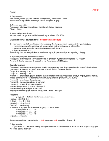 (*2012) Rugby 1. Organizator Komitet organizacyjny na terenie którego rozgrywana jest OOM. Kierownictwo sportowe sprawuje Polski Związek Rugby. 2. Termin zawodów Rozgrywki międzywojewódzkie i baraże: do końca czerwca Finały - lipiec 4. Warunki uczestnictwa W zawodach mogą brać udział zawodnicy w wieku 16 - 17 lat. Drużyna liczy 23 zawodników i 4 osoby towarzyszące. Do reprezentowania barw klubowych w rozgrywkach uprawnieni są zawodnicy posiadający: - tymczasowy dowód osobisty lub inną ważną legitymację wraz z fotografią, - aktualną kartę zdrowia stwierdzającą zdolność do gry, - licencję zawodniczą. Zawodnicy bez aktualnych kart zdrowia nie będą dopuszczani przez sędziego do gry. 5. Sposób przeprowadzenia zawodów Rozgrywki eliminacyjne - prowadzone są w grupach wyznaczonych przez PZ Rugby: Awans do finału uzyskuje 6 zespołów wg Regulaminu PZ Rugby. Zawody finałowe. Rozgrywki przeprowadzone będą w dwóch grupach (po trzy drużyny w każdej grupie). Podział na grupy oraz kolejność spotkań w grupach ustali Polski Związek Rugby. Grupa A – numery 1, 4, 5 Grupa B – numery 2,3,6 Numer 1 – zwycięzca grupy, z której awansowało do finałów najwięcej drużyn (w przypadku remisu więcej punktów w SSM zdobyte przez drużyny z danej grupy w OOM 2011) Numer 2 – zwycięzca drugiej grupy Numer 3 – pierwsza drużyna z barażu I Numer 4 – druga drużyna z barażu I Numer 5 - pierwsza drużyna z barażu II Numer 6 - druga drużyna z barażu II W grupach obowiązuje system rozgrywek każdy z każdym. Program przyjazd do kolacji, konferencja techniczna I dzień - 4-5, 2-3, 1-6 II dzień – 1-4, 3-6, 2-5 III dzień – 1-5, 2-6, 4-3 IV dzień - dzień wolny V dzień – finały (na podstawie tabel grup po 3 meczach o miejsca 5-6 3A – 3B o miejsca 3-4 2A – 2B o miejsca 1-2 1A – 1B wyjazd po obiedzie liczba uczestników: zawodników - 138, trenerów - 24, sędziów - 7, pzs - 2 6. Zgłoszenia Zgłoszenie do zawodów należy nadsyłać w terminie określonym w komunikacie organizacyjnym Nr 1 dla danej imprezy. 1 7. Punktacja Lok. 1 2 PKT 45 40 3 36 4 32 5 28 6 24 205 Warunkiem zaliczenia punktów jest przesłanie do Działu Analiz wyników eliminacji międzywojewódzkich, barażów i finałów łącznie ze składami imiennymi. D. System ocen Rugby II. Mistrzostwa Polski Juniorów (15-osobowe) Lok. 1 2 3 4 5 6 7 8 PKT 75 60 50 45 40 35 30 25 360 rozgrywki barażowe Lok. 3 4 PKT 10 8 18 M - 18-19 lat III. Olimpiada Młodzieży - Mistrzostwa Polski Juniorów Młodszych (15-osobowe)M - 16-17 lat Lok. 1 2 3 4 5 6 PKT 45 40 36 32 28 24 205 rozgrywki eliminacyjne Lok. 3 4 5 6 PKT 18 14 12 10 54 IV. Międzywojewódzkie Mistrzostwa Młodzików rugby 7-osobowe Lok. 1 2 3 4 5 6 PKT 18 15 12 9 6 3 63 M - 14-15 lat Strefy A – POM, WM, KPM, ZPM B – MAZ, ŁDZ, LUB, ŚWI C – ŚL, MŁP, WLP, LBU, DŚL E. Roczniki juniorzy juniorzy młodsi młodzicy 2012 POM LUB MŁP 2013 2014 18-19 lat (w 2012 roku urodzeni 01.01.1993 – 31.12.1994) 16-17 lat (w 2012 roku urodzeni 01.01.1995 – 31.12.1996) 14-15 lat (w 2012 roku urodzeni 01.01.1997 – 31.12.1998) Przypominamy: - w zawodach uczestniczą kluby posiadające licencję wydaną przez właściwy polski związek, - zawodnicy muszą posiadać licencję wydaną przez właściwy związek, - w przypadku braku licencji klubowej – punkty naliczane będą dla gminy, - komunikat z zawodów powinien zawierać rok urodzenia zawodnika, numer licencji zawodnika oraz pełną nazwę klubu, wykaz członków komisji sędziowskiej wraz z ich nr licencji i być podpisany przez sędziego głównego z podaniem jego nr licencji - komunikat z zawodów należy przesłać na adres Polskiej Federacji Sportu Młodzieżowego w ciągu 14 dni po zawodach, - prosimy o zapoznanie się z częścią ogólną regulaminu współzawodnictwa, gdzie podane są zasady uczestnictwa i oceny wyników we wszystkich dyscyplinach systemu, - na stronie internetowej PFSM (www.sportmlodziezowy.pl) umieszczane są średnio co dwa tygodnie wyniki współzawodnictwa. 2