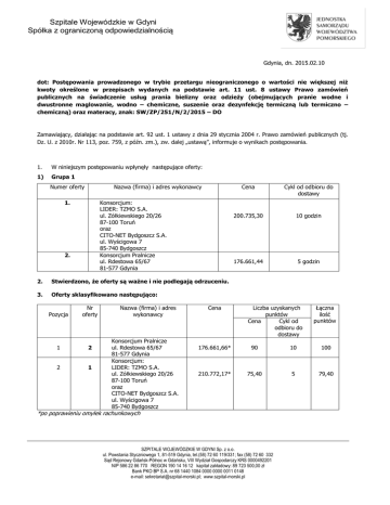 Szpitale Wojewódzkie w Gdyni Spółka z ograniczoną odpowiedzialnością Gdynia, dn. 2015.02.10 dot: Postępowania prowadzonego w trybie przetargu nieograniczonego o wartości nie większej niż kwoty określone w przepisach wydanych na podstawie art. 11 ust. 8 ustawy Prawo zamówień publicznych na świadczenie usług prania bielizny oraz odzieży (obejmujących pranie wodne i dwustronne maglowanie, wodno – chemiczne, suszenie oraz dezynfekcję termiczną lub termiczno – chemiczną) oraz materacy, znak: SW/ZP/251/N/2/2015 – DO Zamawiający, działając na podstawie art. 92 ust. 1 ustawy z dnia 29 stycznia 2004 r. Prawo zamówień publicznych (tj. Dz. U. z 2010r. Nr 113, poz. 759, z późn. zm.), zw. dalej „ustawą”, informuje o wynikach postępowania. 1. W niniejszym postępowaniu wpłynęły następujące oferty: 1) Grupa 1 Numer oferty Nazwa (firma) i adres wykonawcy 1. Konsorcjum: LIDER: TZMO S.A. ul. Zółkiewskiego 20/26 87-100 Toruń oraz CITO-NET Bydgoszcz S.A. ul. Wyścigowa 7 85-740 Bydgoszcz Konsorcjum Pralnicze ul. Rdestowa 65/67 81-577 Gdynia 2. 2. Stwierdzono, że oferty są ważne i nie podlegają odrzuceniu. 3. Oferty sklasyfikowano następująco: Pozycja Nr oferty 1 2 2 1 Nazwa (firma) i adres wykonawcy Konsorcjum Pralnicze ul. Rdestowa 65/67 81-577 Gdynia Konsorcjum: LIDER: TZMO S.A. ul. Zółkiewskiego 20/26 87-100 Toruń oraz CITO-NET Bydgoszcz S.A. ul. Wyścigowa 7 85-740 Bydgoszcz Cena Cena Cykl od odbioru do dostawy 200.735,30 10 godzin 176.661,44 5 godzin Liczba uzyskanych punktów Cena Cykl od odbioru do dostawy Łączna ilość punktów 176.661,66* 90 10 100 210.772,17* 75,40 5 79,40 *po poprawieniu omyłek rachunkowych SZPITALE WOJEWÓDZKIE W GDYNI Sp. z o.o. ul. Powstania Styczniowego 1, 81-519 Gdynia, tel.(58) 72 60 119/331; fax (58) 72 60 332 Sąd Rejonowy Gdańsk-Północ w Gdańsku, VIII Wydział Gospodarczy KRS 0000492201 NIP 586 22 86 770 REGON 190 14 16 12 kapitał zakładowy: 89 723 500,00 zł Bank PKO BP S.A. nr 68 1440 1084 0000 0000 0011 0148 e-mail: [email protected]; www.szpital-morski.pl Szpitale Wojewódzkie w Gdyni Spółka z ograniczoną odpowiedzialnością 4. Dokonano wyboru oferty: Konsorcjum Pralnicze ul. Rdestowa 65/67 81-577 Gdynia Cena oferty: 176.661,66 zł Uzasadnienie Wyłoniono Wykonawcą, który złożył ofertę najkorzystniejszą, przy uwzględnieniu kryteriów oceny ofert zawartych w SIWZ. Uprzejmie dziękuję za złożenie oferty i informuję, iż zgodnie z dyspozycją art. 94 ust. 2 pkt. 1 lit. a) podpisanie umowy nastąpi po uzgodnieniu terminu z wyłonionym Wykonawcą. Jednocześnie informuję, iż umowa zostanie wysłana Wykonawcy pocztą. Z poważaniem SZPITALE WOJEWÓDZKIE W GDYNI Sp. z o.o. ul. Powstania Styczniowego 1, 81-519 Gdynia, tel.(58) 72 60 119/331; fax (58) 72 60 332 Sąd Rejonowy Gdańsk-Północ w Gdańsku, VIII Wydział Gospodarczy KRS 0000492201 NIP 586 22 86 770 REGON 190 14 16 12 kapitał zakładowy: 89 723 500,00 zł Bank PKO BP S.A. nr 68 1440 1084 0000 0000 0011 0148 e-mail: [email protected]; www.szpital-morski.pl