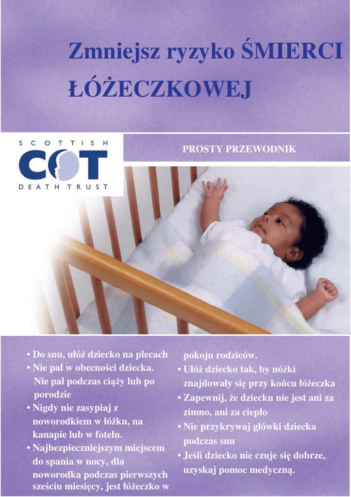 Zmniejsz ryzyko ŚMIERCI ŁÓśECZKOWEJ PROSTY PRZEWODNIK • Do snu, ułóŜ dziecko na plecach • Nie pal w obecności dziecka. Nie pal podczas ciąŜy lub po porodzie • Nigdy nie zasypiaj z noworodkiem w łóŜku, na kanapie lub w fotelu. • Najbezpieczniejszym miejscem do spania w nocy, dla noworodka podczas pierwszych sześciu miesięcy, jest łóŜeczko w pokoju rodziców. • UłóŜ dziecko tak, by nóŜki znajdowały się przy końcu łóŜeczka • Zapewnij, Ŝe dziecku nie jest ani za zimno, ani za ciepło • Nie przykrywaj główki dziecka podczas snu • Jeśli dziecko nie czuje się dobrze, uzyskaj pomoc medyczną. Co to jest ŚMIERĆ ŁÓśECZKOWA? Śmierć łóŜeczkowa, nazywana równieŜ Poświęć kilka minut na przeczytanie zespołem nagłej śmierci niemowląt (z ang. tej broszurki, a w celu uzyskania SIDS - Sudden Infant Death Syndrome) dokładniejszych informacji występuje u dzieci, zwykle poniŜej jednego skontaktuj się z połoŜną lub odwiedź roku Ŝycia, gdy dziecko, bez uprzedniej pielęgniarkę środowiskową lub historii chorób, nagle umiera. wejdź na stronę: Śmierć łóŜeczkowa występuje rzadko i www.sidscotland.org.uk przez cały czas prowadzone są badania mające na celu pomoc w jej lepszym zrozumieniu. Stosowanie się do prostych kroków przedstawionych w broszurce pomoŜe zmniejszyć ryzyko jej wystąpienia. Do snu, ułóŜ dziecko na PLECACH Od urodzenia układaj dziecko do snu na plecach. Jest to najwaŜniejsza rzecz, jaką moŜesz zrobić, by zmniejszyć ryzyko śmierci łóŜeczkowej. U dzieci ułoŜonych na plecach nie występuje zwiększone ryzyko zakrztuszenia. W wieku sześciu lub siedmiu miesięcy, Być moŜe słyszeli Państwo o tym, Ŝe jest normalne, Ŝe dziecko zaczyna u niektórych dzieci moŜe powstać przewracać się na plecy. Od tego wieku skośnogłowie znane jako ryzyko śmierci łóŜeczkowej zmniejsza się, plagiocefalia. Czasem zdarza się to, jednak nadal naleŜy układać dziecko do snu gdy dzieci leŜą w tej samej pozycji na plecach. Jeśli zauwaŜysz, Ŝe dziecko leŜy przez dłuŜszy okres. Aby tego na brzuchu, gdy ma mniej niŜ sześć lub uniknąć, zapewnij, Ŝe dziecko zawsze siedem miesięcy, delikatnie przewróć je na śpi na plecach, ale kiedy nie śpi i się plecy. „bawi” powinno być ułoŜone na brzuchu. W przypadku wątpliwości lub jeśli chcieliby Państwo uzyskać więcej informacji, naleŜy skontaktować się z połoŜną lub pielęgniarką środowiskową. NIE pal w obecności dziecka Palenie podczas ciąŜy zwiększa ryzyko śmierci łóŜeczkowej, więc jest bardzo waŜne, by rodzice nie palili. Istnieje wiele miejsc, gdzie moŜna otrzymać pomoc i poradę na temat rzucania palenia. Zapytaj o to pielęgniarkę środowiskową lub połoŜną, porozmawiaj z aptekarzem lub zadzwoń pod darmowy numer NHS Smoking Helpline 0800 84 84 84. Noworodki, które wdychają dym papierosowy naraŜone są na zwiększone ryzyko wystąpienia śmierci łóŜeczkowej. Nie pal i nie pozwalaj innym palić, gdy znajdują się w tym samym pomieszczeniu co noworodek . Najlepiej, jeśli nikt nie pali w domu, włączając gości. Osoby, które chcą zapalić powinny wyjść na zewnątrz. Najbezpieczniejszym miejscem do spania w nocy, dla NOWORODKA podczas pierwszych 6 miesięcy, jest łóŜeczko w pokoju rodziców Pomimo tego, Ŝe wspaniale jest spędzać ZagroŜenia wzrastają szczególnie, czas z dzieckiem w łóŜku bawiąc się z nim jeśli, ta osoba jest: lub karmiąc je, jednak przed pójściem spać, • Paląca zawsze najbezpieczniej jest ułoŜyć dziecko • Pod wpływem alkoholu w łóŜeczku w pokoju rodziców, tak by • Wzięła lek, który powoduje nóŜki znajdowały się przy końcu łóŜeczka. Niebezpieczną sytuacją jest, jeśli Państwo senność • Bardzo zmęczona lub inna osoba zaśnie z dzieckiem na kanapie lub w fotelu. Powodem zagroŜeń jest to, Ŝe istniej ryzyko, Ŝe osoba odwróci się podczas snu i moŜe przydusić dziecko, dziecko moŜe zostać uciśnięte, moŜe spaść lub osoba moŜe wyrządzić mu krzywdę . Upewnij się, Ŝe dziecku nie jest ani za CIEPŁO ani za ZIMNO Dzieci mogą się przegrzać, jeśli mają zbyt równieŜ dziecku. duŜo przykryć, są za ciepło ubrane lub w Dzieci nigdy nie powinny spać z termoforem lub z elektrycznym kocykiem w łóŜeczku. ŁóŜeczek nie naleŜy ustawiać obok kaloryferów lub kominka. pokoju jest za ciepło. Najprostszą metodą dostosowania temperatury dziecka są zmiany przykryć z lekkich kocyków. Pamiętaj, Ŝe złoŜony kocyk liczy się jako dwa kocyki. Jeśli dziecko poci się lub jego Jeśli dziecko nie czuje się dobrze brzuszek jest ciepły w dotyku, zdejmij uzyskaj pomoc medyczną. część z pościeli. Nie martw się, jeśli stópki lub rączki dziecka są zimnie w dotyku, jest to normalne. Dzieci czasem przechodzą niegroźne choroby. Zapewnij, Ŝe dziecko spoŜywa duŜo płynów i Ŝe nie jest W lato, jeśli jest bardzo ciepło, dziecko być mu za ciepło. Czasem trudno jest moŜe nie będzie potrzebowało przykrycia określić czy choroba wymaga opieki grubszego niŜ prześcieradło. Jeśli zajdzie medycznej. potrzeba, otwórz okno i wpuść nieco W przypadku wątpliwości skontaktuj świeŜego powietrza. Utrzymuj komfortową się z pielęgniarką środowiskową lub temperaturę w pokoju około 18 ºC (65 ºF). lekarzem lub zadzwoń pod 08454 Jeśli Państwu jest za ciepło, za ciepło jest 242424 NHS 24. NATYCHMIASTOWA pomoc medyczna, jest wymagana, gdy dziecko: • Przestanie oddychać i zsinieje • Jest bezwładne i nie reaguje na dotyk • Nie moŜna go dobudzić • Ma szklisty wzrok i nie skupia się na niczym • Ma atak ZADZWOŃ pod 999 i poproś o przysłanie karetki Istnieje wiele więcej informacji na temat śmierci łóŜeczkowej. W celu uzyskania dalszych informacji skontaktuj się z: The Scottish Cot Death Trust Royal Hospital for Sick Children Yorkhill Glasgow G3 8SJ Tel No: 0141 357 3946 Fax No: 0141 3