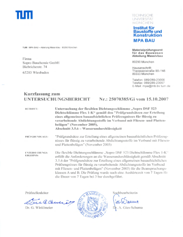 Tłumaczenie z j. niemieckiego TUM Uniwersytet Techniczny Monachium Instytut Materiałów Budowlanych i Konstrukcji MPA BAU TUM MPA BAU – Budowle masywne 80290 Monachium Urząd Kontroli Materiałów dla Budownictwa Dział Budowli Masywnych 80290 Monachium Adres do korespondencji: Theresienstrasse 90 / N6 80333 Monachium Tel.: +49 89/289-23000 Fax: +49 89/289-23057 e-mail: [email protected] Wersja skrócona Raport z badania Nr: 25070385/Gi z dnia 15.10.2007 Dotyczy: Badanie Zaprawy uszczelniającej elastycznej jednoskładnikowej Sopro DSF 523, zgodnie z zasadami kontroli do wydania świadectw, potwierdzających spełnianie ogólnych wymagań nadzoru budowlanego dla płynnych do przetworzonych materiałów uszczelniających Związku Glazurników (wydanych w listopadzie 2005) Rozdział 3.5.6 – Wodoszczelność Założenia badania: „Zasady kontroli do wydania świadectw, potwierdzających spełnianie ogólnych wymagań nadzoru budowlanego dla płynnych do przetworzonych materiałów uszczelniających Związku Glazurników” (wydane w listopadzie 2005) Wynik badania: Zaprawa uszczelniająca elastyczna jednoskładnikowa Sopro DSF 523 spełnia wymagania na wodoszczelność, zgodnie z rozdziałem 3.5.6 „Zasad kontroli do wydania świadectw, potwierdzających spełnianie ogólnych wymagań nadzoru budowlanego dla płynnych do przetworzonych materiałów uszczelniających Związku Glazurników” (wydanych w listopadzie 2005) dla klas obciążeń A i B. Kontrola została przeprowadzona po 7-dniowym czasie utwardzania i trwała przez 7 dni, przy ciśnieniu 3 bar. Kierownik Komórki Kontroli: Dr G. Winklmeier Tłumaczenie: Elżbieta Mirosz-Togonidze Pieczęć okrągła TUM Referent: Dr A.Gies-Schuma