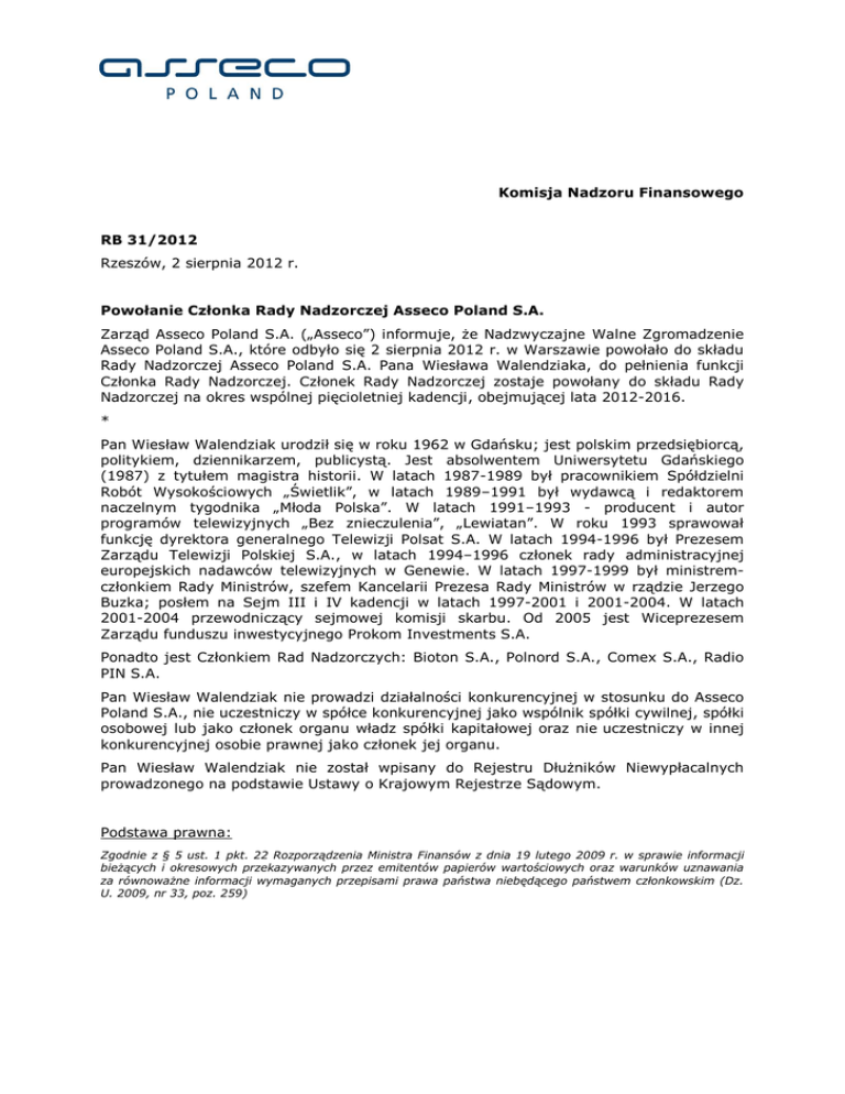 Komisja Nadzoru Finansowego RB 31/2012 Rzeszów, 2 sierpnia 2012 r. Powołanie Członka Rady Nadzorczej Asseco Poland S.A. Zarząd Asseco Poland S.A. („Asseco”) informuje, że Nadzwyczajne Walne Zgromadzenie Asseco Poland S.A., które odbyło się 2 sierpnia 2012 r. w Warszawie powołało do składu Rady Nadzorczej Asseco Poland S.A. Pana Wiesława Walendziaka, do pełnienia funkcji Członka Rady Nadzorczej. Członek Rady Nadzorczej zostaje powołany do składu Rady Nadzorczej na okres wspólnej pięcioletniej kadencji, obejmującej lata 2012-2016. * Pan Wiesław Walendziak urodził się w roku 1962 w Gdańsku; jest polskim przedsiębiorcą, politykiem, dziennikarzem, publicystą. Jest absolwentem Uniwersytetu Gdańskiego (1987) z tytułem magistra historii. W latach 1987-1989 był pracownikiem Spółdzielni Robót Wysokościowych „Świetlik”, w latach 1989–1991 był wydawcą i redaktorem naczelnym tygodnika „Młoda Polska”. W latach 1991–1993 - producent i autor programów telewizyjnych „Bez znieczulenia”, „Lewiatan”. W roku 1993 sprawował funkcję dyrektora generalnego Telewizji Polsat S.A. W latach 1994-1996 był Prezesem Zarządu Telewizji Polskiej S.A., w latach 1994–1996 członek rady administracyjnej europejskich nadawców telewizyjnych w Genewie. W latach 1997-1999 był ministremczłonkiem Rady Ministrów, szefem Kancelarii Prezesa Rady Ministrów w rządzie Jerzego Buzka; posłem na Sejm III i IV kadencji w latach 1997-2001 i 2001-2004. W latach 2001-2004 przewodniczący sejmowej komisji skarbu. Od 2005 jest Wiceprezesem Zarządu funduszu inwestycyjnego Prokom Investments S.A. Ponadto jest Członkiem Rad Nadzorczych: Bioton S.A., Polnord S.A., Comex S.A., Radio PIN S.A. Pan Wiesław Walendziak nie prowadzi działalności konkurencyjnej w stosunku do Asseco Poland S.A., nie uczestniczy w spółce konkurencyjnej jako wspólnik spółki cywilnej, spółki osobowej lub jako członek organu władz spółki kapitałowej oraz nie uczestniczy w innej konkurencyjnej osobie prawnej jako członek jej organu. Pan Wiesław Walendziak nie został wpisany do Rejestru Dłużników Niewypłacalnych prowadzonego na podstawie Ustawy o Krajowym Rejestrze Sądowym. Podstawa prawna: Zgodnie z § 5 ust. 1 pkt. 22 Rozporządzenia Ministra Finansów z dnia 19 lutego 2009 r. w sprawie informacji bieżących i okresowych przekazywanych przez emitentów papierów wartościowych oraz warunków uznawania za równoważne informacji wymaganych przepisami prawa państwa niebędącego państwem członkowskim (Dz. U. 2009, nr 33, poz. 259)