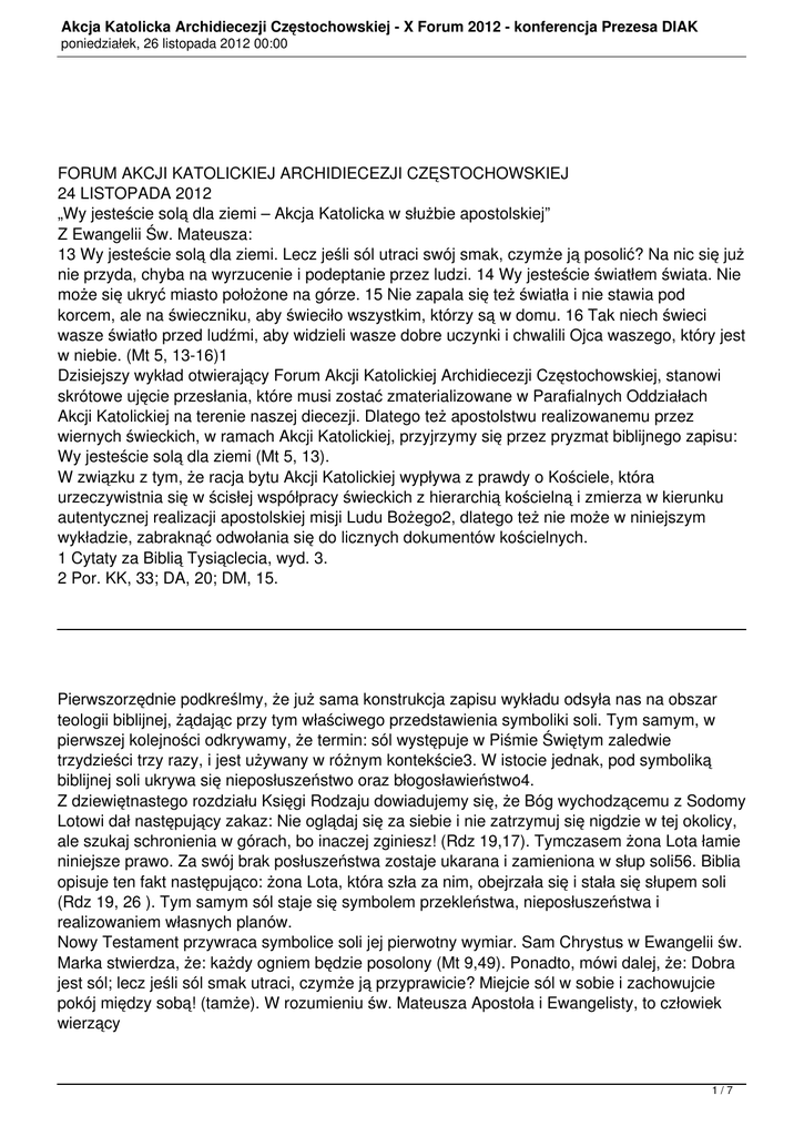 Akcja Katolicka Archidiecezji Częstochowskiej - X Forum 2012 - konferencja Prezesa DIAK poniedziałek, 26 listopada 2012 00:00 FORUM AKCJI KATOLICKIEJ ARCHIDIECEZJI CZĘSTOCHOWSKIEJ 24 LISTOPADA 2012 „Wy jesteście solą dla ziemi – Akcja Katolicka w służbie apostolskiej” Z Ewangelii Św. Mateusza: 13 Wy jesteście solą dla ziemi. Lecz jeśli sól utraci swój smak, czymże ją posolić? Na nic się już nie przyda, chyba na wyrzucenie i podeptanie przez ludzi. 14 Wy jesteście światłem świata. Nie może się ukryć miasto położone na górze. 15 Nie zapala się też światła i nie stawia pod korcem, ale na świeczniku, aby świeciło wszystkim, którzy są w domu. 16 Tak niech świeci wasze światło przed ludźmi, aby widzieli wasze dobre uczynki i chwalili Ojca waszego, który jest w niebie. (Mt 5, 13-16)1 Dzisiejszy wykład otwierający Forum Akcji Katolickiej Archidiecezji Częstochowskiej, stanowi skrótowe ujęcie przesłania, które musi zostać zmaterializowane w Parafialnych Oddziałach Akcji Katolickiej na terenie naszej diecezji. Dlatego też apostolstwu realizowanemu przez wiernych świeckich, w ramach Akcji Katolickiej, przyjrzymy się przez pryzmat biblijnego zapisu: Wy jesteście solą dla ziemi (Mt 5, 13). W związku z tym, że racja bytu Akcji Katolickiej wypływa z prawdy o Kościele, która urzeczywistnia się w ścisłej współpracy świeckich z hierarchią kościelną i zmierza w kierunku autentycznej realizacji apostolskiej misji Ludu Bożego2, dlatego też nie może w niniejszym wykładzie, zabraknąć odwołania się do licznych dokumentów kościelnych. 1 Cytaty za Biblią Tysiąclecia, wyd. 3. 2 Por. KK, 33; DA, 20; DM, 15. Pierwszorzędnie podkreślmy, że już sama konstrukcja zapisu wykładu odsyła nas na obszar teologii biblijnej, żądając przy tym właściwego przedstawienia symboliki soli. Tym samym, w pierwszej kolejności odkrywamy, że termin: sól występuje w Piśmie Świętym zaledwie trzydzieści trzy razy, i jest używany w różnym kontekście3. W istocie jednak, pod symboliką biblijnej soli ukrywa się nieposłuszeństwo oraz błogosławieństwo4. Z dziewiętnastego rozdziału Księgi Rodzaju dowiadujemy się, że Bóg wychodzącemu z Sodomy Lotowi dał następujący zakaz: Nie oglądaj się za siebie i nie zatrzymuj się nigdzie w tej okolicy, ale szukaj schronienia w górach, bo inaczej zginiesz! (Rdz 19,17). Tymczasem żona Lota łamie niniejsze prawo. Za swój brak posłuszeństwa zostaje ukarana i zamieniona w słup soli56. Biblia opisuje ten fakt następująco: żona Lota, która szła za nim, obejrzała się i stała się słupem soli (Rdz 19, 26 ). Tym samym sól staje się symbolem przekleństwa, nieposłuszeństwa i realizowaniem własnych planów. Nowy Testament przywraca symbolice soli jej pierwotny wymiar. Sam Chrystus w Ewangelii św. Marka stwierdza, że: każdy ogniem będzie posolony (Mt 9,49). Ponadto, mówi dalej, że: Dobra jest sól; lecz jeśli sól smak utraci, czymże ją przyprawicie? Miejcie sól w sobie i zachowujcie pokój między sobą! (tamże). W rozumieniu św. Mateusza Apostoła i Ewangelisty, to człowiek wierzący 1/7 Akcja Katolicka Archidiecezji Częstochowskiej - X Forum 2012 - konferencja Prezesa DIAK poniedziałek, 26 listopada 2012 00:00 3 Por. J. Flis, Konkordancja biblijna do Pisma Świętego Starego i Nowego testamentu Biblii Tysiąclecia, Warszawa 1996, s. 1324. 4 Por. P. Achtemeier, Encyklopedia biblijna, przekł. i oprac. merytoryczne P. Pachciarek, Warszawa 1999, s. 1131. 5 Por. Rdz 19, 26 6 12 Mężowie rzekli do Lota: „Kogokolwiek jeszcze masz w tym mieście, zięcia, synów i córki oraz wszystkich bliskich, wyprowadź stąd. 13 Mamy bowiem zamiar zniszczyć to miasto, ponieważ oskarżenie przeciw niemu do Pana tak się wzmogło, że Pan posłał nas, aby je zniszczyć”. 14 Wyszedł więc Lot, aby powiedzieć tym, którzy jako [przyszli] zięciowie mieli wziąć jego córki za żony: „Chodźcie, wyjdźcie z tego miasta, bo Pan ma je zniszczyć!” Oni jednak myśleli, że on żartuje. 15 Gdy już zaczynało świtać, aniołowie przynaglali Lota, mówiąc: „Prędzej, weź żonę i córki, które są przy tobie, abyś nie zginął z winy tego miasta”. 16 Kiedy zaś on zwlekał, mężowie ci chwycili go, jego żonę i dwie córki za ręce - Pan bowiem litował się nad nim - i wyciągnęli ich, i wyprowadzili poza miasto. 17 A gdy ich już wyprowadzili z miasta, rzekł jeden z nich: „Uchodź, abyś ocalił swe życie. Nie oglądaj się za siebie i nie zatrzymuj się nigdzie w tej okolicy, ale szukaj schronienia w górach, bo inaczej zginiesz!” (…) 23 Słońce wzeszło już nad ziemią, gdy Lot przybył do Soaru. 24 A wtedy Pan spuścił na Sodomę i Gomorę deszcz siarki i ognia od Pana „z nieba”. 25 I tak zniszczył te miasta oraz całą okolicę wraz ze wszystkimi mieszkańcami miast, a także roślinność. 26 Żona Lota, która szła za nim, obejrzała się i stała się słupem soli (Rdz 19, 12-17. 23-26 ). w Chrystusa musi być solą dla ziemi7. Tym samym, zwrot: sól dla ziemi (Mt 5,13), przynależy uczniowi Chrystusa, który w sposób wolny i świadomy bierze odpowiedzialność za Kościół i świat8. Niniejszą odpowiedzialność za Kościół i świat, w przypadku Akcji Katolickiej, jak i wszystkich świeckich członków Ludu Bożego, realizuje się na mocy sakramentu chrztu i bierzmowania9. Taka okoliczność wymusza dokładne poznanie problematyki Kościoła i świata. Na tym styku działają katolicy świeccy. Tym samym płaszczyzna styczna porządku boskiego i świeckiego przedstawiać się będzie jako bardzo newralgiczne miejsce, na obszarze którego występować będą liczne problemy10. Warto zatem przeprowadzić autentyczną analizę świata i jego problematyki. W niniejszej kwestii skupimy się na wypowiedzi Pawła VI, który podczas audiencji ogólnej, 12 lipca 1967 roku przedstawił posoborowy projekt wznoszenia pomostu łączącego Ko