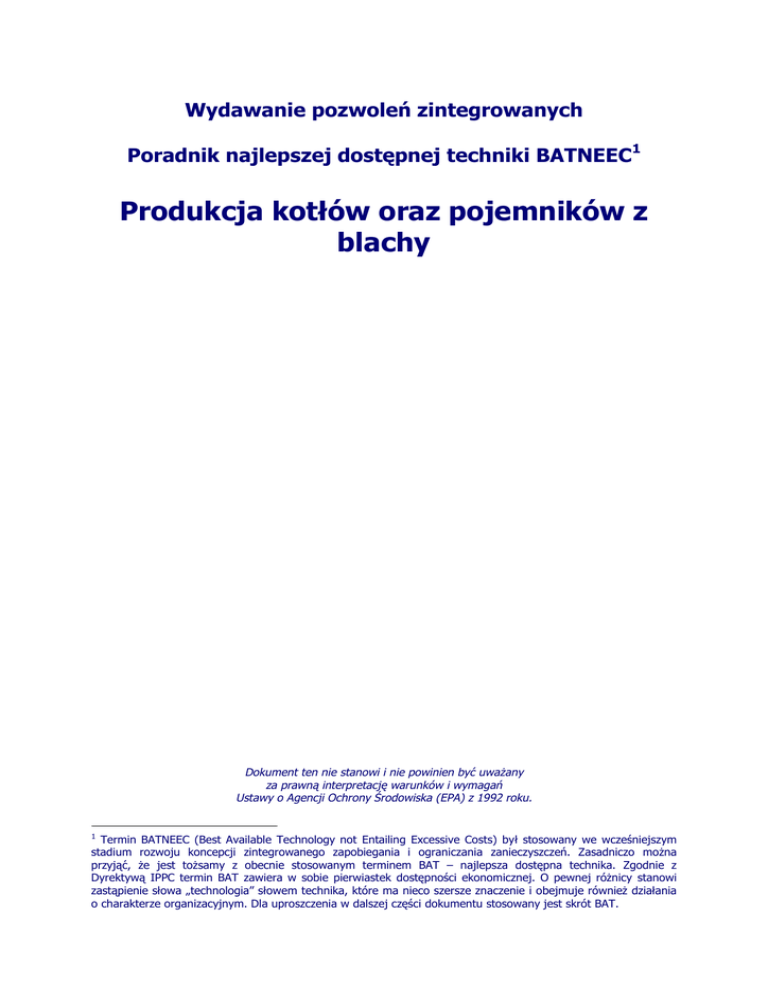 Wydawanie pozwoleń zintegrowanych Poradnik najlepszej dostępnej techniki BATNEEC1 Produkcja kotłów oraz pojemników z blachy Dokument ten nie stanowi i nie powinien być uważany za prawną interpretację warunków i wymagań Ustawy o Agencji Ochrony Środowiska (EPA) z 1992 roku. 1 Termin BATNEEC (Best Available Technology not Entailing Excessive Costs) był stosowany we wcześniejszym stadium rozwoju koncepcji zintegrowanego zapobiegania i ograniczania zanieczyszczeń. Zasadniczo można przyjąć, że jest tożsamy z obecnie stosowanym terminem BAT – najlepsza dostępna technika. Zgodnie z Dyrektywą IPPC termin BAT zawiera w sobie pierwiastek dostępności ekonomicznej. O pewnej różnicy stanowi zastąpienie słowa „technologia” słowem technika, które ma nieco szersze znaczenie i obejmuje również działania o charakterze organizacyjnym. Dla uproszczenia w dalszej części dokumentu stosowany jest skrót BAT. Environmental Protection Agency (EPA) (Agencja Ochrony Środowiska) POWOŁANIE Ustawa o Agencji Ochrony Środowiska (EPA) z 1992 roku została uchwalona 23 kwietnia 1992. Na mocy jej przepisów dnia 26 lipca 1993 roku powołano Agencję. ZADANIA Agencja posiada szereg statutowych obowiązków i uprawnień wynikających z Ustawy. Główne obowiązki Agencji obejmują: • wydawanie pozwoleń dla złożonych procesów przemysłowych i innych potencjalnie powodujących znaczne zanieczyszczenia, opartych na zintegrowanej kontroli zanieczyszczeń (IPC) i zastosowaniu w tym celu najlepszej dostępnej technologii; • monitorowanie jakości środowiska, w tym prowadzenie baz danych dostępnych dla społeczeństwa, oraz publikację okresowych raportów o stanie środowiska; • doradzanie władzom publicznym w zakresie zagadnień ochrony środowiska oraz wspomaganie władz lokalnych w realizacji ich zadań w tym zakresie; • promowanie praktyk przyjaznych środowisku poprzez, na przykład, zachęcanie do stosowania audytów środowiskowych, wprowadzanie programu eko-etykietowania produktów, określanie standardów jakości środowiska oraz wydawanie wytycznych dotyczących oddziaływania na środowisko; • promowanie i koordynowanie badań środowiskowych; • wydawanie pozwoleń i regulowanie gospodarki odpadami, w tym składowiska odpadów, oraz przygotowywanie i okresowe uaktualnianie krajowego programu gospodarki odpadami niebezpiecznymi wykorzystywanego przez inne podmioty; oraz • ogólny nadzór nad realizacją przez władze lokalne ustawowych funkcji ochrony środowiska. STATUS Agencja jest niezależnym organem publicznym. Jest finansowana przez Departament Środowiska2. Niezależność Agencji zapewniona jest poprzez procedury wyboru dyrektora generalnego i pozostałych dyrektorów oraz przez określoną w przepisach swobodę podejmowania działań z własnej inicjatywy. Określona w ustawie, bezpośrednia odpowiedzialność za szereg funkcji podkreśla jeszcze tą niezależność. Zgodnie z literą prawa, wszelkie próby wpływania w niewłaściwy sposób na Agencję lub osoby działające w jej imieniu traktowane są jako wykroczenie. ORGANIZACJA Centrala Agencji mieści się w Wexford. Agencja działa poprzez pięć regionalnych inspektoratów z siedzibami w: Dublinie, Cork, Kilkenny, Castlebar i Monaghan. ZARZĄDZANIE Działaniami Agencji kieruje pełnoetatowy zarząd składający się z dyrektora generalnego i czterech dyrektorów. Członkowie zarządu mianowani są przez Radę Ministrów, zgodnie ze szczegółowymi procedurami opisanymi w Ustawie. KOMITET DORADCZY Działania Agencji wspiera Komitet Doradczy składający się z dwunastu członków. Członkowie mianowani są przez Ministra Środowiska, zaś wybierani są głównie spośród kandydatów wysuniętych przez organizacje zaangażowane w kwestie środowiska i rozwoju. Ustawa nakłada na Komitet szereg funkcji doradczych, zarówno w odniesieniu do Agencji, jak i właściwego ministra. PODZIĘKOWANIA Agencja Ochrony Środowiska pragnie podziękować Environmental Services Group3, Forbairt która przygotowała wstępny projekt niniejszych wytycznych BATNEEC. 2 3 Irlandzki odpowiednik Ministerstwa Środowiska Environmental Services Group Agencja kieruje również podziękowania do: - Komitetu Doradczego AOŚ - Ministerstwa Środowiska4 - Irlandzkiego Stowarzyszenia Pracodawców i Biznesu5 za konsultacje podczas przygotowywania wstępnego projektu. 4 5 Department of the Environment Irish Business and Employers Confederation Spis treści 1. 2. 3. 4. Wstęp Interpretacja terminu najlepszej dostępnej techniki Omawiany sektor Technologie kontroli 4.1 Wstęp 4.2 Sposoby ograniczania ładunku zanieczyszczeń 4.3 Zapobieganie emisjom 4.4 Technologie odzysku i recyklingu 4.5 Szczegółowe technologie ograniczania emisji do atmosfery 4.6 Szczegółowe technologie usuwania i postępowania z odpadami 5. Wartości graniczne emisji 5.1 Umowne warunki odniesienia 5.2 Interpretacja zgodności z normami 5.3 Emisje do atmosfery 5.4 Emisje do wód 6. Monitoring zgodności z wymaganiami prawa 6.1 Emisje do atmosfery 6.2 Odpady stałe Załącznik 1. Źródła i emisje 1. Wstęp 2. Źródła emisji do atmosfery 3. Źródła emisji do wód 4. Źródła powstawania odpadów Załącznik 2. Bibliografia Załącznik 3. Publikacje IPC 1. WSTĘP Niniejszy poradnik jest jednym z serii poradników wydawanych przez Agencję Ochrony Środowiska Irlandii , a jego celem jest przekazanie wskazówek podmiotom ubiegającym się o uzyskanie pozwoleń zintegrowanych zgodnie z przepisami Ustawy o Agencji Ochrony Środowiska (EPA). Dodatkowo należy zapoznać się z wytycznymi dotyczącymi wypełniania wniosku6 . Na początku należy zaznaczyć, iż dokument ten nie obejmuje zagadnienia hałasu, a wytyczne dotyczące tego zagadnienia zostały opublikowane osobno. Niniejszy poradnik składa się z sześciu rozdziałów i trzech załączników. Następujący po niniejszym wstępie rozdział 2 zawiera ogólne informacje odnośnie interpretacji