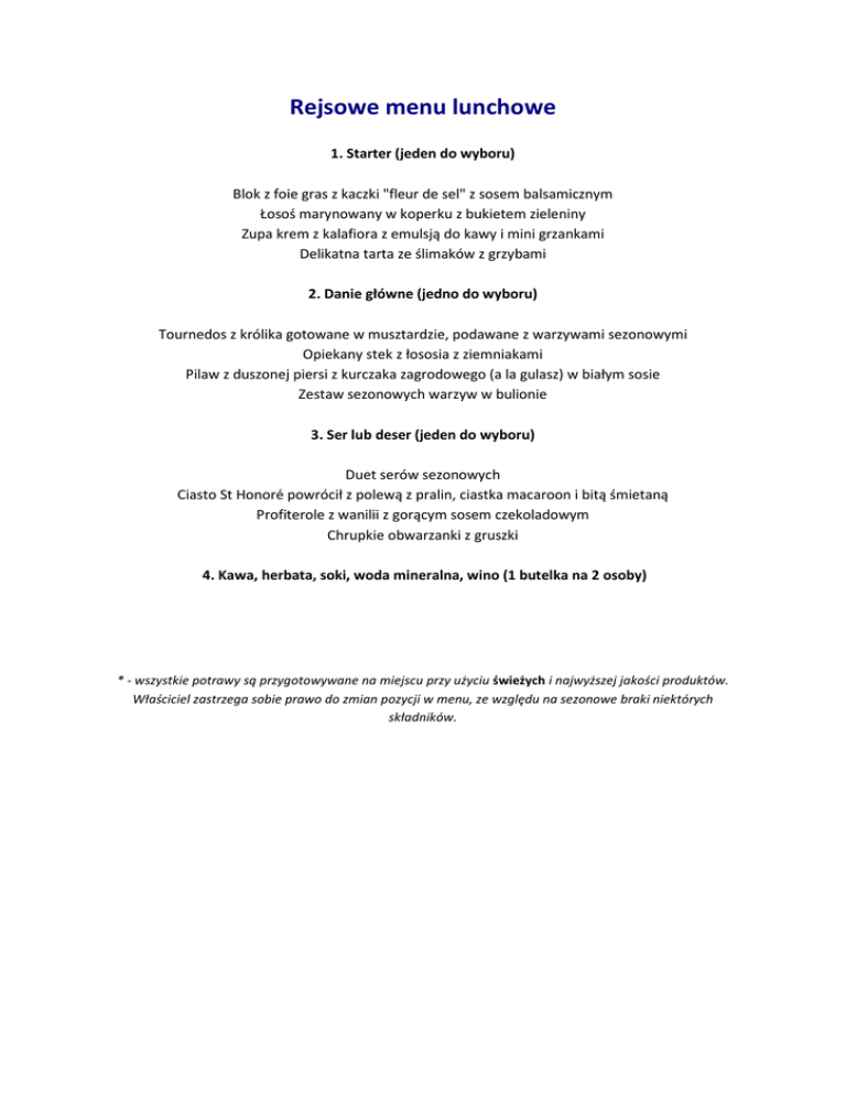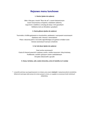 Rejsowe menu lunchowe 1. Starter (jeden do wyboru) Blok z foie gras z kaczki "fleur de sel" z sosem balsamicznym Łosoś marynowany w koperku z bukietem zieleniny Zupa krem z kalafiora z emulsją do kawy i mini grzankami Delikatna tarta ze ślimaków z grzybami 2. Danie główne (jedno do wyboru) Tournedos z królika gotowane w musztardzie, podawane z warzywami sezonowymi Opiekany stek z łososia z ziemniakami Pilaw z duszonej piersi z kurczaka zagrodowego (a la gulasz) w białym sosie Zestaw sezonowych warzyw w bulionie 3. Ser lub deser (jeden do wyboru) Duet serów sezonowych Ciasto St Honoré powrócił z polewą z pralin, ciastka macaroon i bitą śmietaną Profiterole z wanilii z gorącym sosem czekoladowym Chrupkie obwarzanki z gruszki 4. Kawa, herbata, soki, woda mineralna, wino (1 butelka na 2 osoby) * - wszystkie potrawy są przygotowywane na miejscu przy użyciu świeżych i najwyższej jakości produktów. Właściciel zastrzega sobie prawo do zmian pozycji w menu, ze względu na sezonowe braki niektórych składników.