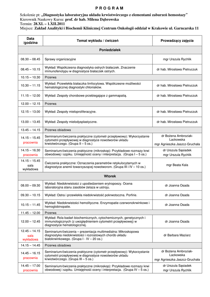 PROGRAM Szkolenie pt: „Diagnostyka laboratoryjna układu krwiotwórczego z elementami zaburzeń hemostazy” Kierownik Naukowy Kursu: prof. dr hab. Milena Dąbrowska Termin: 28.XI. – 1.XII.2011 Miejsce: Zakład Analityki i Biochemii Klinicznej Centrum Onkologii oddział w Krakowie ul. Garncarska 11 Data /godzina Temat wykładu / ćwiczeń Prowadzący zajęcia Poniedziałek 08.30 – 08.45 Sprawy organizacyjne mgr Urszula Rychlik 08.45 – 10.15 Wykład: Współczesna diagnostyka ostrych białaczek. Znaczenie immunofenotypu w diagnostyce białaczek ostrych. 10.15 – 10.30 Przerwa 10.30 – 11.15 Wykład: Przewlekła białaczka limfocytowa. Współczesne możliwości hematologicznej diagnostyki chłoniaków. dr hab. Mirosława Pietruczuk 11.15 – 12.00 Wykład: Zespoły chorobowe przebiegające z gammapatią. dr hab. Mirosława Pietruczuk 12.00 – 12.15 Przerwa 12.15 – 13.00 Wykład: Zespoły mieloproliferacyjne. dr hab. Mirosława Pietruczuk 13.00 – 13.45 Wykład: Zespoły mielodysplastyczne. dr hab. Mirosława Pietruczuk 13.45 – 14.15 Przerwa obiadowa 14.15 – 15.45 pracownia Seminarium/ćwiczenia praktyczne (cytometr przepływowy): Wykorzystanie cytometrii przepływowej w diagnostyce nowotworów ukladu krwiotwórczego. (Grupa II – 5 os.) dr Bożena AmbroziakLackowska mgr Agnieszka Jaszcz-Gruchała 14.15 – 16.30 pracownia Seminarium/ćwiczenia praktyczne (mikroskop): Przykładowe rozmazy krwi obwodowej i szpiku. Umiejętność oceny i interpretacja. (Grupa I – 5 os.) dr Urszula Sąsiadek mgr Urszula Rychlik 14.15 – 15.45 sala wykładowa Ćwiczenia praktyczne: Oznaczenia parametrów retykulocytarnych w diagnostyce anemii towarzyszącej nowotworom. (Grupa III i IV – 10 os.) dr hab. Mirosława Pietruczuk mgr Beata Kala Wtorek 08.00 – 09.30 Wykład: Niedokrwistości z upośledzeniem erytropoezy. Ocena laboratoryjna stanu zasobów żelaza w ustroju. dr Joanna Osada 09.30 – 10.15 Wykład: Ostra i przewlekła niedokrwistość pokrwotoczna. Porfirie. dr Joanna Osada 10.15 – 11.45 Wykład: Niedokrwistości hemolityczne. Enzymopatie czerwonokrwinkowe i hemoglobinopatie. dr Joanna Osada 11.45 – 12.00 Przerwa 12.00 – 12.45 Wykład: Rola badań biochemicznych, cytochemicznych, genetycznych i immunologicznych (z uwzględnieniem cytometrii przepływowej) w diagnostyce hematologicznej. 12.45 – 14.15 sala wykładowa Seminarium/ćwiczenia – prezentacja multimedialna: Mikroskopowa diagnostyka niedokrwistości i rozrostowych chorób układu białokrwinkowego. (Grupa I - IV – 20 os.) 14.15 – 14.45 Przerwa obiadowa 14.45 – 16.15 pracownia Seminarium/ćwiczenia praktyczne (cytometr przepływowy): Wykorzystanie cytometrii przepływowej w diagnostyce nowotworów ukladu krwiotwórczego. (Grupa III – 5 os.) dr Bożena AmbroziakLackowska mgr Agnieszka Jaszcz-Gruchała 14.45 – 17.00 pracownia Seminarium/ćwiczenia praktyczne (mikroskop): Przykładowe rozmazy krwi obwodowej i szpiku. Umiejętność oceny i interpretacja. (Grupa IV – 5 os.) dr Urszula Sąsiadek mgr Urszula Rychlik dr Joanna Osada dr Barbara Maziarz 14.45 – 16.15 sala wykładowa Seminarium/ćwiczenia praktyczne: Oznaczenia parametrów retykulocytarnych w diagnostyce anemii towarzyszącej nowotworom. (Grupa I i II – 10 os.) mgr Beata Kala Środa 08.00 – 09.30 Wykład: Niedokrwistość chorób przewlekłych. mgr Urszula Rychlik 09.30 – 11.00 Seminarium: Wykorzystanie anlizatorów hematologicznych w praktyce, techniki pomiarowe. 11.00 – 11.15 Przerwa 11.15 – 12.00 Seminarium: Automatyzacja badań hematologicznych – zagadnienia interpretacji wyników morfologii krwi mgr Beata Kala 12.00 – 13.30 sala wykładowa Wykład: Zasady kontroli jakości analitycznej w hematologii. dr Eliza Sobuta 13.30 – 14.00 Przerwa obiadowa 14.00 – 15.30 pracownia Ćwiczenia praktyczne (cytometr przepływowy): Wykorzystanie cytometrii przepływowej w diagnostyce nowotworów ukladu krwiotwórczego. (Grupa I – 5 os.) 14.00 – 16.15 pracownia Ćwiczenia praktyczne (mikroskop): Przykładowe rozmazy krwi obwodowej i szpiku. Umiejętność oceny i interpretacja. (Grupa II – 5 os.) lek. med. Aleksander Mazur dr Bożena Ambroziak-Lackowska mgr Agnieszka Jaszcz-Gruchała dr Urszula Sąsiadek mgr Urszula Rychlik Czwartek 08.00 – 08.30 Prezentacja firm diagnostycznych 08.30 – 10.00 Wykład: Mechanizmy krzepnięcia i fibrynolizy. Metody pomiarowe w badaniach układu krzepnięcia i fibrynolizy. prof. dr hab. Milena Dąbrowska 10.00 – 11.30 Wykład: Diagnostyka wrodzonych i nabytych zaburzeń krzepnięcia. Diagnostyka złożonych skaz krwotocznych. Diagnostyka trombofilii. prof. dr hab. Milena Dąbrowska 11.30 – 11.45 Przerwa 11.45 – 12.30 Wykład: Monitorowanie leczenia antykoagulantami. Zaburzenia układu hemostazy jako czynnik ryzyka miażdżycy. 12.30 – 13.00 Test., omówienie wyników, wypełnienie ankiety oceniającej 13.00 – 13.30 Przerwa obiadowa 13.30 – 15.00 pracownia Seminarium/ćwiczenia praktyczne (cytometr przepływowy): Wykorzystanie cytometrii przepływowej w diagnostyce nowotworów ukladu krwiotwórczego. (Grupa IV – 5 os.) 13.30 – 15.45 pracownia Seminarium/ćwiczenia praktyczne (mikroskop): Przykładowe rozmazy krwi obwodowej i szpiku. Umiejętność oceny i interpretacja. (Grupa III – 5 os.) prof. dr hab. Milena Dąbrowska mgr Urszula Rychlik dr Bożena Ambroziak-Lackowska mgr Agnieszka Jaszcz-Gruchała dr Urszula Sąsiadek mgr Urszula Rychlik