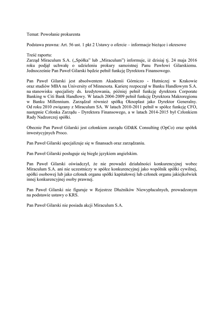 Temat: Powołanie prokurenta Podstawa prawna: Art. 56 ust. 1 pkt 2 Ustawy o ofercie – informacje bieżące i okresowe Treść raportu: Zarząd Miraculum S.A. („Spółka” lub „Miraculum”) informuje, iż dzisiaj tj. 24 maja 2016 roku podjął uchwałę o udzieleniu prokury samoistnej Panu Pawłowi Gilarskiemu. Jednocześnie Pan Paweł Gilarski będzie pełnił funkcję Dyrektora Finansowego. Pan Paweł Gilarski jest absolwentem Akademii Górniczo - Hutniczej w Krakowie oraz studiów MBA na University of Minnesota. Karierę rozpoczął w Banku Handlowym S.A. na stanowisku specjalisty ds. kredytowania, później pełnił funkcję dyrektora Corporate Banking w Citi Bank Handlowy. W latach 2004-2009 pełnił funkcję Dyrektora Makroregionu w Banku Millennium. Zarządzał również spółką Oknoplast jako Dyrektor Generalny. Od roku 2010 związany z Miraculum SA. W latach 2010-2011 pełnił w spółce funkcję CFO, następnie Członka Zarządu - Dyrektora Finansowego, a w latach 2014-2015 był Członkiem Rady Nadzorczej spółki. Obecnie Pan Paweł Gilarski jest członkiem zarządu GD&K Consulting (OpCo) oraz spółek inwestycyjnych Proco. Pan Paweł Gilarski specjalizuje się w finansach oraz zarządzaniu. Pan Paweł Gilarski posługuje się biegle językiem angielskim. Pan Paweł Gilarski oświadczył, że nie prowadzi działalności konkurencyjnej wobec Miraculum S.A. ani nie uczestniczy w spółce konkurencyjnej jako wspólnik spółki cywilnej, spółki osobowej lub jako członek organu spółki kapitałowej lub członek organu jakiejkolwiek innej konkurencyjnej osoby prawnej. Pan Paweł Gilarski nie figuruje w Rejestrze Dłużników Niewypłacalnych, prowadzonym na podstawie ustawy o KRS. Pan Paweł Gilarski nie posiada akcji Miraculum S.A.