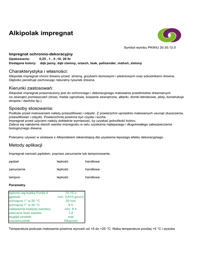 Alkipolak impregnat Symbol wyrobu PKWiU 20.30.12.0 Impregnat ochronno-dekoracyjny Opakowania: 0,25 , 1 , 5 ,10, 20 ltr Dostępne kolory: dąb jasny, dąb ciemny, orzech, teak, palisander, mahoń, zielony Charakterystyka i własności: Alkipolak impregnat chroni drewno przed: sinizną, grzybami domowymi i pleśniowymi oraz szkodnikami drewna. Głęboko penetruje zachowując naturalny rysunek drewna. Kierunki zastosowań: Alkipolak impregnat przeznaczony jest do ochronnego i dekoracyjnego malowania przedmiotów drewnianych na zewnątrz pomieszczeń (drzwi, meble ogrodowe, boazerie zewnętrzne, altanki, domki letniskowe, płoty, konstrukcje stropów i dachów itp.). Sposoby stosowania: Podłoże przed malowaniem należy przeszlifować i odpylić. Z powierzchni uprzednio malowanych usunąć złuszczenia, przeszlifować i odpylić. Powierzchnia powinna być czysta i sucha. Impregnat przed użyciem należy dokładnie wymieszać, by uzyskać jednolitość koloru. Zaleca się nałożenie dwóch warstw impregnatu w celu uzyskania najlepszego i długotrwałego zabezpieczenia biologicznego drewna. Polecamy używać w zestawie z Alkipolakiem lakierobejcą dla uzyskania lepszego efektu dekoracyjnego. Metody aplikacji Impregnat nanosić pędzlem, poprzez zanurzanie lub tamponowanie. pędzel lepkość handlowa zanurzenie lepkość handlowa tampon lepkość handlowa Parametry lepkość wg kubka Forda 4 gęstość schnięcie 1° w 20 °C schnięcie 7° w 20 °C nakładanie kolejnej warstwy zalecana ilość warstw wygląd powłoki rozcieńczalnik 10-15 s min. 0,810 g/cm3 20 min 8h min. 8 h 1-2 mat Alkiposol Temperatura podczas malowania powinna wynosić od +5 do +25 °C. Niska temperatura poniżej +5 °C i wysoka wilgotność powietrza wydłużają czas schnięcia powłoki. Przy malowaniu drewna zażywiczonego czas schnięcia ulega wydłużeniu. Wydajność teoretyczna produktu wynosi do 10 m2/ltr na jedną warstwę w zależności od chłonności podłoża. Gwarancja: 12 miesięcy od daty produkcji. Zalecenia bhp i p.poż. Wyrób zawiera szkodliwe substancje lotne – stosować w pomieszczeniach o sprawnej wentylacji lub przewietrzanych. Chronić przed dziećmi, jak każdy wyrób z rozpuszczalnikami. Wyrób palny. Przechowywać z dala od źródeł ciepła i ognia.Pomieszczenia przeznaczone do przechowywania żywności i na stały pobyt ludzi, wietrzyć do zaniku specyficznego zapachu. Środki gaśnicze: proszki i piany gaśnicze, nie stosować do gaszenia wody w pełnym strumieniu. YUMACOM Zbigniew Kreczko jest gwarantem właściwej jakości produktu, pozostaje jednak bez wpływu na sposób i warunki jego stosowania. Informacje zawarte w karcie mają na celu zapewnienie optymalnego wykorzystania produktu, jednak nie są podstawą do odpowiedzialności prawnej producenta, gdyż warunki wykonawstwa pozostają poza jego kontrolą. Wszelka ingerencja w skład produktu jest niedopuszczalna i może w znaczny sposób obniżyć jakość produktu. W przypadku połączenia z wyrobami z innych firm producent nie ponosi żadnej odpowiedzialności za powstałe wady i szkody. Przedstawione powyżej informacje podane zostały w dobrej wierze, wg aktualnego stanu naszej wiedzy i doświadczenia praktycznego. Yumacom zastrzega sobie prawo do zmiany treści w kolejnych edycjach karty technicznej bez wcześniejszego informowania o tym fakcie odbiorców. Producent zastrzega sobie również pełne prawo do modyfikacji swoich produktów w ramach ich rozwoju technologicznego. Prosimy o weryfikację produktu pod kątem Państwa konkretnych zastosowań. Producent specjalistycznych farb i lakierów: YUMACOM Zbigniew Kreczko 43-440 Goleszów, ul. Przemysłowa 1A tel/fax +48 33 8513 425 tel. kom. +48 515 286 509