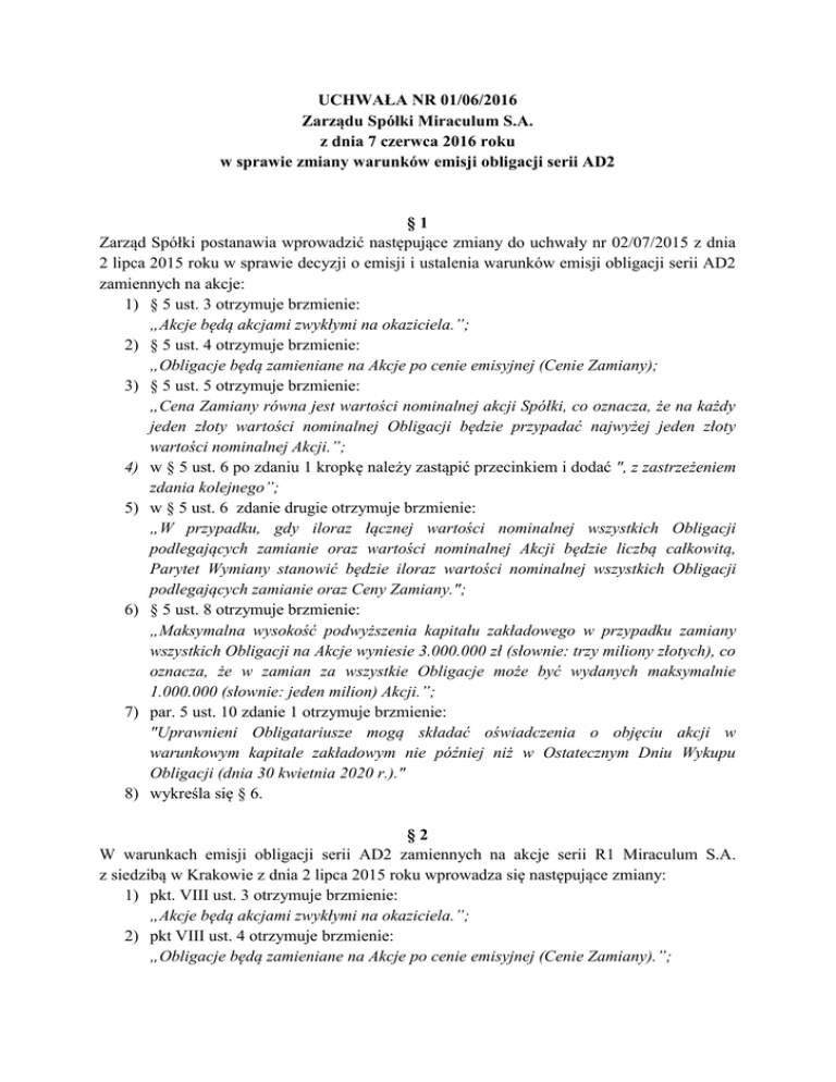 UCHWAŁA NR 01/06/2016 Zarządu Spółki Miraculum S.A. z dnia 7 czerwca 2016 roku w sprawie zmiany warunków emisji obligacji serii AD2 §1 Zarząd Spółki postanawia wprowadzić następujące zmiany do uchwały nr 02/07/2015 z dnia 2 lipca 2015 roku w sprawie decyzji o emisji i ustalenia warunków emisji obligacji serii AD2 zamiennych na akcje: 1) § 5 ust. 3 otrzymuje brzmienie: „Akcje będą akcjami zwykłymi na okaziciela.”; 2) § 5 ust. 4 otrzymuje brzmienie: „Obligacje będą zamieniane na Akcje po cenie emisyjnej (Cenie Zamiany); 3) § 5 ust. 5 otrzymuje brzmienie: „Cena Zamiany równa jest wartości nominalnej akcji Spółki, co oznacza, że na każdy jeden złoty wartości nominalnej Obligacji będzie przypadać najwyżej jeden złoty wartości nominalnej Akcji.”; 4) w § 5 ust. 6 po zdaniu 1 kropkę należy zastąpić przecinkiem i dodać ", z zastrzeżeniem zdania kolejnego”; 5) w § 5 ust. 6 zdanie drugie otrzymuje brzmienie: „W przypadku, gdy iloraz łącznej wartości nominalnej wszystkich Obligacji podlegających zamianie oraz wartości nominalnej Akcji będzie liczbą całkowitą, Parytet Wymiany stanowić będzie iloraz wartości nominalnej wszystkich Obligacji podlegających zamianie oraz Ceny Zamiany."; 6) § 5 ust. 8 otrzymuje brzmienie: „Maksymalna wysokość podwyższenia kapitału zakładowego w przypadku zamiany wszystkich Obligacji na Akcje wyniesie 3.000.000 zł (słownie: trzy miliony złotych), co oznacza, że w zamian za wszystkie Obligacje może być wydanych maksymalnie 1.000.000 (słownie: jeden milion) Akcji.”; 7) par. 5 ust. 10 zdanie 1 otrzymuje brzmienie: "Uprawnieni Obligatariusze mogą składać oświadczenia o objęciu akcji w warunkowym kapitale zakładowym nie później niż w Ostatecznym Dniu Wykupu Obligacji (dnia 30 kwietnia 2020 r.)." 8) wykreśla się § 6. §2 W warunkach emisji obligacji serii AD2 zamiennych na akcje serii R1 Miraculum S.A. z siedzibą w Krakowie z dnia 2 lipca 2015 roku wprowadza się następujące zmiany: 1) pkt. VIII ust. 3 otrzymuje brzmienie: „Akcje będą akcjami zwykłymi na okaziciela.”; 2) pkt VIII ust. 4 otrzymuje brzmienie: „Obligacje będą zamieniane na Akcje po cenie emisyjnej (Cenie Zamiany).”; 9) w pkt VIII ust. 6 po zdaniu 1 kropkę należy zastąpić przecinkiem i dodać ", z zastrzeżeniem zdania kolejnego”; 10) w pkt. VIII ust. 6 zdanie drugie otrzymuje brzmienie: „W przypadku, gdy iloraz łącznej wartości nominalnej wszystkich Obligacji podlegających zamianie oraz wartości nominalnej Akcji będzie liczbą całkowitą, Parytet Wymiany stanowić będzie iloraz wartości nominalnej wszystkich Obligacji podlegających zamianie oraz Ceny Zamiany."; 3) pkt VIII ust. 8 otrzymuje brzmienie: „Maksymalna wysokość podwyższenia kapitału zakładowego w przypadku zamiany wszystkich Obligacji na Akcje wyniesie 3.000.000 zł (słownie: trzy miliony złotych), co oznacza, że w zamian za wszystkie Obligacje może być wydanych maksymalnie 1.000.000 (słownie: jeden milion) Akcji.”; 4) pkt VIII ust. 10 zdanie 1 powinno otrzymać brzmienie: "Uprawnieni Obligatariusze mogą składać oświadczenia o objęciu akcji w warunkowym kapitale zakładowym nie później niż w Ostatecznym Dniu Wykupu Obligacji (dnia 30 kwietnia 2020 r.)." 5) w pkt. IX wykreśla się ust. 3 i 4. §3 Formularz zamiany Obligacji na Akcje otrzymuje brzmienie jak w załączniku do niniejszej uchwały. §4 Uchwała wchodzi w życie z dniem podjęcia.