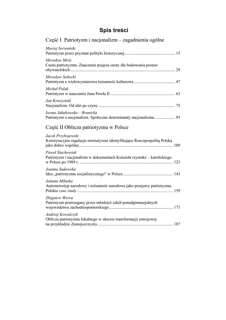 Spis treści 3 Spis treści Część I Patriotyzm i nacjonalizm – zagadnienia ogólne Maciej Serwański Patriotyzm przez pryzmat polityki historycznej ................................................ 15 Mirosław Mróz Cnota patriotyzmu. Znaczenie pojęcia cnoty dla budowania postaw obywatelskich .................................................................................................... 29 Mirosław Sobecki Patriotyzm a wielowymiarowa toŜsamość kulturowa ....................................... 47 Michał Polak Patriotyzm w nauczaniu Jana Pawła II .............................................................. 63 Jan Kruszyński Nacjonalizm. Od idei po czyny ......................................................................... 75 Iwona Jakubowska – Branicka Patriotyzm a nacjonalizm. Społeczne determinanty nacjonalizmu ................... 93 Część II Oblicza patriotyzmu w Polsce Jacek Przybojewski Konstytucyjne regulacje normatywne identyfikujące Rzeczpospolitą Polską jako dobro wspólne.......................................................................................... 109 Paweł Stachowiak Patriotyzm i nacjonalizm w dokumentach Kościoła rzymsko – katolickiego w Polsce po 1989 r. ......................................................................................... 123 Joanna Sadowska Idea „patriotyzmu socjalistycznego” w Polsce ................................................ 143 Jolanta Miluska Autostereotyp narodowy i toŜsamość narodowa jako przejawy patriotyzmu. Polskie case study ............................................................................................ 159 Zbigniew Werra Patriotyzm postrzegany przez młodzieŜ szkół ponadgimnazjalnych województwa zachodniopomorskiego ............................................................. 171 Andrzej Kowalczyk Oblicza patriotyzmu lokalnego w okresie transformacji ustrojowej na przykładzie Zamojszczyzny ........................................................................ 187 4 Spis treści Część III Przejawy patriotyzmu na świecie Jacek Krzysztof Danel Szarpać sumienie Zachodu.... Wartości i patriotyzm Drugiej Wielkiej Emigracji 1945 – 1990 .................................................................................... 201 ElŜbieta Lesiewicz RozwaŜania o toŜsamości i patriotyzmie Europejczyków............................... 217 Tadeusz Miluski Historyczne i społeczno – polityczne uwarunkowania toŜsamości narodowej, patriotyzmu i nacjonalizmu na Litwie, Łotwie i w Estonii ............................. 229 Karolina Podgórska Patriotyzm francuski w aspekcie róŜnorodności etnicznej i religijnej współczesnej Francji ....................................................................................... 243 Anna Popielarczyk – Pałęga Współczesne rozumienie pojęcia patriotyzm w środowiskach polonijnych na przykładzie powojennej Argentyny ............................................................ 255 Iwona H. Pugacewicz Przejawy postaw patriotycznych paryskich licealistów pochodzenia polskiego na przykładzie sekcji polskiej w Liceum Montaigne ...................................... 269 Julia Sałacińska „Ojczyzna” i „Родина” w narracjach biograficznych repatriantów z Kazachstanu. Analiza porównawcza słów – kluczy ..................................... 287 Część IV Edukacja i wychowanie patriotyczne Marian Kopczewski Świadomość patriotyczno – obronna i jej kształtowanie ................................. 305 Bogusław Polak Wychowanie patriotyczne w Polsce po przełomie 1989 r. – oczekiwania i stan rzeczywisty ............................................................................................ 317 Dorota Misiejuk Patriotyzm w przekazie międzypokoleniowym. Analiza problemu na podstawie analizy przypadków ................................................................... 329 Ewa Pogorzała Koncepcja kształcenia uczniów z grup mniejszości narodowych i etnicznych w Polsce w kontekście pojęć „patriotyzm” i „nacjonalizm” ....... 341 Spis treści 5 Przemysław Adamczewski Propaganda historyczna jako narzędzie edukacji patriotycznej ...................... 359 Beata Stachowiak www.patriotyzm- w-sieci.pl ............................................................................ 379 Część V Nacjonalizm jako zjawisko społeczno – historyczne Ireneusz Koepke „Słowiańskość” i nacjonalizm ......................................................................... 391 Czesław Partacz Cztery destrukcyjne nurty europejskiego nacjonalizmu .................................. 407 Mateusz Piskorski Pojęcie narodu w myśli Jana Stachniuka i miesięcznika „Zadruga” ............... 423 Waldemar Popioł Działania terrorystów islamskich jako skutek oddziaływania islamskiego fundamentalizmu religijnego i muzułmańskiego nacjonalizmu ...................... 435 Barbara Kalinowska Rola negatywnego stereotypu w utrwalaniu wzajemnych uprzedzeń na przykładzie stosunków polsko – niemieckich............................................. 451