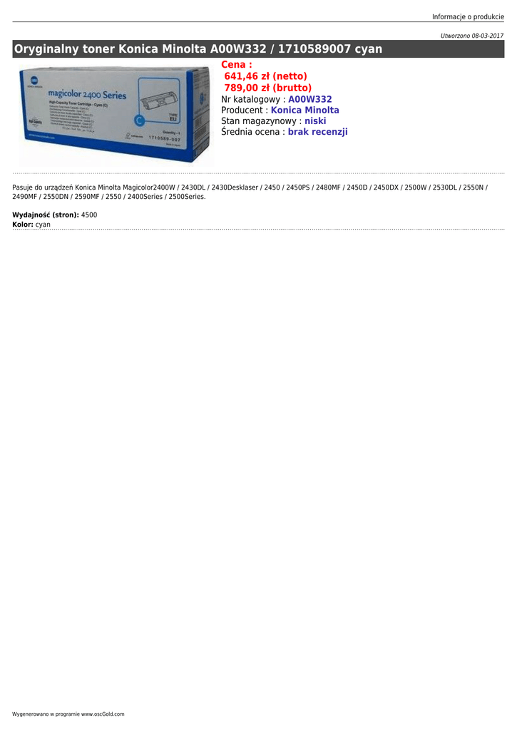 Informacje o produkcie Utworzono 08-03-2017 Oryginalny toner Konica Minolta A00W332 / 1710589007 cyan Cena : 641,46 zł (netto) 789,00 zł (brutto) Nr katalogowy : A00W332 Producent : Konica Minolta Stan magazynowy : niski Średnia ocena : brak recenzji Pasuje do urządzeń Konica Minolta Magicolor2400W / 2430DL / 2430Desklaser / 2450 / 2450PS / 2480MF / 2450D / 2450DX / 2500W / 2530DL / 2550N / 2490MF / 2550DN / 2590MF / 2550 / 2400Series / 2500Series. Wydajność (stron): 4500 Kolor: cyan Wygenerowano w programie www.oscGold.com